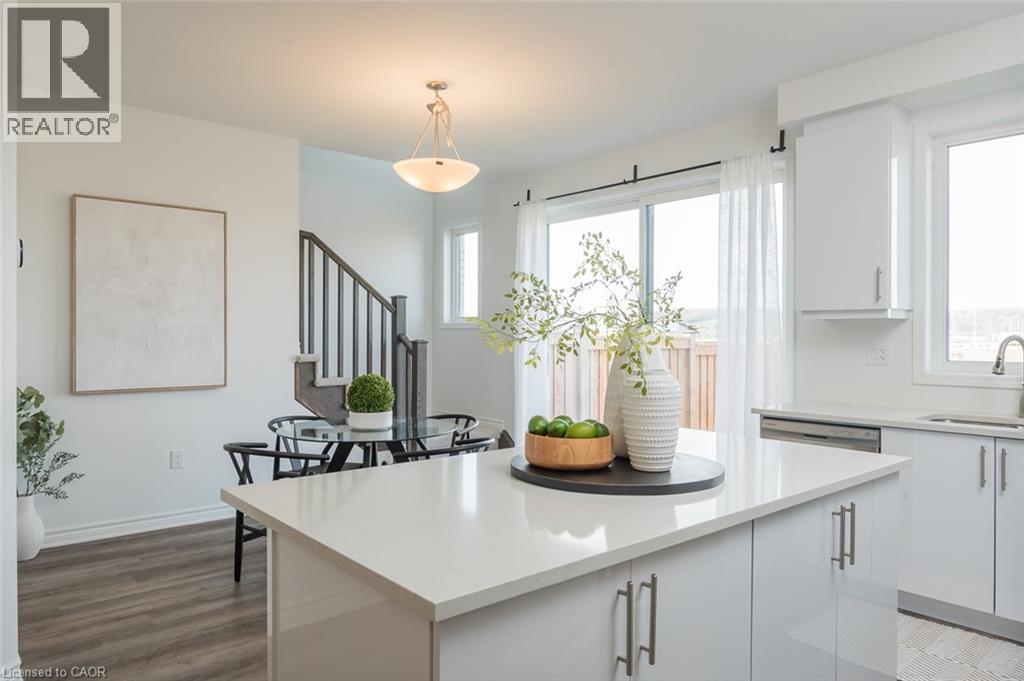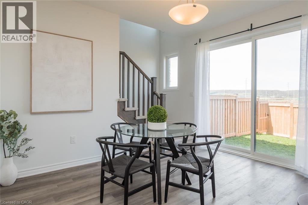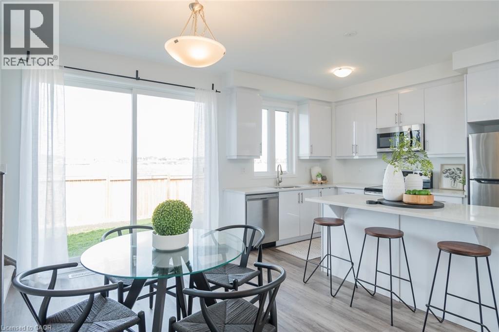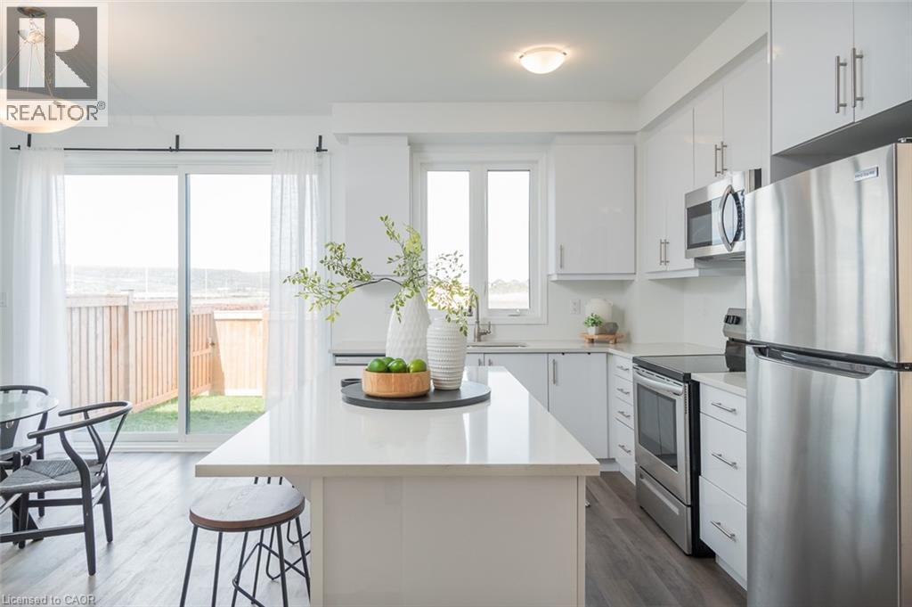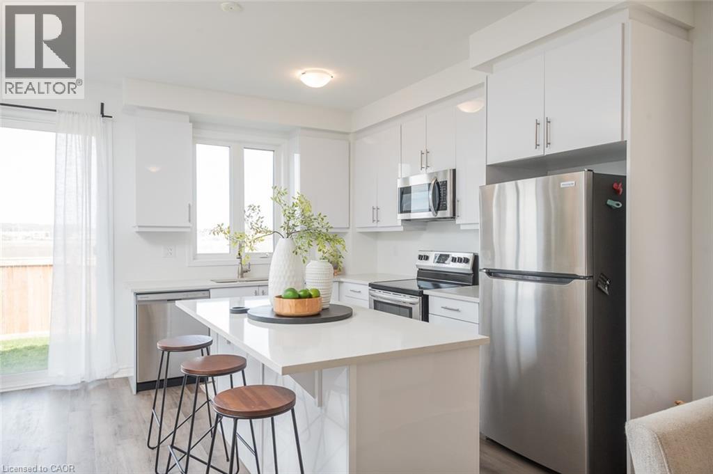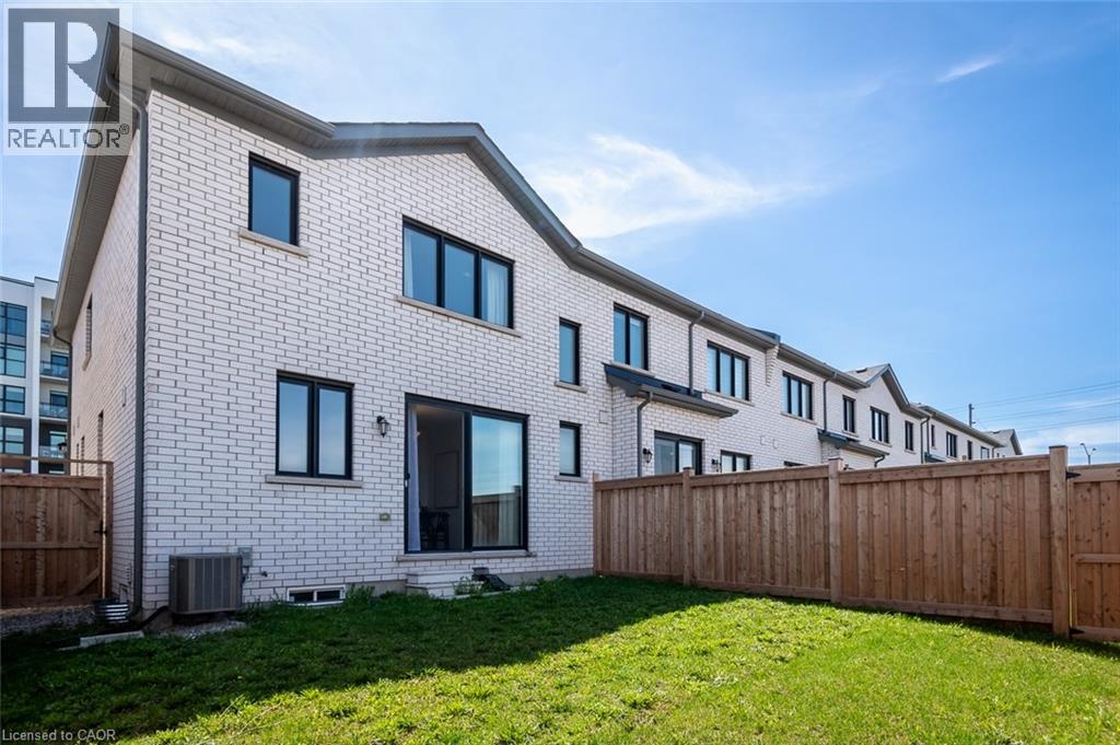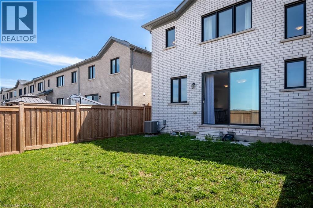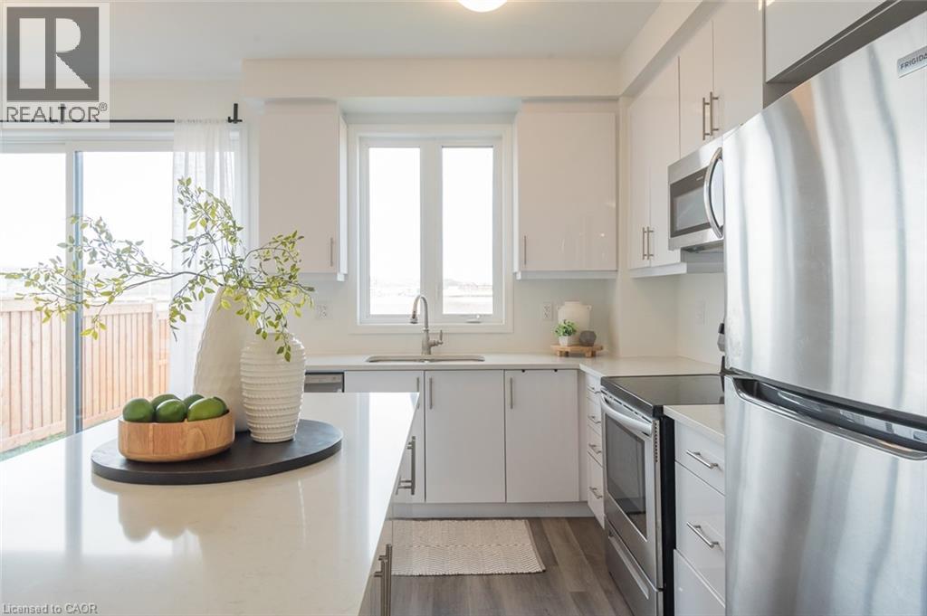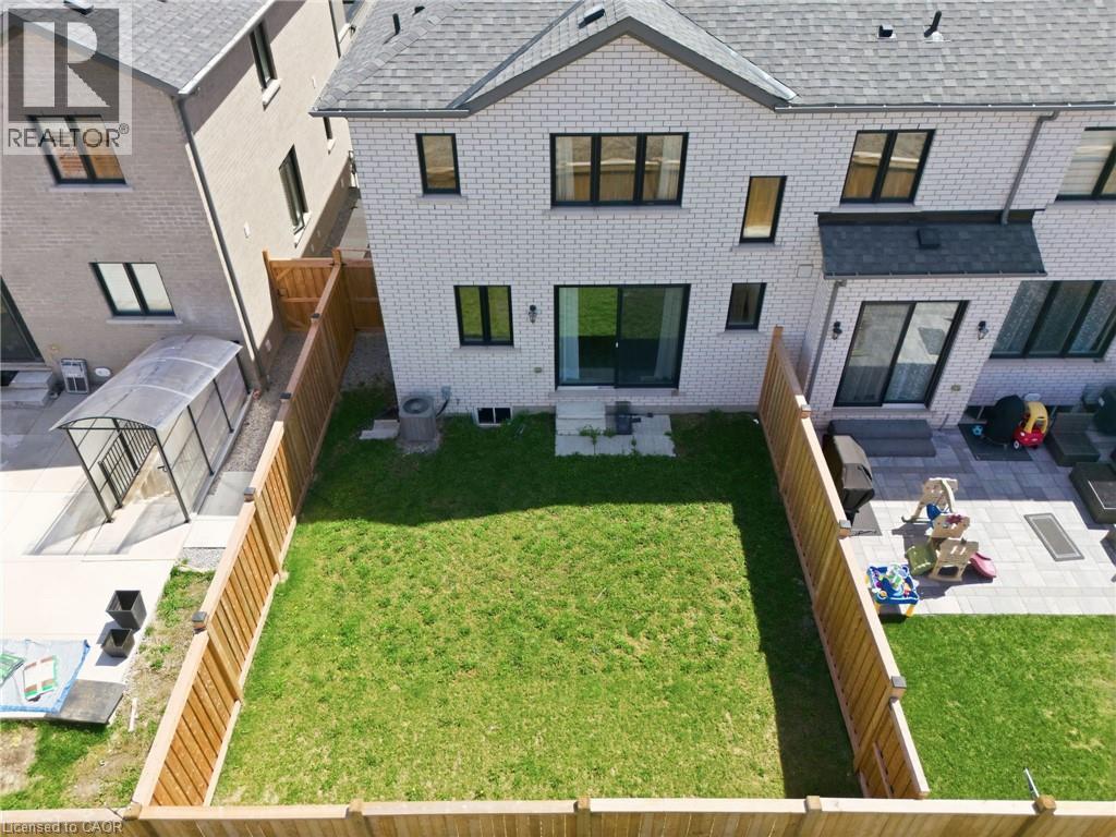 Spacious 4 bedroom end-unit townhome with a thoughtful layout, 9 ft ceilings, and escarpment views. The main floor features a bright kitchen with white cabinetry, quartz countertops, stainless steel appliances, and a centre island with breakfast bar seating. Double sliding doors lead to a fully fenced backyard, making indoor-outdoor living easy, while main floor laundry and interior garage access add convenience. Upstairs, the two-storey staircase with wood spindles opens to four bedrooms and a 4-piece main bathroom. The primary suite offers a walk-in closet, double sink vanity, enclosed shower, and freestanding soaker tub. Three additional bedrooms and a large linen closet complete the level. The all-brick exterior and black-framed windows provide strong curb appeal in Milton’s sought-after Walker neighbourhood. All major mechanicals are under five years old making this a move-in ready home! (id:43681)