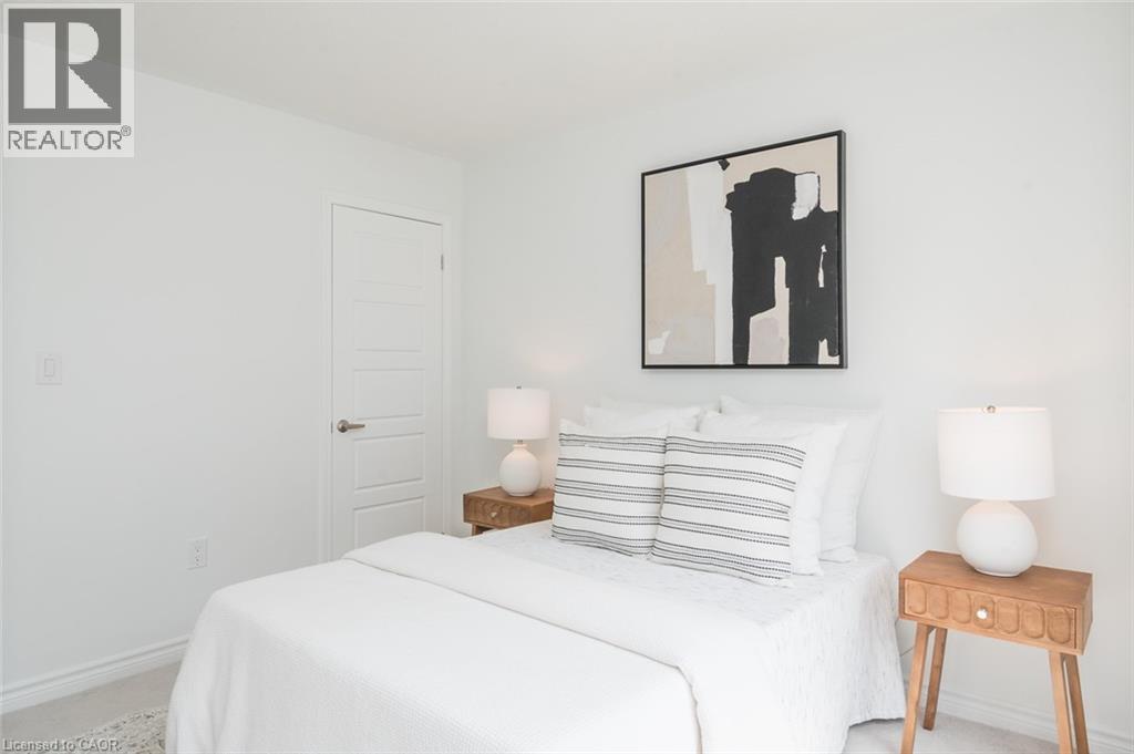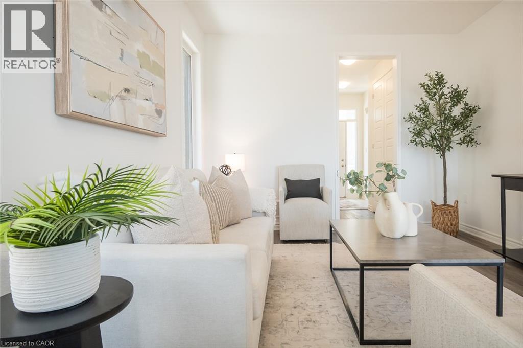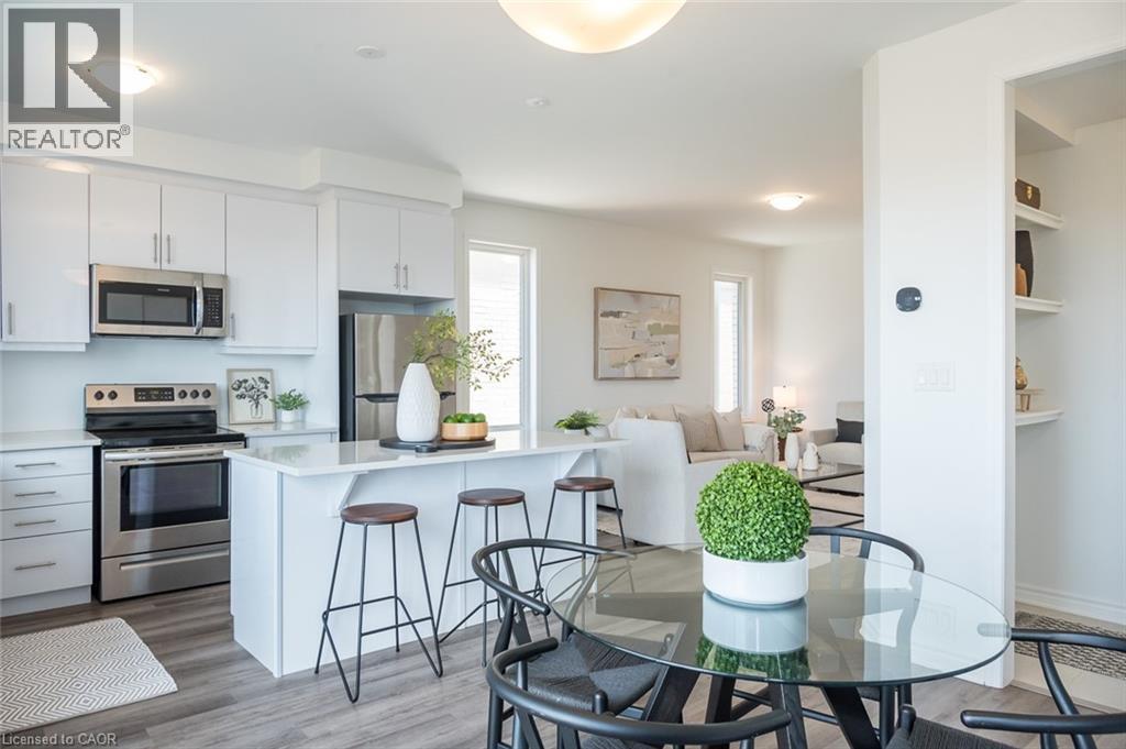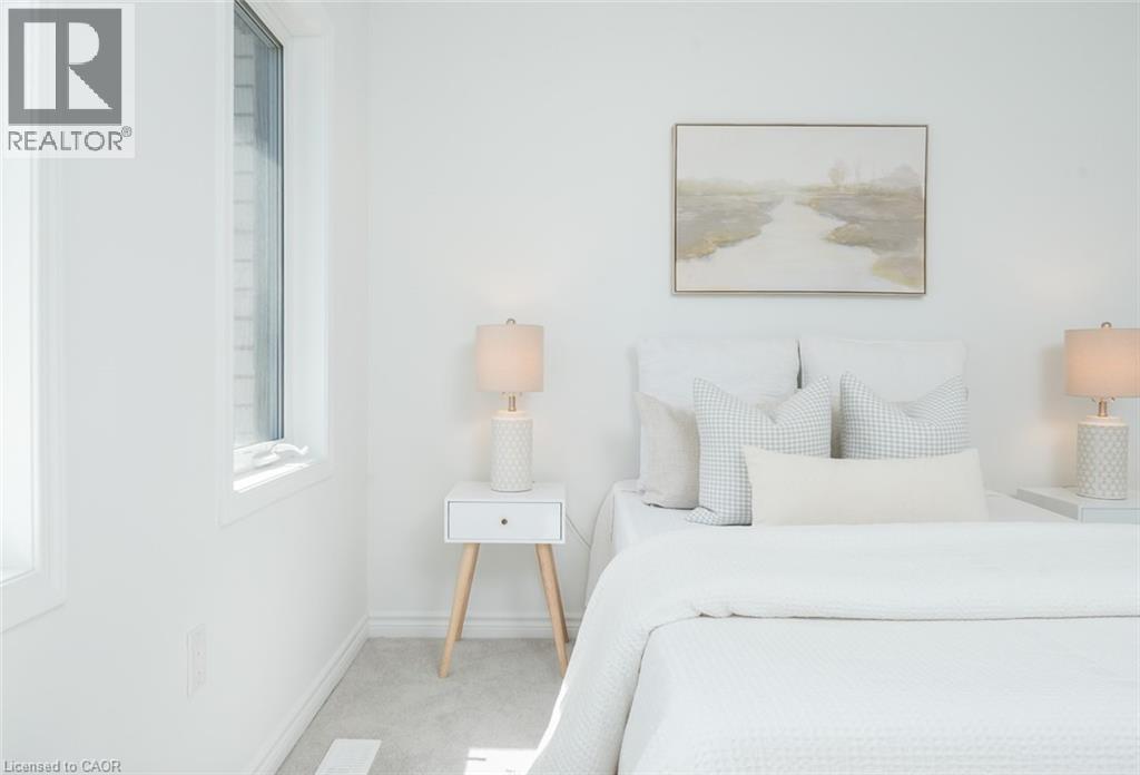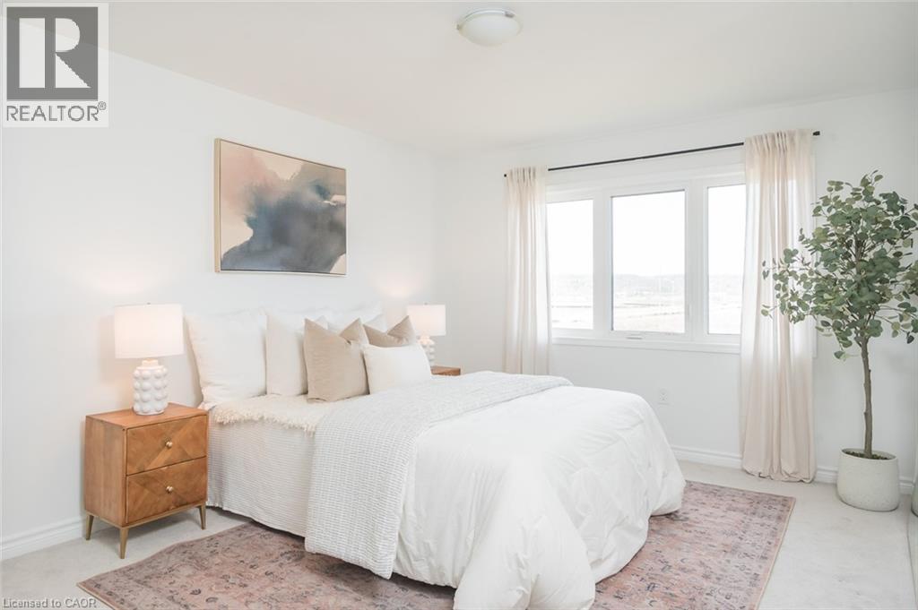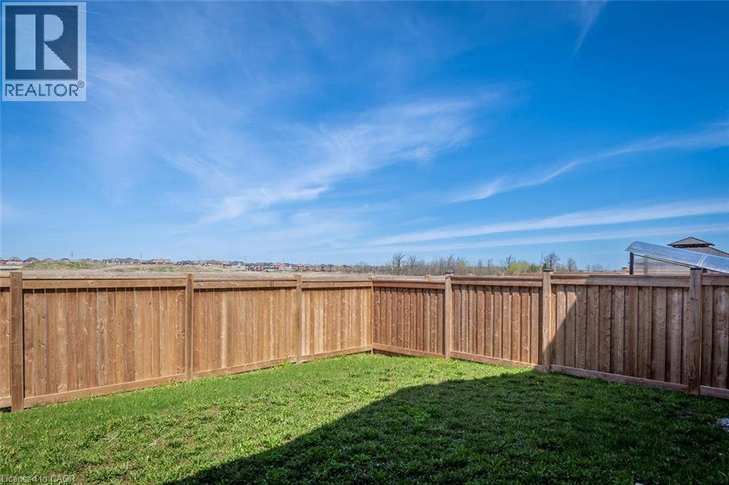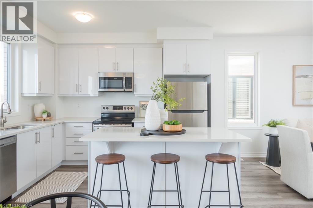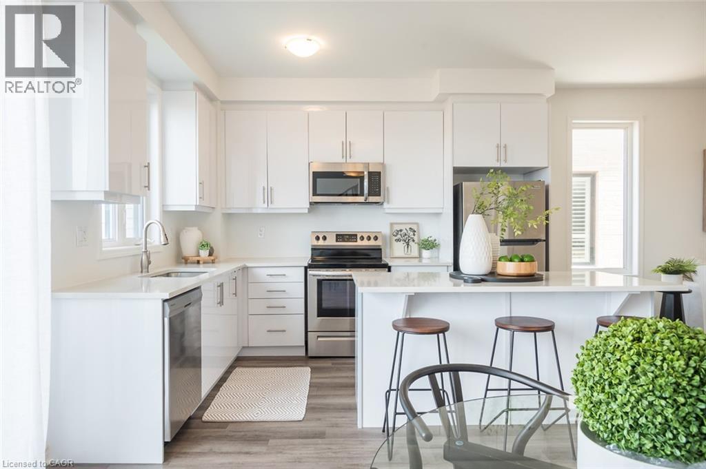Spacious 4 bedroom end-unit townhome with a thoughtful layout, 9 ft ceilings, and escarpment views. The main floor features a bright kitchen with white cabinetry, quartz countertops, stainless steel appliances, and a centre island with breakfast bar seating. Double sliding doors lead to a fully fenced backyard, making indoor-outdoor living easy, while main floor laundry and interior garage access add convenience. Upstairs, the two-storey staircase with wood spindles opens to four bedrooms and a 4-piece main bathroom. The primary suite offers a walk-in closet, double sink vanity, enclosed shower, and freestanding soaker tub. Three additional bedrooms and a large linen closet complete the level. The all-brick exterior and black-framed windows provide strong curb appeal in Milton’s sought-after Walker neighbourhood. All major mechanicals are under five years old making this a move-in ready home! (id:43681)