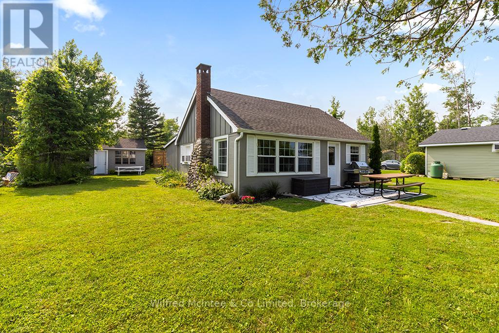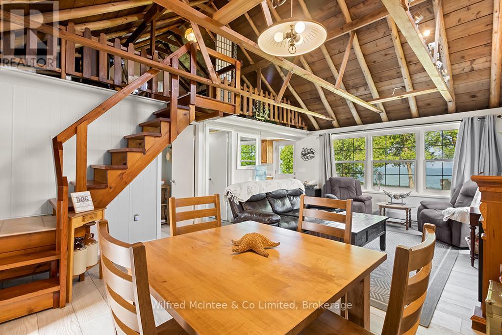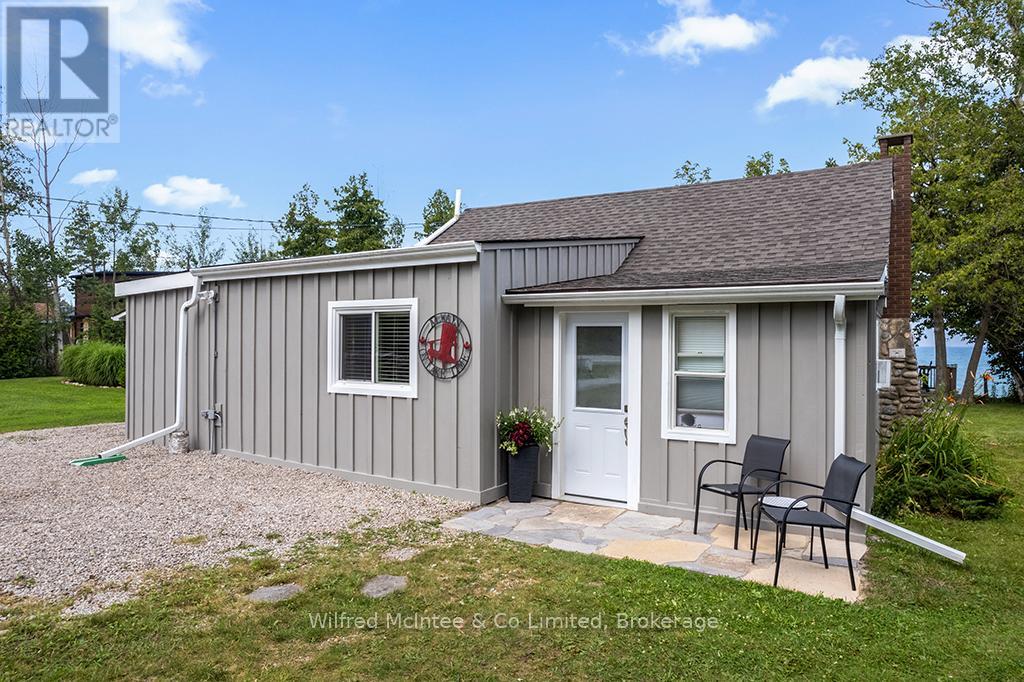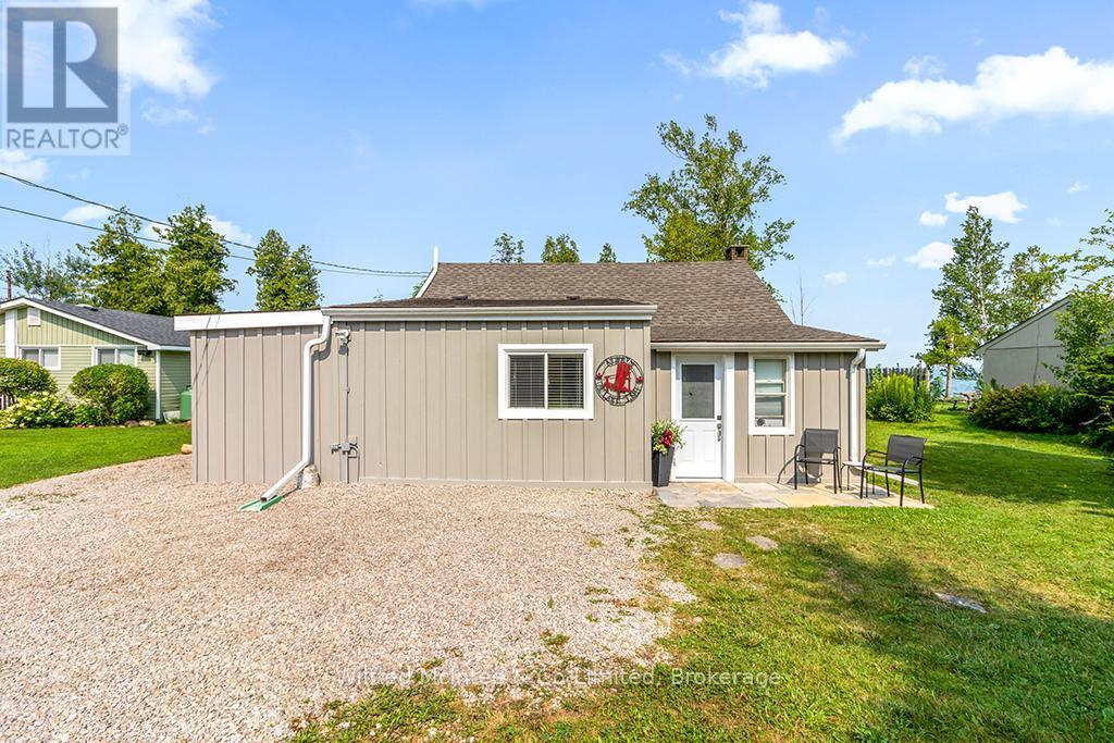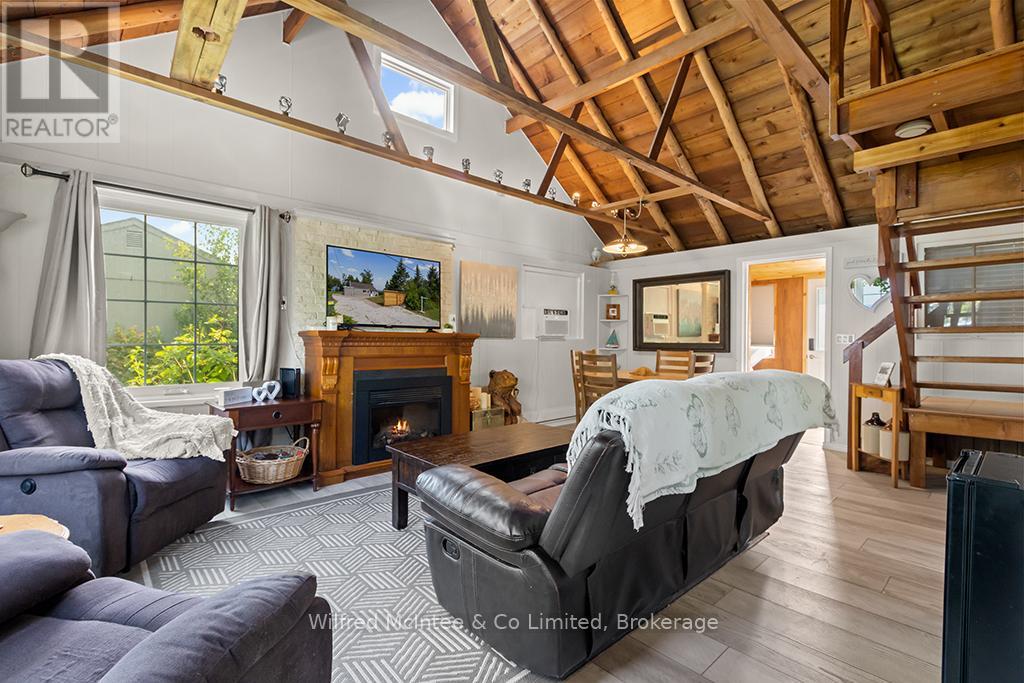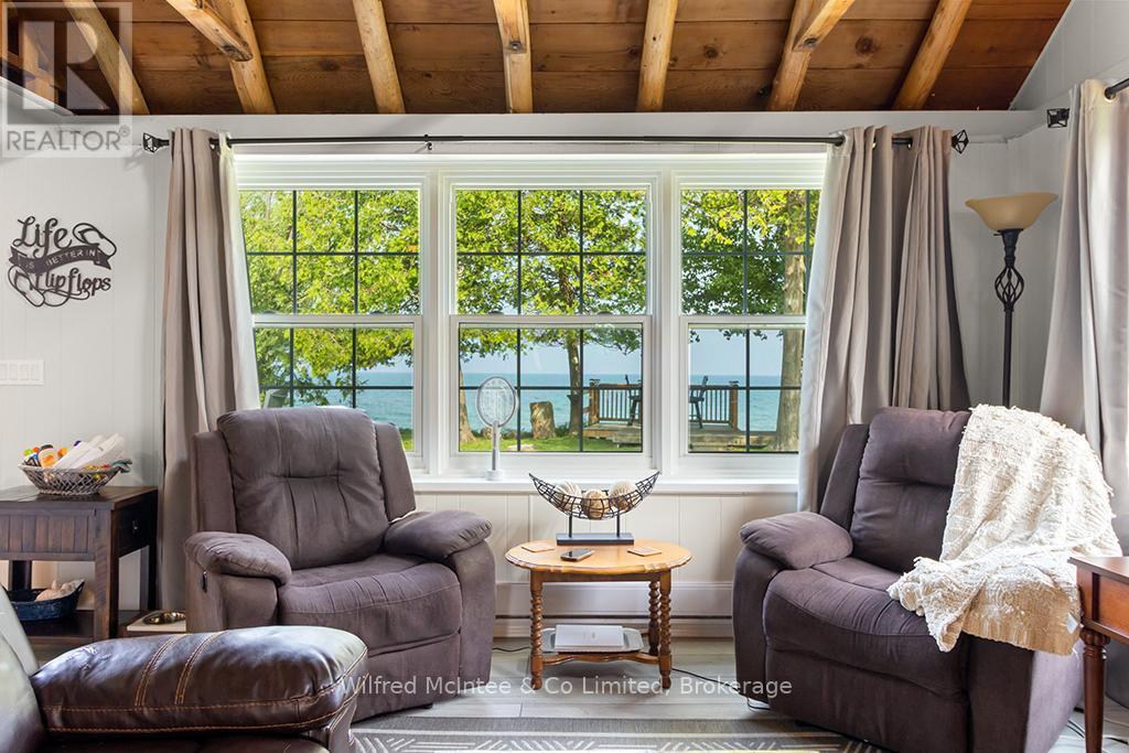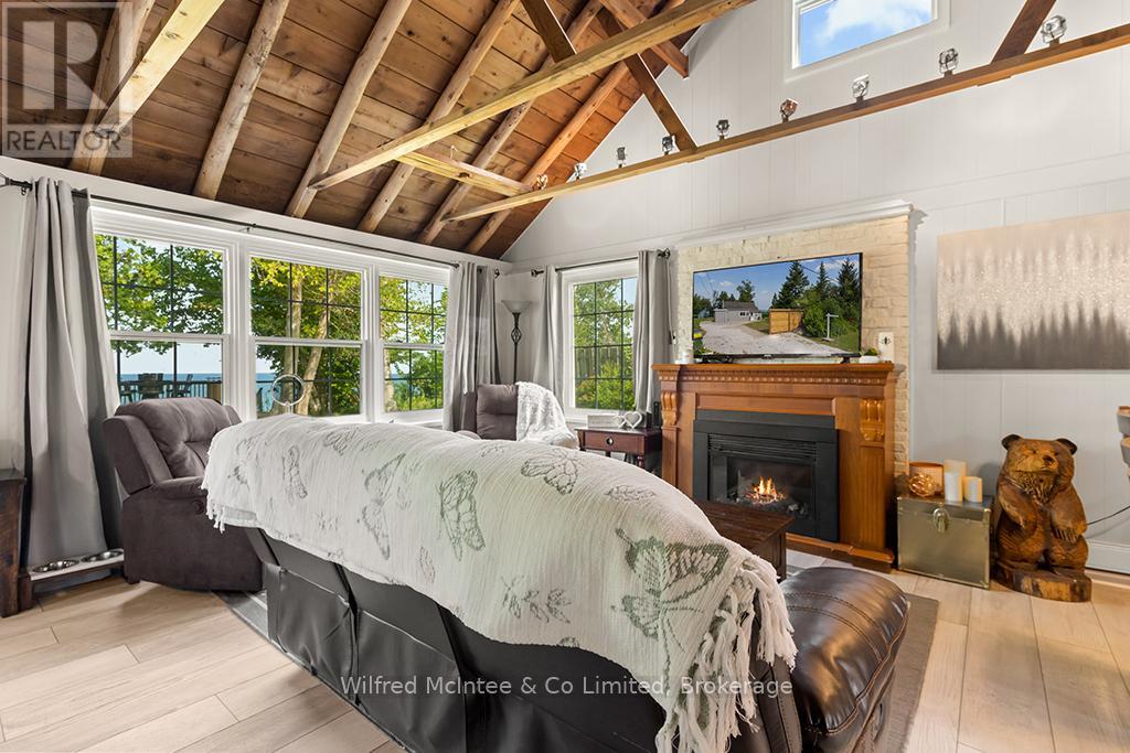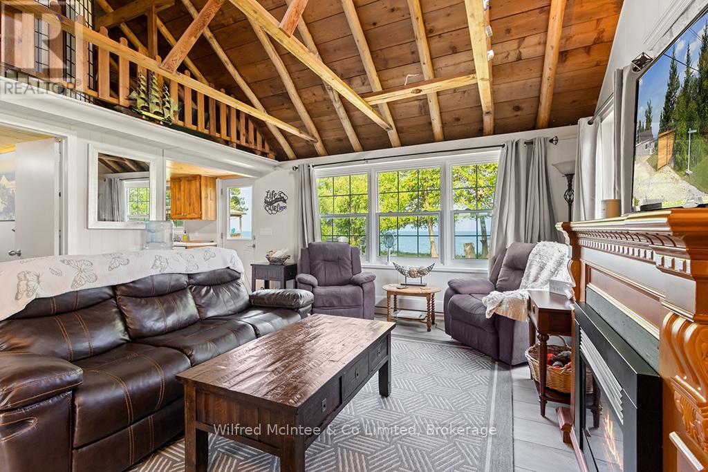 Check out this awesome waterfront leased land cottage featuring elevated panoramic lake views, spectacular sunsets, and brimming with rustic cottage charm and modern updates. The exceptionally tidy cottage offers 3 bedrooms (one in the loft), 2 bathrooms, and an insulated fully reno'd bunk for guests that could also be converted to a great yoga/gym space or office for those who must work at the cottage. From the moment you step inside the cottage you are greeted with beautiful blue hues from Lake Huron casting their glow through the windows. There is small foyer/mudroom and to the left is your private primary bedroom with 4pc en-suite bathroom. Take a couple steps forward and you are welcomed into the open concept living/dining area with vaulted ceiling that showcases the rustic cottage framing and opens to the loft bedroom above. Completing the space is a 2nd bedroom, 3Pc bathroom, and U-shaped kitchen with plenty of cabinetry, new counter tops, and stunning water views from many viewpoints. The cottage is as sturdy as they come with most of the cottage built on concrete slab with block walls and has many noteworthy features, including; updated septic system, solid stairs down to the water, newer roof shingles, fresh exterior paint, lake side deck and flagstone patio, plenty of parking, 100amp breaker panel, baseboard electric heaters and electric fireplace, plus a window a/c unit, highspeed internet, and most furniture & appliances are included creating a turnkey opportunity. This well cared for, and tidy cottage is in excellent shape and a pleasure to view. (id:43681)