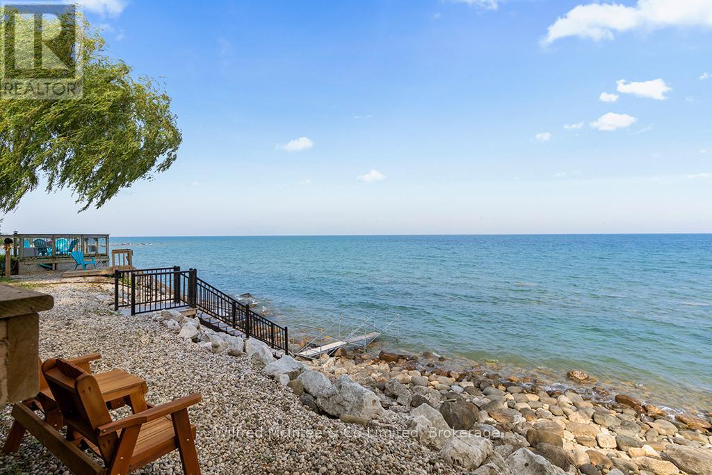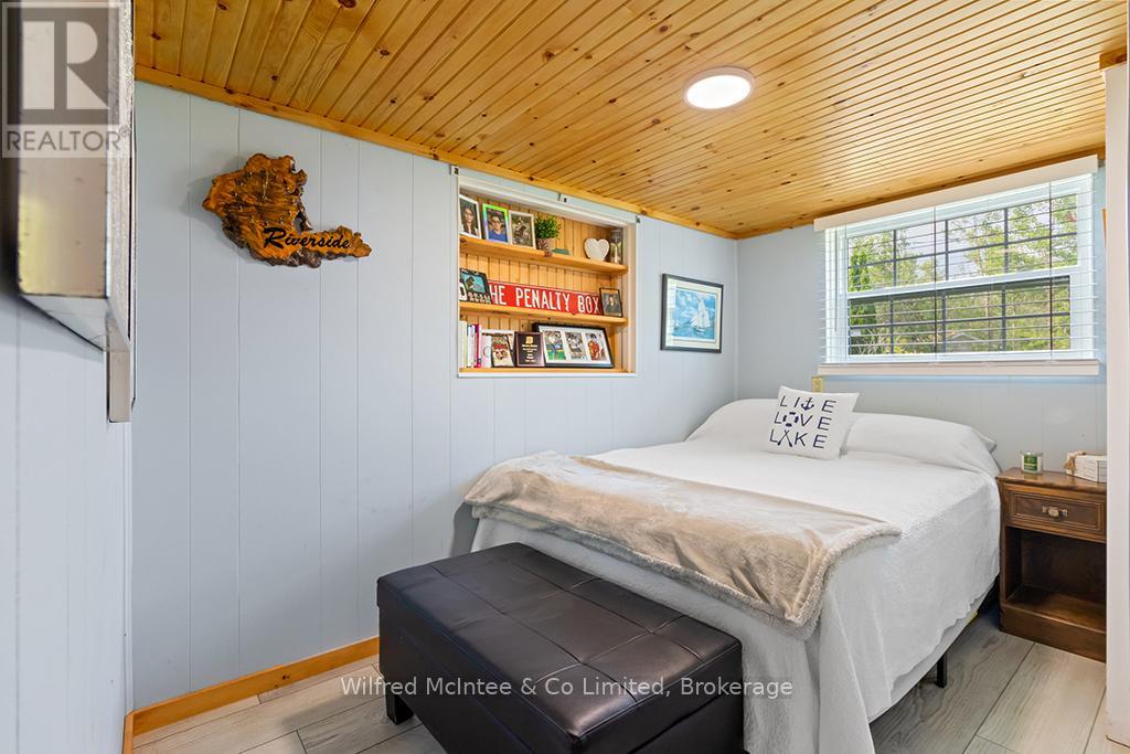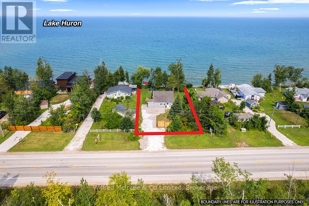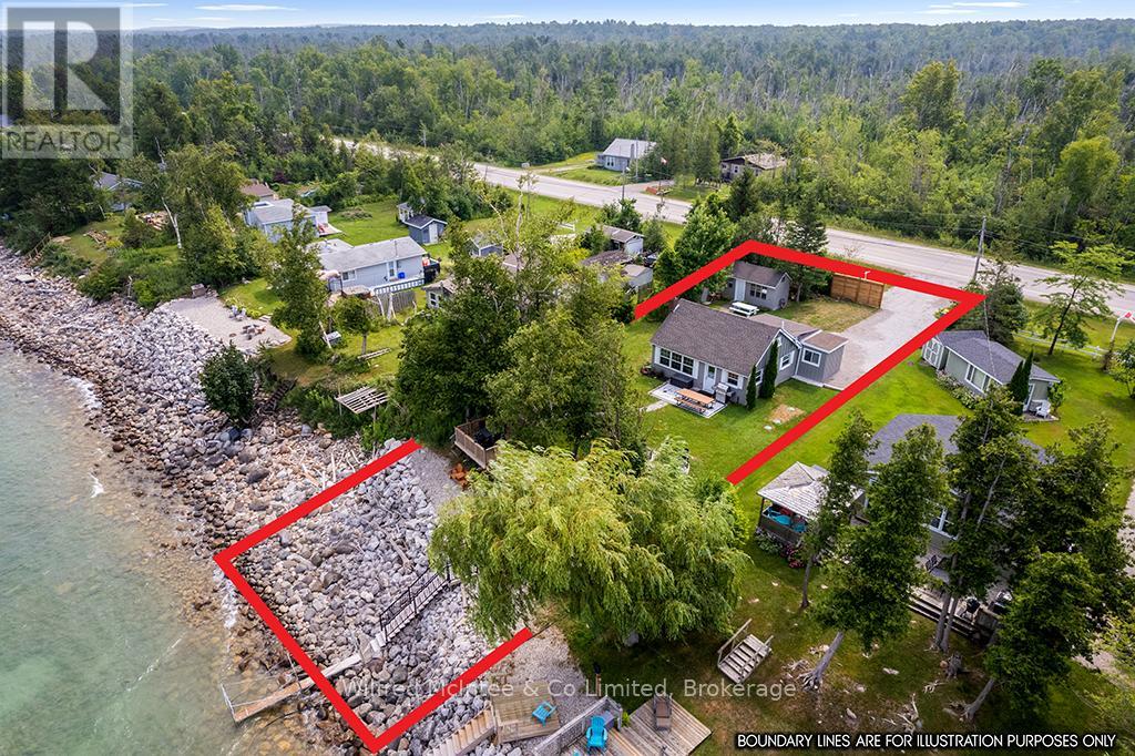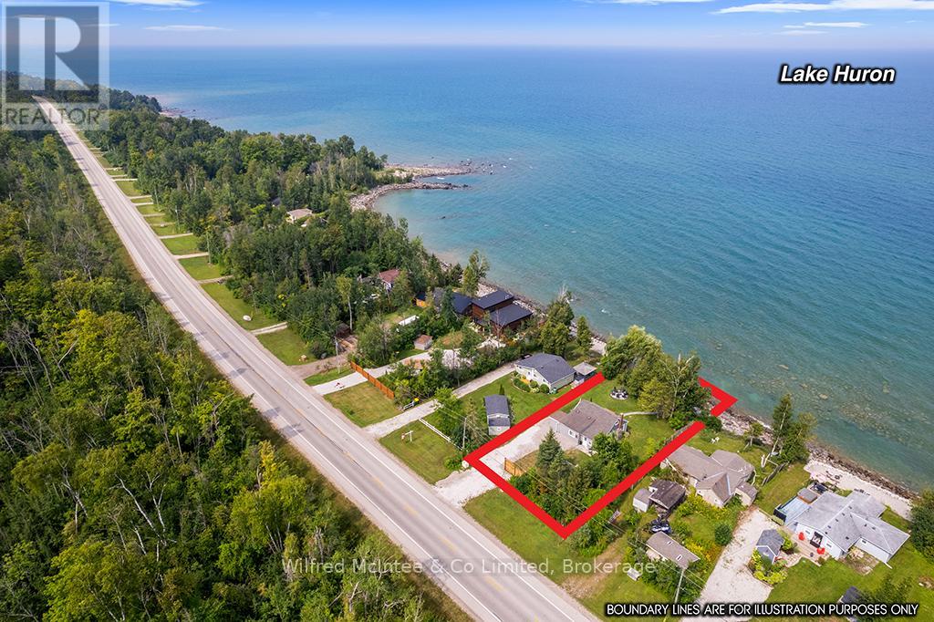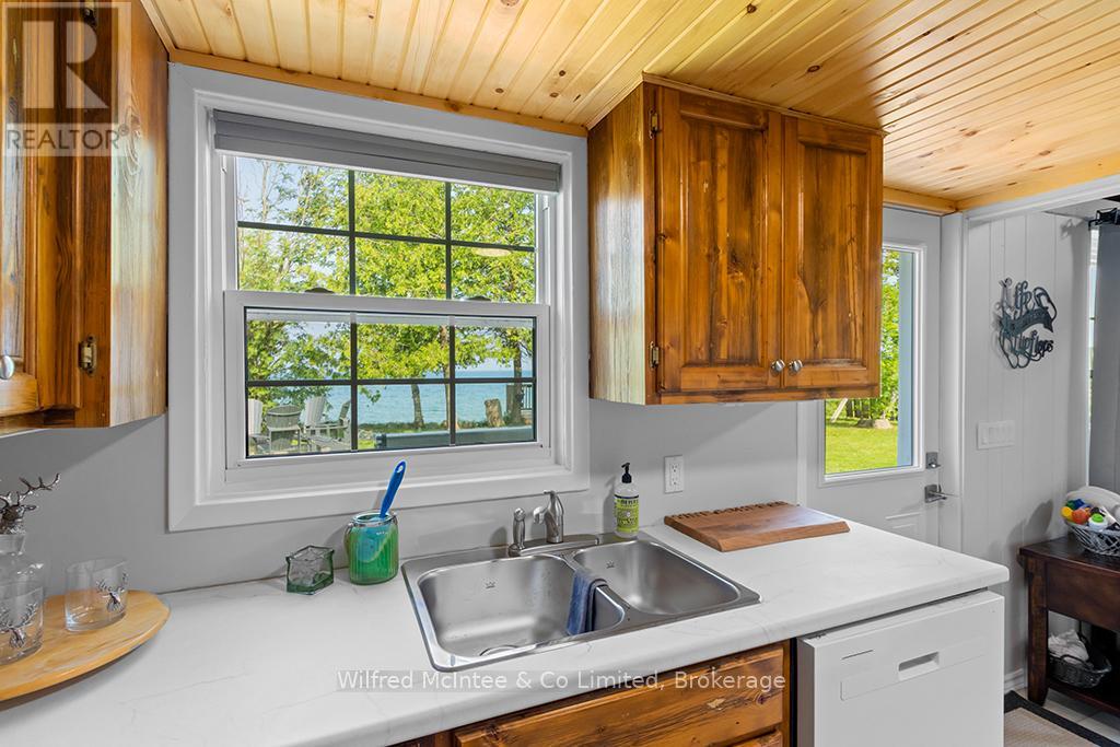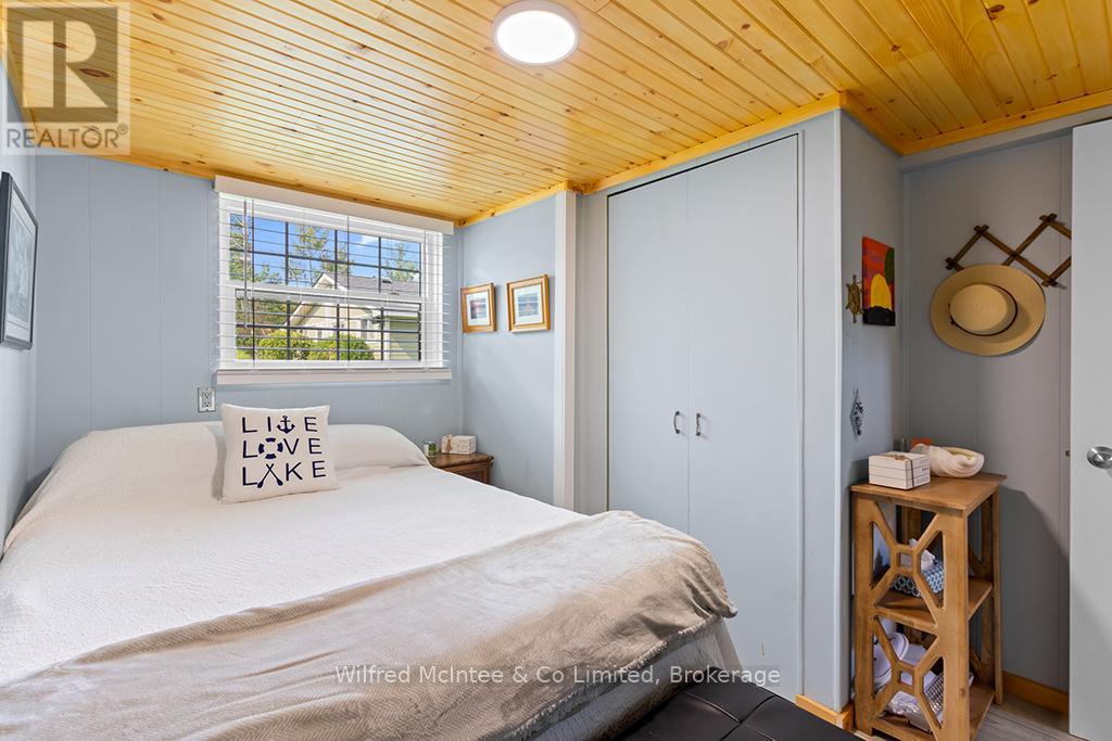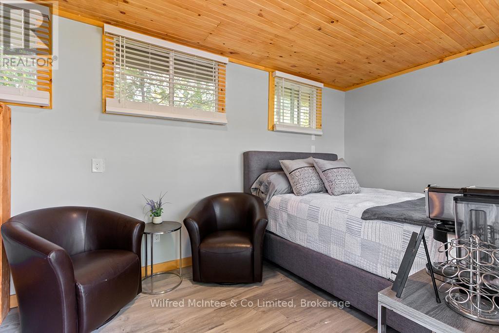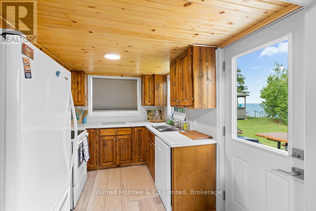 Check out this awesome waterfront leased land cottage featuring elevated panoramic lake views, spectacular sunsets, and brimming with rustic cottage charm and modern updates. The exceptionally tidy cottage offers 3 bedrooms (one in the loft), 2 bathrooms, and an insulated fully reno'd bunk for guests that could also be converted to a great yoga/gym space or office for those who must work at the cottage. From the moment you step inside the cottage you are greeted with beautiful blue hues from Lake Huron casting their glow through the windows. There is small foyer/mudroom and to the left is your private primary bedroom with 4pc en-suite bathroom. Take a couple steps forward and you are welcomed into the open concept living/dining area with vaulted ceiling that showcases the rustic cottage framing and opens to the loft bedroom above. Completing the space is a 2nd bedroom, 3Pc bathroom, and U-shaped kitchen with plenty of cabinetry, new counter tops, and stunning water views from many viewpoints. The cottage is as sturdy as they come with most of the cottage built on concrete slab with block walls and has many noteworthy features, including; updated septic system, solid stairs down to the water, newer roof shingles, fresh exterior paint, lake side deck and flagstone patio, plenty of parking, 100amp breaker panel, baseboard electric heaters and electric fireplace, plus a window a/c unit, highspeed internet, and most furniture & appliances are included creating a turnkey opportunity. This well cared for, and tidy cottage is in excellent shape and a pleasure to view. (id:43681)
