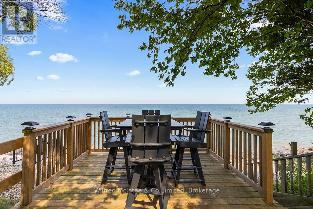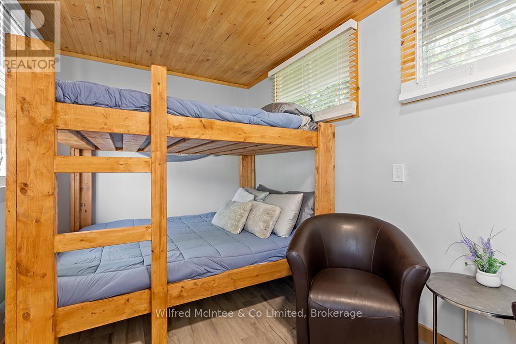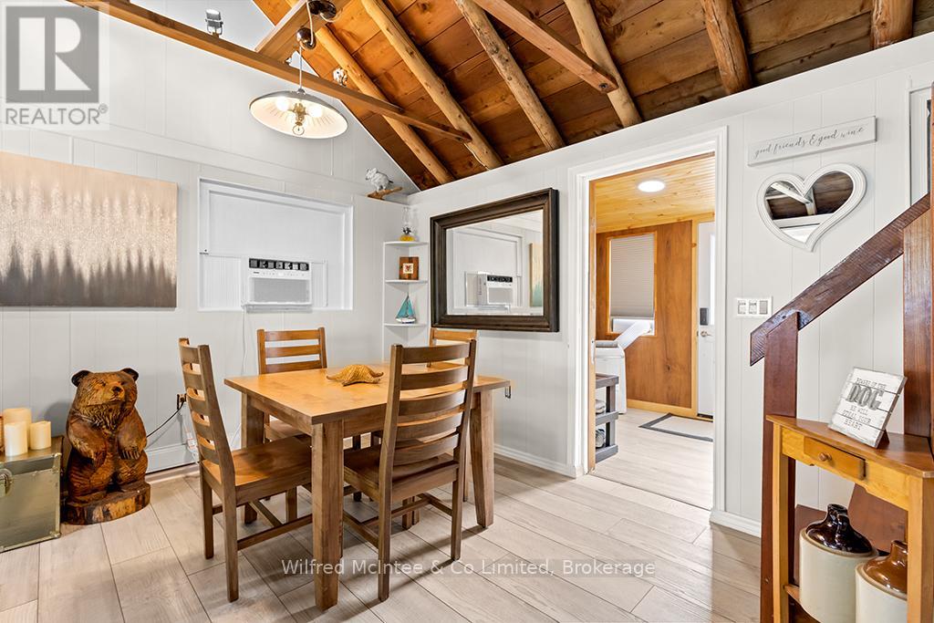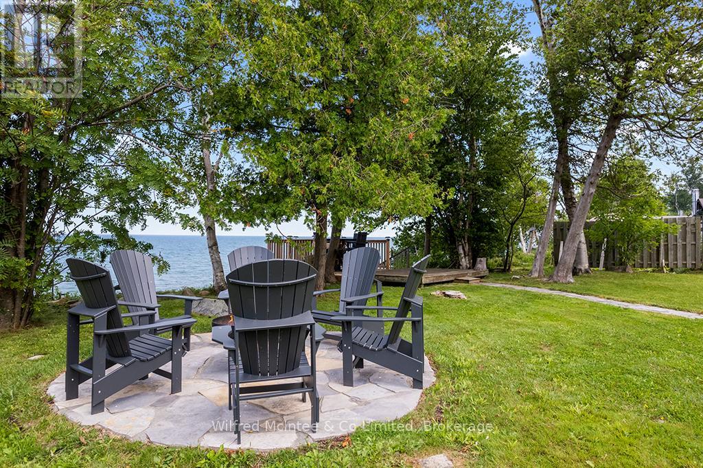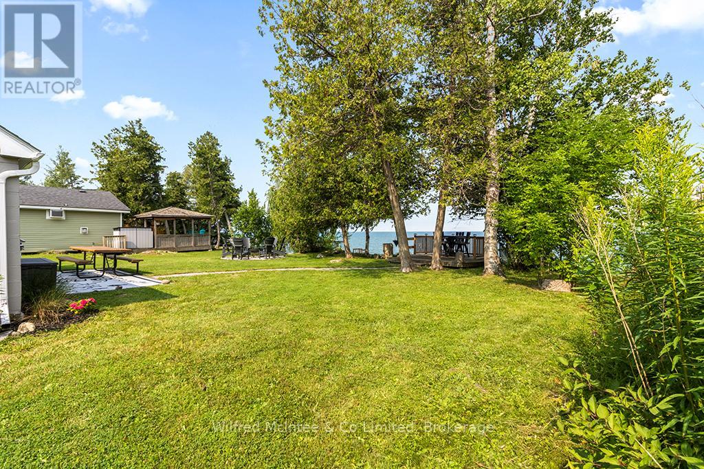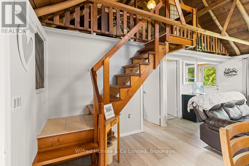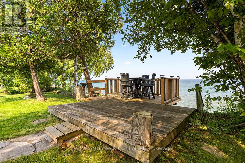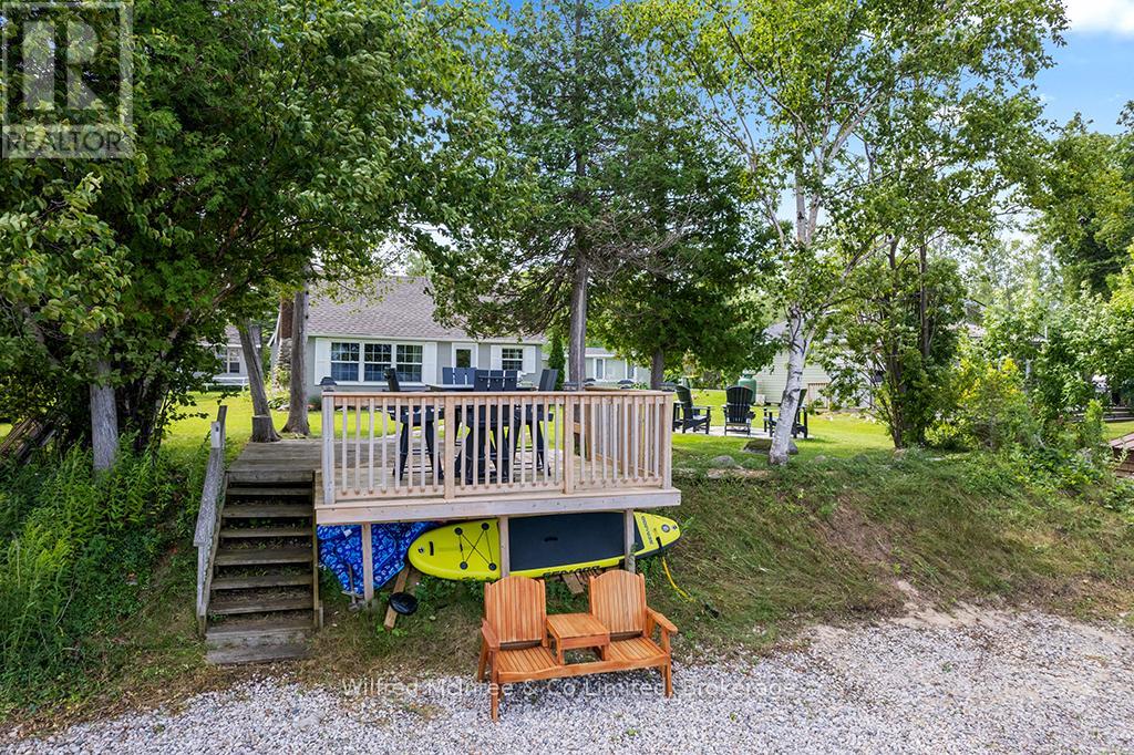 Check out this awesome waterfront leased land cottage featuring elevated panoramic lake views, spectacular sunsets, and brimming with rustic cottage charm and modern updates. The exceptionally tidy cottage offers 3 bedrooms (one in the loft), 2 bathrooms, and an insulated fully reno'd bunk for guests that could also be converted to a great yoga/gym space or office for those who must work at the cottage. From the moment you step inside the cottage you are greeted with beautiful blue hues from Lake Huron casting their glow through the windows. There is small foyer/mudroom and to the left is your private primary bedroom with 4pc en-suite bathroom. Take a couple steps forward and you are welcomed into the open concept living/dining area with vaulted ceiling that showcases the rustic cottage framing and opens to the loft bedroom above. Completing the space is a 2nd bedroom, 3Pc bathroom, and U-shaped kitchen with plenty of cabinetry, new counter tops, and stunning water views from many viewpoints. The cottage is as sturdy as they come with most of the cottage built on concrete slab with block walls and has many noteworthy features, including; updated septic system, solid stairs down to the water, newer roof shingles, fresh exterior paint, lake side deck and flagstone patio, plenty of parking, 100amp breaker panel, baseboard electric heaters and electric fireplace, plus a window a/c unit, highspeed internet, and most furniture & appliances are included creating a turnkey opportunity. This well cared for, and tidy cottage is in excellent shape and a pleasure to view. (id:43681)