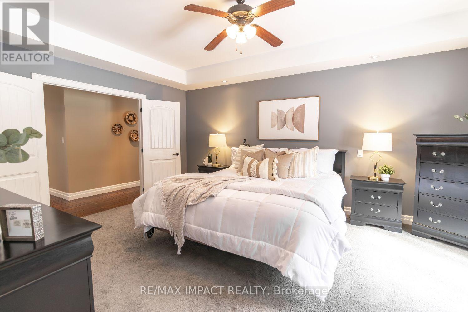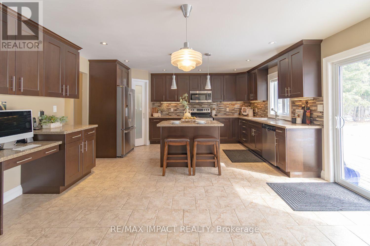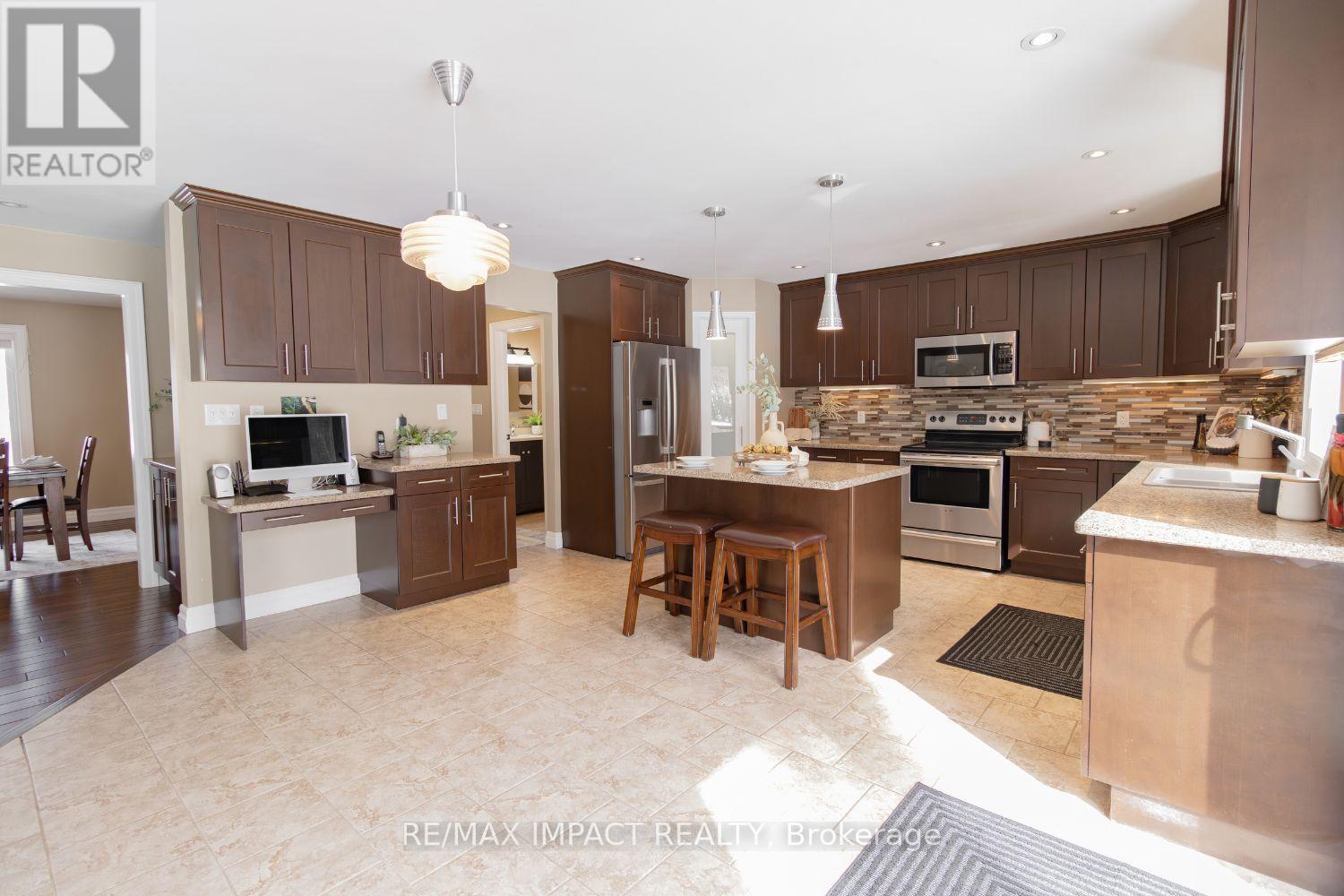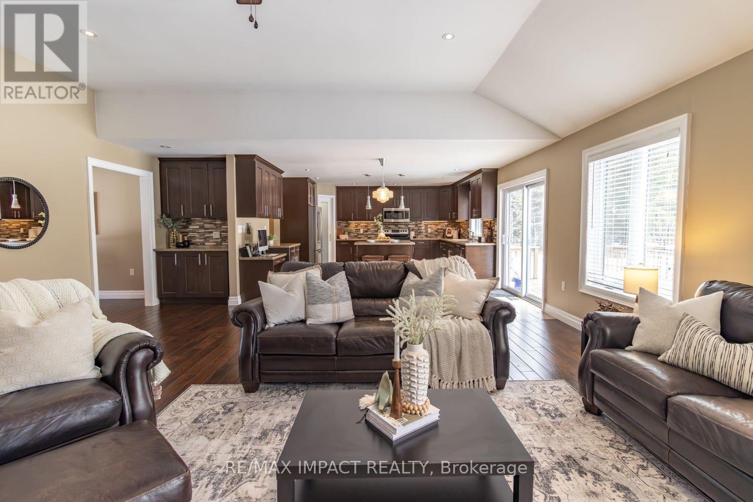 Welcome to this stunning country property, a true gem built in 2011, nestled on a spacious 1.23 acre lot measuring 195' x 275'. This beautiful 2110 sf (per blueprint) bungalow boasts a charming stone and vinyl exterior, complemented by an attached heated four-car garage (1-double overhead door and 2 single overhead doors) and lots of parking for 10+ vehicles. Conveniently, the main floor offers direct access to the garage, while a secondary entrance leads to the basement from the garage, enhancing the home's functionality. At the heart of this property is a picturesque spring-fed pond located in the rear yard, approximately 10' deep, perfect for those seeking tranquility and natural beauty. The back yard features a wooden deck off the kitchen within a chain-link enclosure, providing a safe children's play area with playhouse and swing. Inside, the main level showcases an open-concept design that seamlessly connects the kitchen, great room, and separate dining area. The kitchen features rich dark cabinetry with granite countertops, stainless steel appliances, ceramic backsplash and separate desk area. The ceramic tile flooring adds durability, while a corner pantry with shelving and a convenient two-piece powder room enhance practicality. The kitchen also opens up to a deck that overlooks the pond and is surrounded by mature trees, creating a country outdoor retreat. The great room is highlighted by a large picture window, vaulted ceiling and pot lights with hardwood flooring. Double entry doors lead to the spacious primary bedroom, which includes a walk-in closet and a 5-piece ensuite complete with soaking tub, separate shower and 2 sink vanity. Two additional front bedrooms and a well-appointed 4-piece main bathroom complete the main floor. (id:43681)