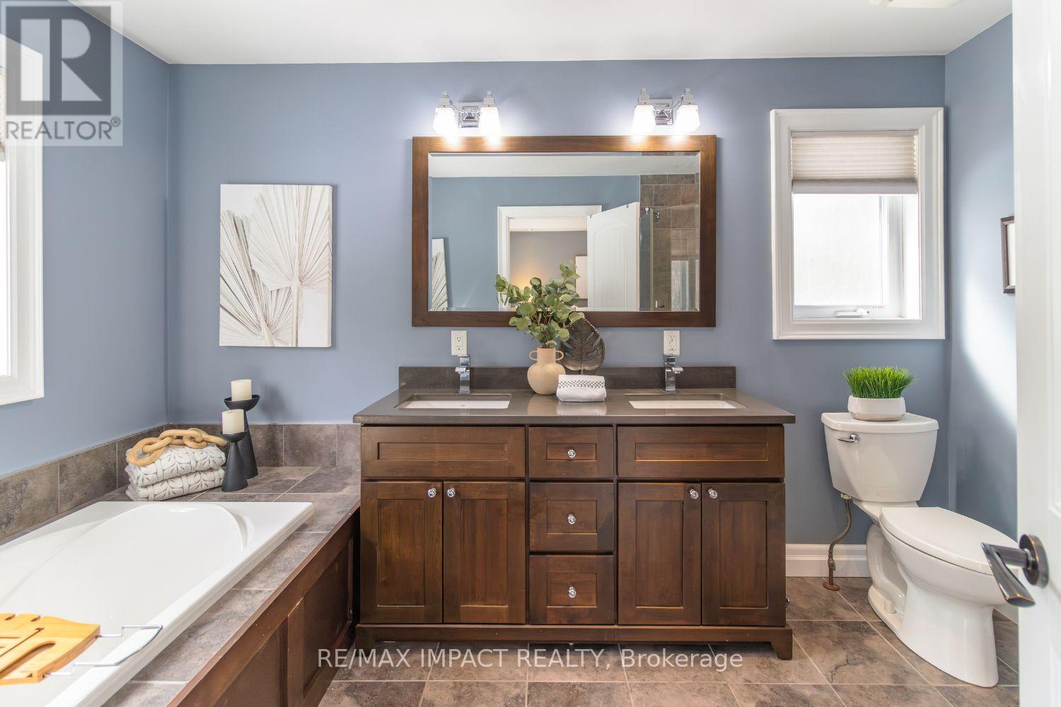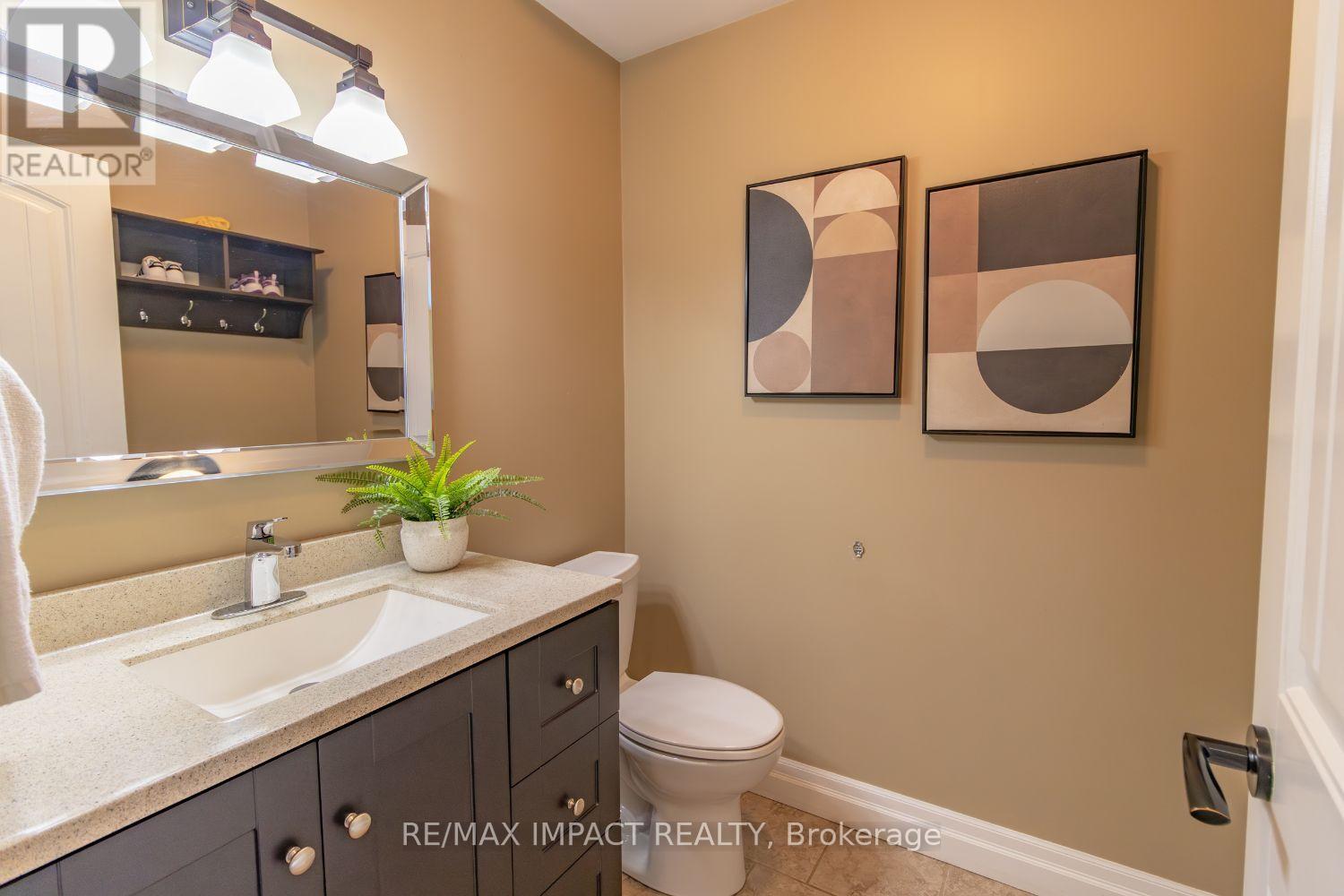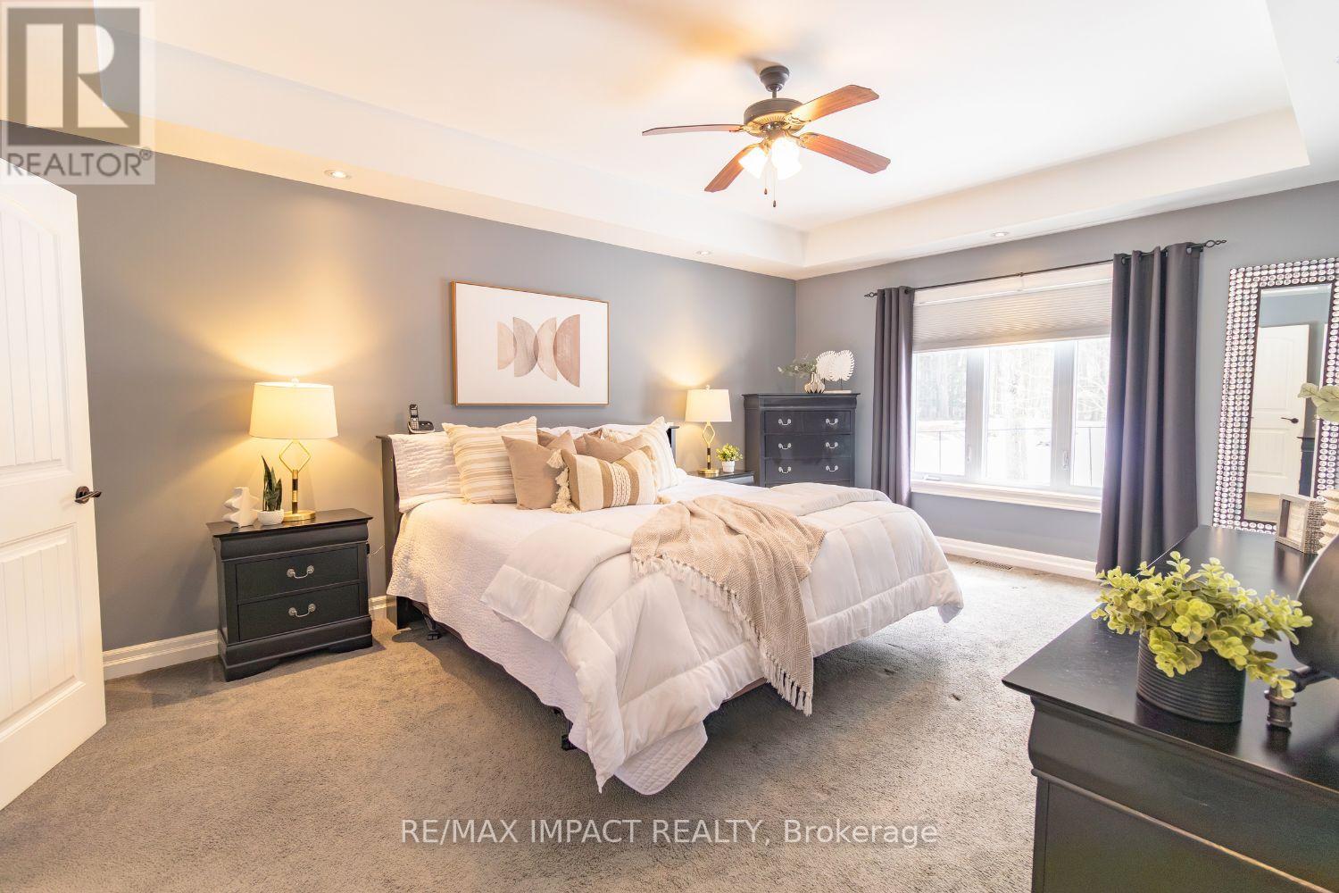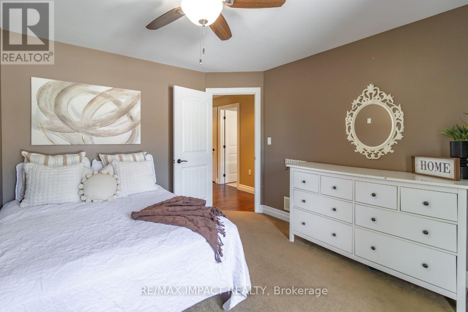 Welcome to this stunning country property, a true gem built in 2011, nestled on a spacious 1.23 acre lot measuring 195' x 275'. This beautiful 2110 sf (per blueprint) bungalow boasts a charming stone and vinyl exterior, complemented by an attached heated four-car garage (1-double overhead door and 2 single overhead doors) and lots of parking for 10+ vehicles. Conveniently, the main floor offers direct access to the garage, while a secondary entrance leads to the basement from the garage, enhancing the home's functionality. At the heart of this property is a picturesque spring-fed pond located in the rear yard, approximately 10' deep, perfect for those seeking tranquility and natural beauty. The back yard features a wooden deck off the kitchen within a chain-link enclosure, providing a safe children's play area with playhouse and swing. Inside, the main level showcases an open-concept design that seamlessly connects the kitchen, great room, and separate dining area. The kitchen features rich dark cabinetry with granite countertops, stainless steel appliances, ceramic backsplash and separate desk area. The ceramic tile flooring adds durability, while a corner pantry with shelving and a convenient two-piece powder room enhance practicality. The kitchen also opens up to a deck that overlooks the pond and is surrounded by mature trees, creating a country outdoor retreat. The great room is highlighted by a large picture window, vaulted ceiling and pot lights with hardwood flooring. Double entry doors lead to the spacious primary bedroom, which includes a walk-in closet and a 5-piece ensuite complete with soaking tub, separate shower and 2 sink vanity. Two additional front bedrooms and a well-appointed 4-piece main bathroom complete the main floor. (id:43681)