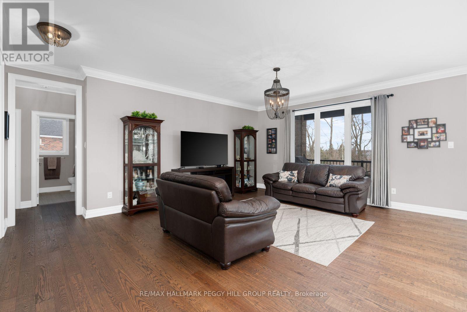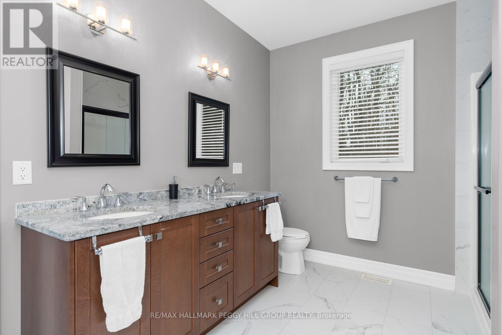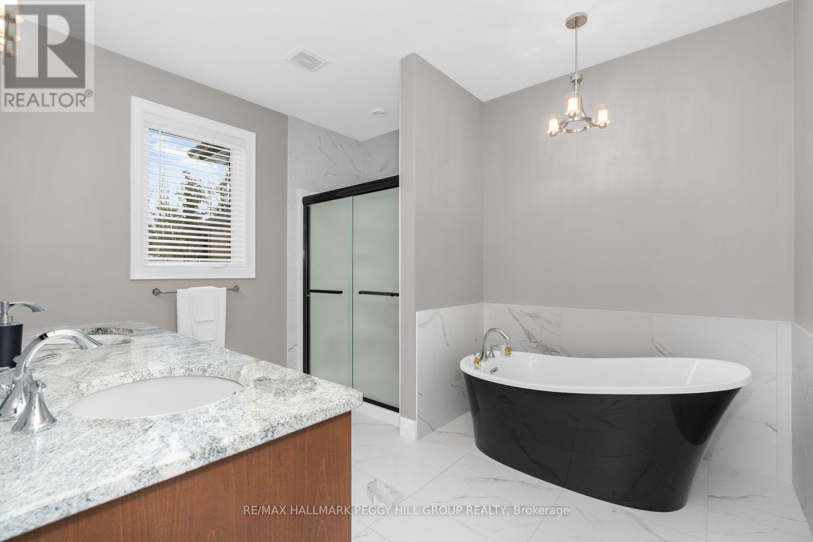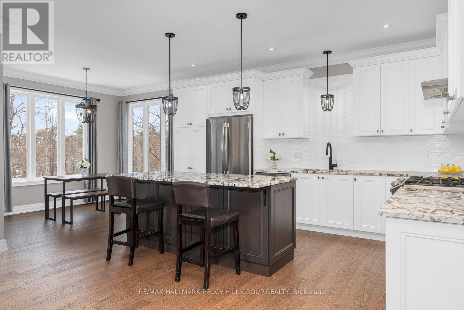 PRESTIGIOUS CARSON RIDGE ESTATES BUNGALOW WITH NEARLY 2,100 SQ FT ON OVER HALF AN ACRE! Tucked into one of Midhurst's most exclusive enclaves, this Carson Ridge Estates bungalow sits at the end of a cul-de-sac among executive homes, with a treed backdrop on an 84 x 191 ft lot offering over half an acre. A stone and brick exterior sets a confident first impression, with an attached 3-car garage with inside entry and a wide driveway that accommodates up to 6 vehicles. Nearly 2,100 sq ft above grade features 9-ft ceilings, crown moulding, engineered hardwood flooring, main floor laundry, and an open-concept layout that keeps the kitchen, living, and dining spaces connected. The kitchen feels distinctly upscale with white cabinetry topped with crown moulding, full-height pantry storage, granite counters, a glossy white elongated hexagon tile backsplash, stainless steel appliances including a gas stove, stylish pendant lighting, and a contrasting wood-tone island with seating. The breakfast area walks out to the composite raised deck, with a covered patio below creating a shaded space for outdoor living. Three generous bedrooms include a primary retreat with two walk-in closets and a 5-piece ensuite featuring a dual sink vanity, freestanding tub, and separate shower. Downstairs, an unfinished walkout basement offers nearly 2,100 sq ft of additional space and excellent in-law potential, ready to be finished to suit your needs with direct backyard access. Located in the highly sought-after Forest Hill Public School catchment, the setting also offers quick access to Barrie and major highways, plus shopping, recreation, golf, and skiing, with trails and conservation lands nearby for the outdoor lifestyle Springwater is known for. (id:43681)