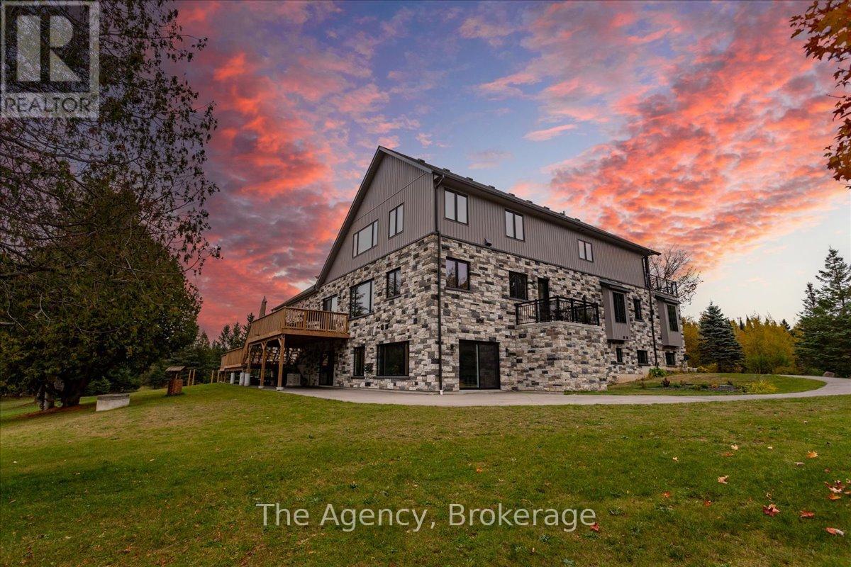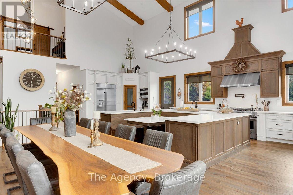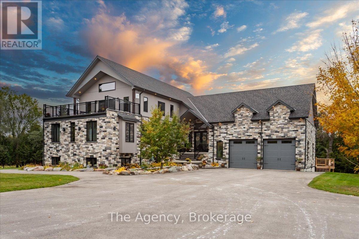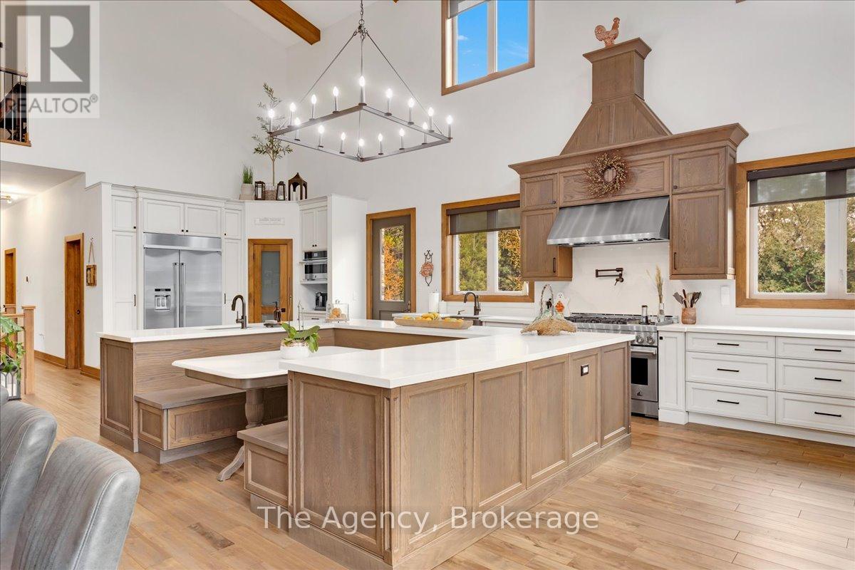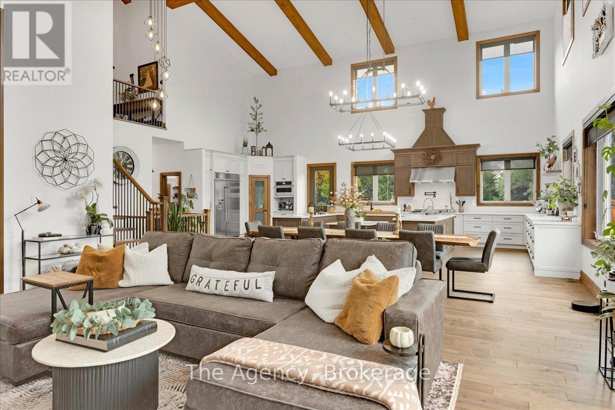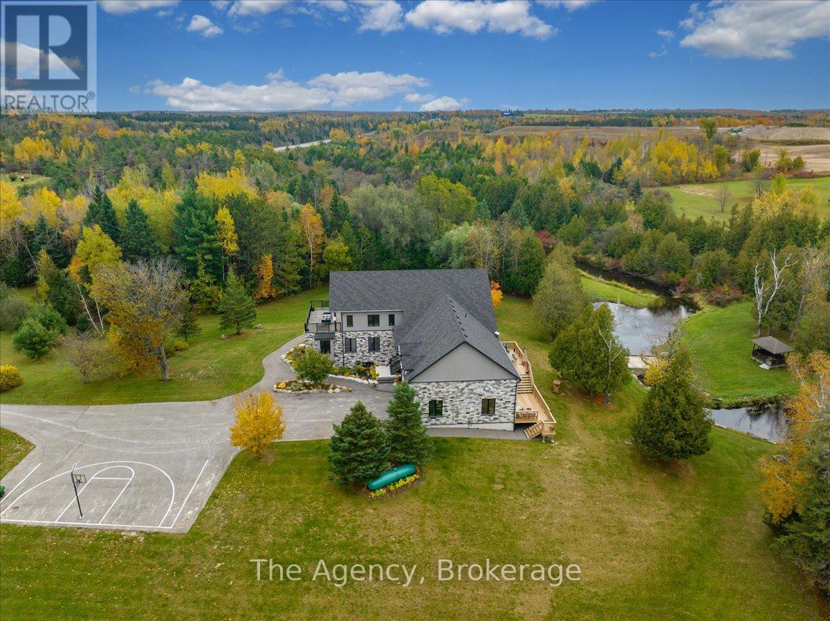 Escape the city and discover a rare offering of refined country living on 49.25 acres of picturesque land featuring streams, ponds, trails, and exceptional natural beauty. This custom-built 5+1 bedroom luxury estate blends modern living with the tranquility of nature, creating a lifestyle defined by privacy, space, and sophistication. Built in 2020 and set over 700 ft from the road down a long winding driveway, the property offers complete seclusion while still providing convenient access to a main road. With over 5,800 sq ft of finished living space, this home is ideal for large or multi-generational families and offers exceptional flexibility, including potential for 3 units. The lower level currently features 1 in-law suite, plus a rough-in for a second kitchen, creating potential for a second suite. With a total of 3 laundry areas throughout the home, the layout is well-suited for multi-generational living or income potential. The main level showcases soaring vaulted ceilings and expansive principal rooms designed for both comfort and entertaining. A bright great room flows into the designer kitchen, the heart of the home, featuring a statement banquette-style island, 48" gas range, 48" refrigerator, beverage fridge, and built-in pantry. Rich hardwood flooring and custom wood trim run throughout, and each bedroom includes a walk-in closet and private ensuite. Main floor laundry adds everyday convenience. The second-floor primary retreat offers vaulted ceilings and direct access to a large private patio overlooking the estate, creating a peaceful and private sanctuary. Outside, enjoy your own private park with scenic trails, flowing streams, and tranquil ponds. Additional highlights include a full gym, Generac generator, EV charger, and new underground 400-amp service (200 amp to the home and 200 amp available for a future outbuilding). Approval is in place for a detached shop, adding further value and versatility to this exceptional country estate (id:43681)