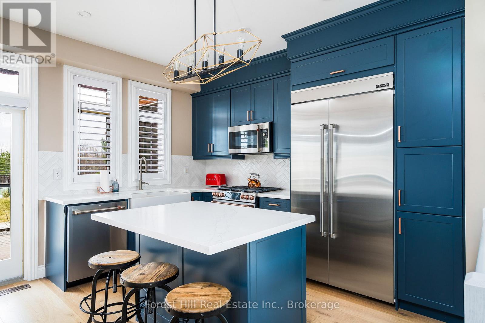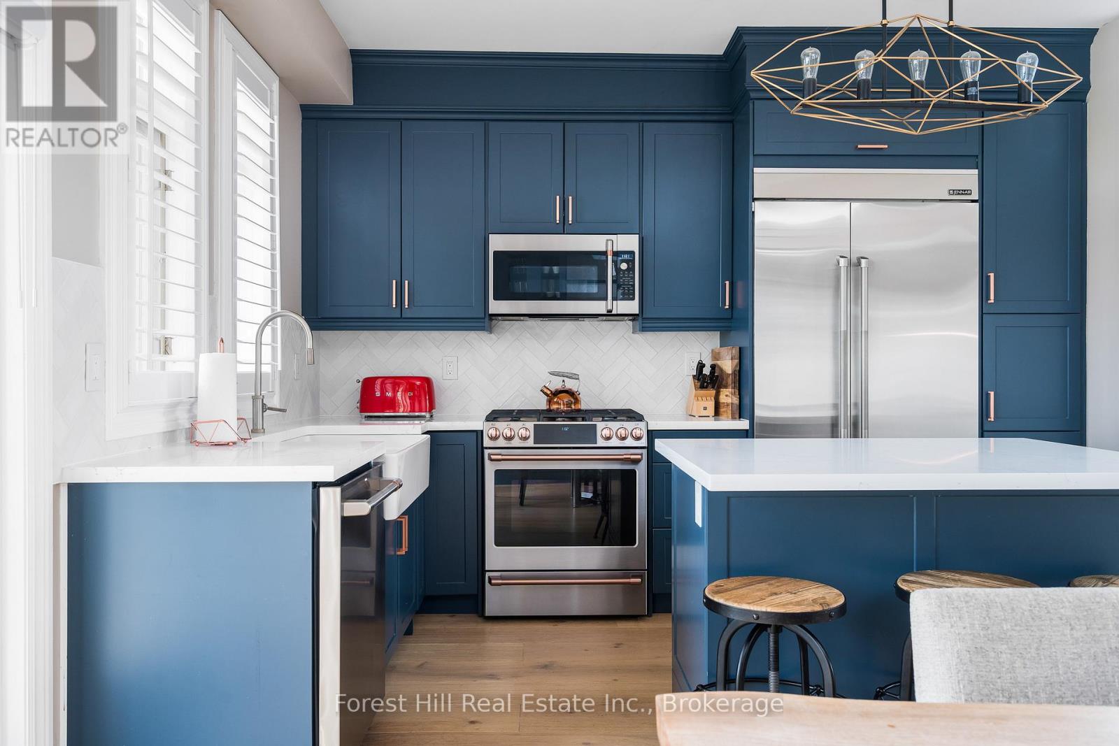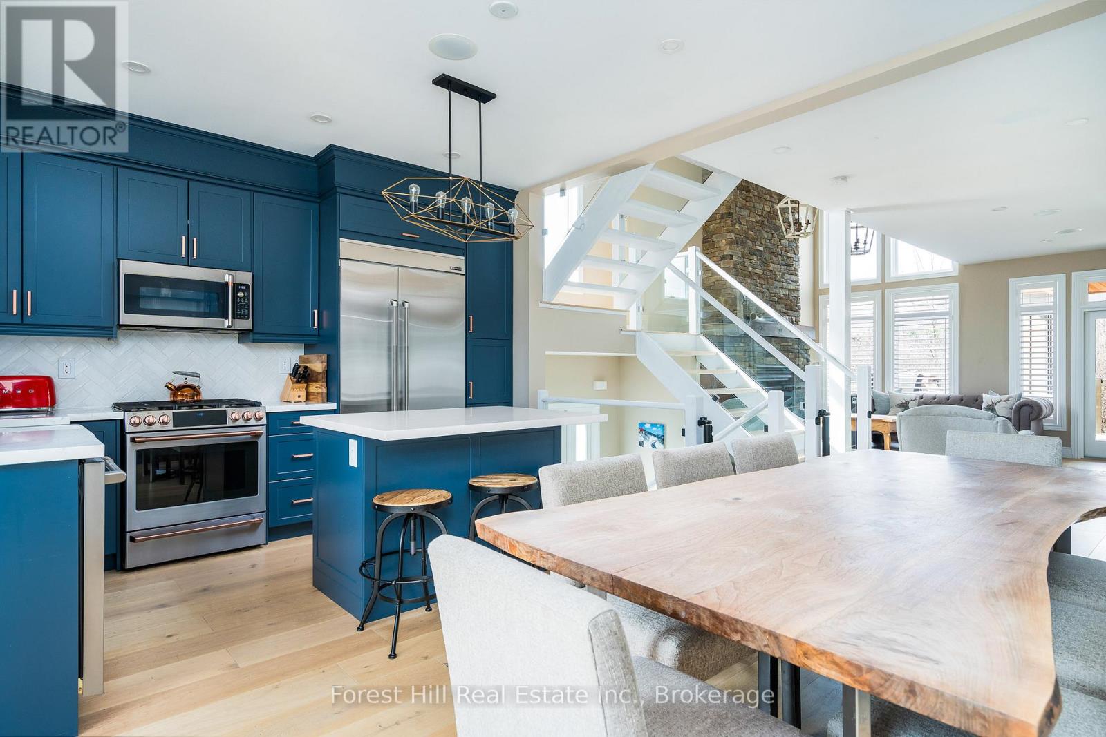 SUMMER SEASONAL (June/July/August) lease available in Sierra Woodlands, a sought-after Blue Mountains community ideally located minutes from Blue Mountain Village, Craigleith Summer Club, Georgian Bay beaches, golf courses, and miles of hiking and biking trails. This bright end-unit chalet offers 4 bedrooms and 3.5 bathrooms with a spacious layout designed for comfortable summer living and entertaining. The main level features an open concept chef's kitchen with quartz countertops, a large island with built-in beverage fridge, and premium Café and Jenn-Air stainless steel appliances. The kitchen flows into the dining area where a wet bar and coffee station with built-in beverage and wine fridges add convenience for hosting. The great room is filled with natural light from expansive windows and features soaring ceilings, California shutters, and built-in Sonos speakers. A front deck just off the kitchen and dining area includes a BBQ for easy outdoor cooking, while the rear deck offers a private hot tub and peaceful mountain views. Upstairs, the primary suite features vaulted ceilings, mountain views, a walk-in closet, and a five-piece ensuite with double vanity and soaker tub. Two additional bedrooms and a full bathroom complete the upper level. The lower level includes a second primary bedroom with private four-piece ensuite, a comfortable family room, powder room, laundry room, and direct access to the attached two-car garage. Residents of Sierra Woodlands enjoy access to a seasonal outdoor pool, tennis court, and nearby trail network, making it easy to enjoy everything the area offers. Collingwood and Thornbury are a short drive or bike ride away for shopping, dining, and waterfront activities. Also available April, May and September through November at $3,300 per month. Tenant pays utilities. Hot tub maintenance available at tenant's expense (id:43681)