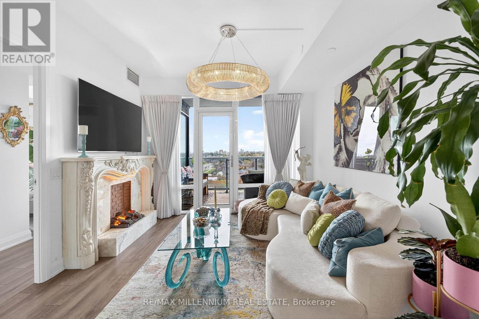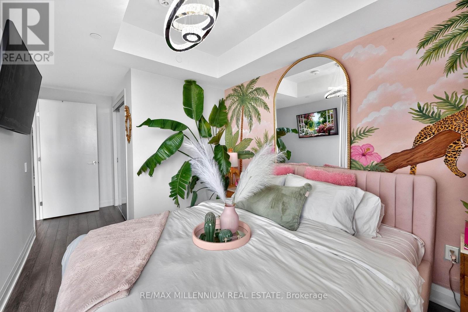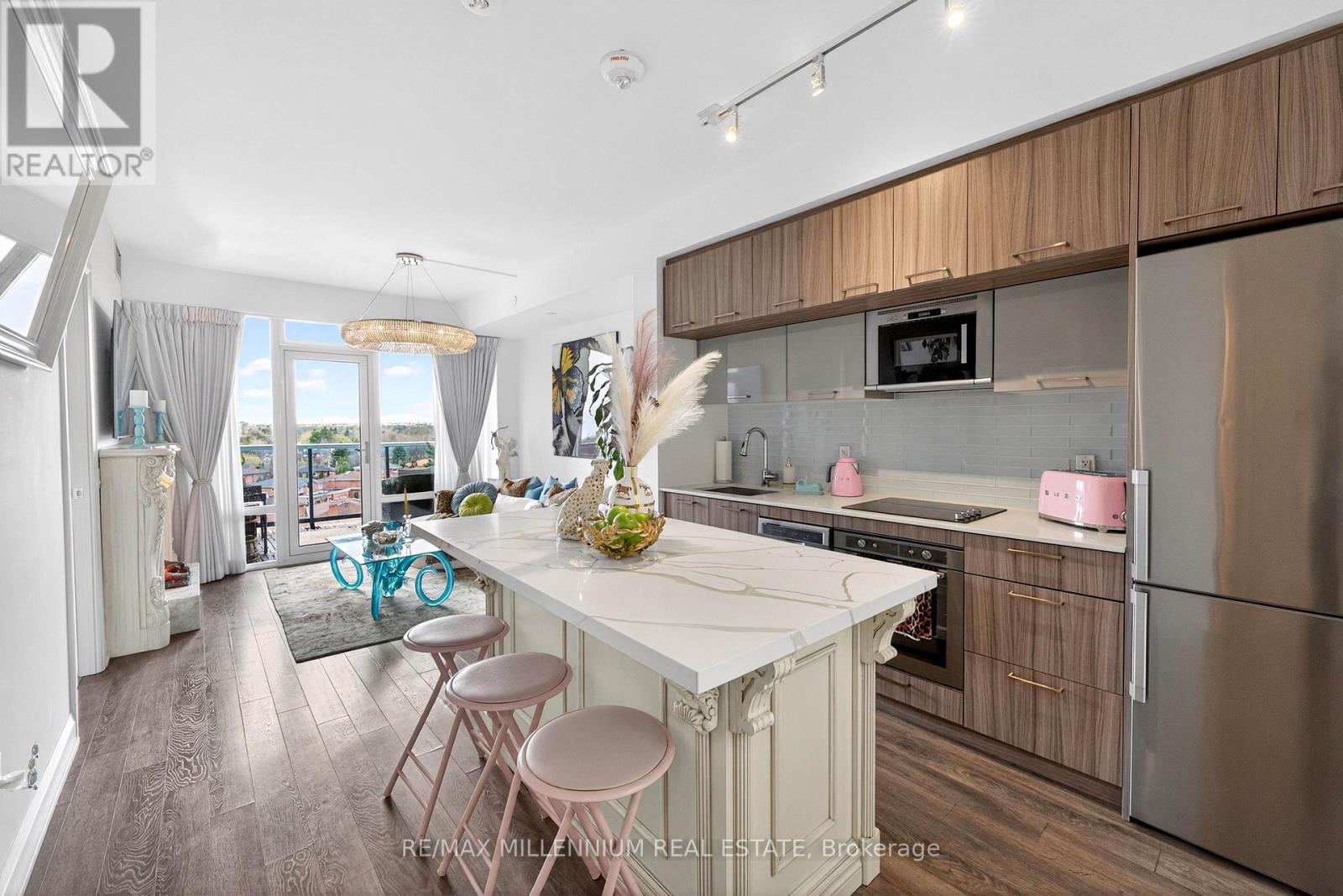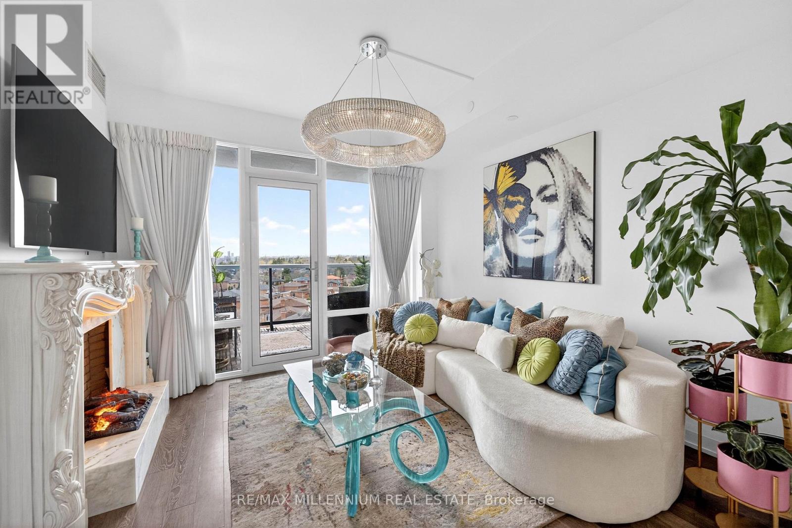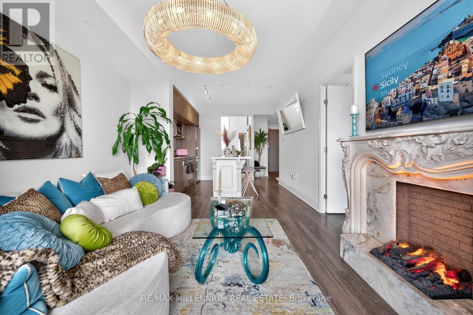 Welcome to Avenue on 7 Condos where style, personality, and lifestyle come together in this one-of-a-kind 2-bedroom suite offering 649 sq ft + 60 sq ft balcony. Unlike anything else in the building, this unit has been thoughtfully upgraded with over $30K in enhancements, creating a vibrant, designer-inspired space that truly stands out from the moment you walk in.The open-concept layout is both functional and inviting, filled with natural light from floor-to-ceiling windows and complemented by a bold, artistic aesthetic. A custom-upgraded kitchen island anchors the space, paired with sleek quartz countertops and built-in appliances perfect for both everyday living and entertaining. The living area is elevated with a stunning crystal chandelier and a modern water vapor fireplace, adding ambiance and style.The primary bedroom is a true standout, featuring a custom mural by an artist that brings character and creativity into the space, along with large windows and an airy feel. The second bedroom offers flexibility for guests, a home office, or additional living space.Step out onto your private balcony - a true vibe - overlooking the pool and offering the perfect summer escape right at home. With elevated views and a resort-like atmosphere, it feels like you're on vacation without ever leaving your space, making it the ultimate spot to unwind, entertain, or soak in warm summer evenings.This unit offers a rare blend of vibrant interior design and relaxing outdoor living. Residents enjoy access to premium, hotel-style amenities including a rooftop saltwater pool, cabanas, BBQ area, fitness centre, sauna, party room, games room, and more. Ideally located in the heart of Woodbridge with easy access to transit (Viva & Zum), major highways (400, 401, 407, 427),top-rated schools, parks, shopping, dining, and everyday essentials.This is not your typical condo, it's a statement. A space full of character, creativity, and elevated living (id:43681)