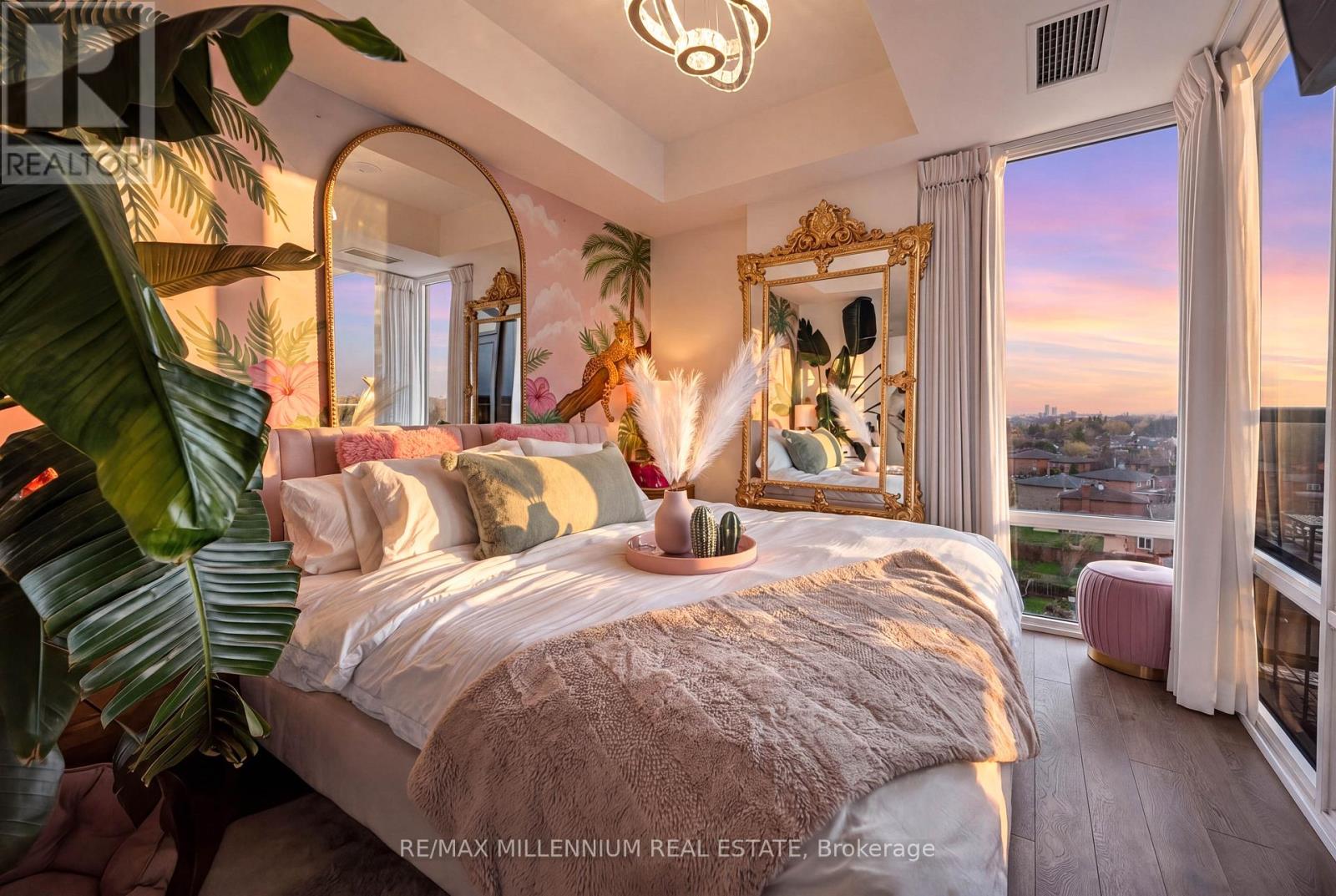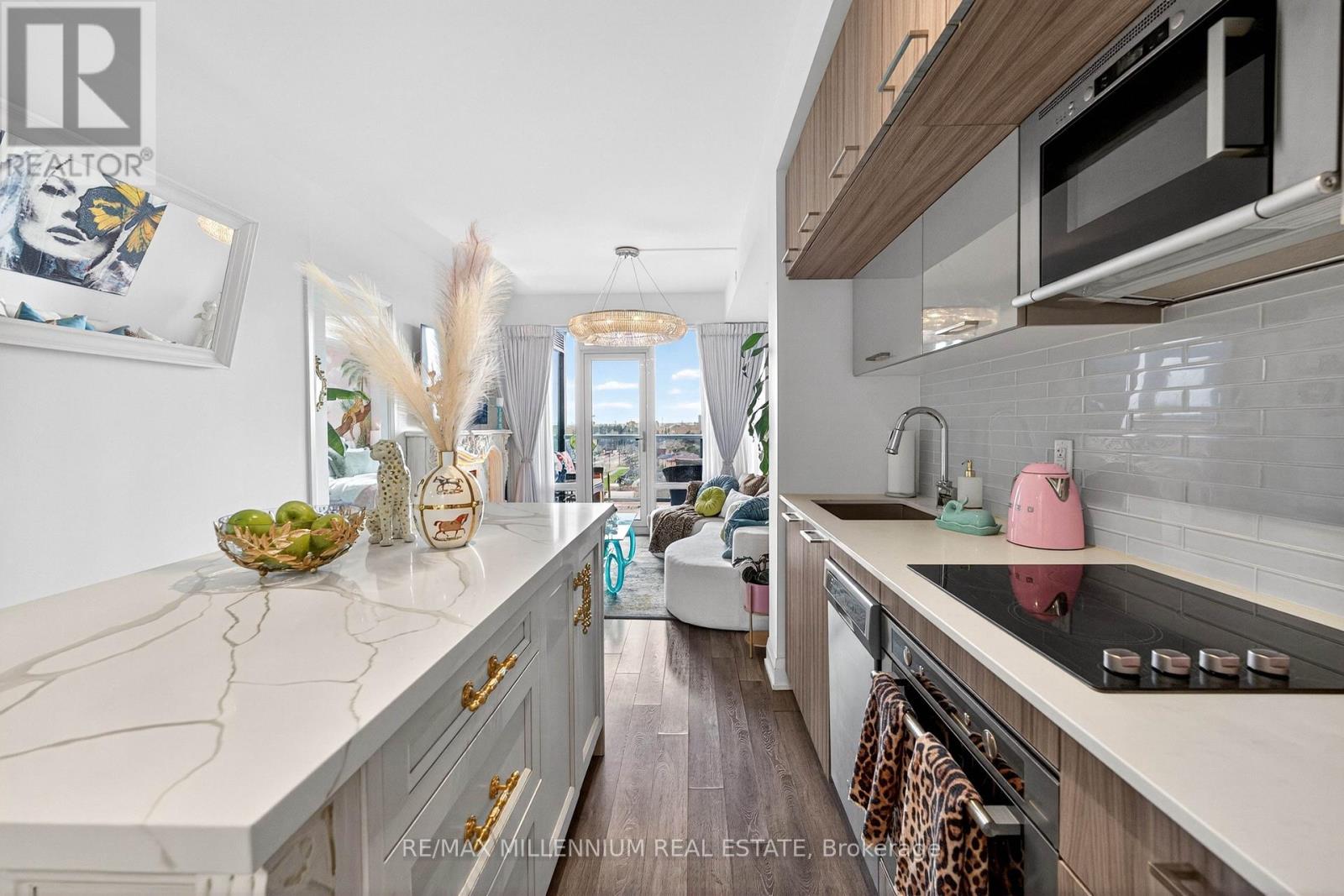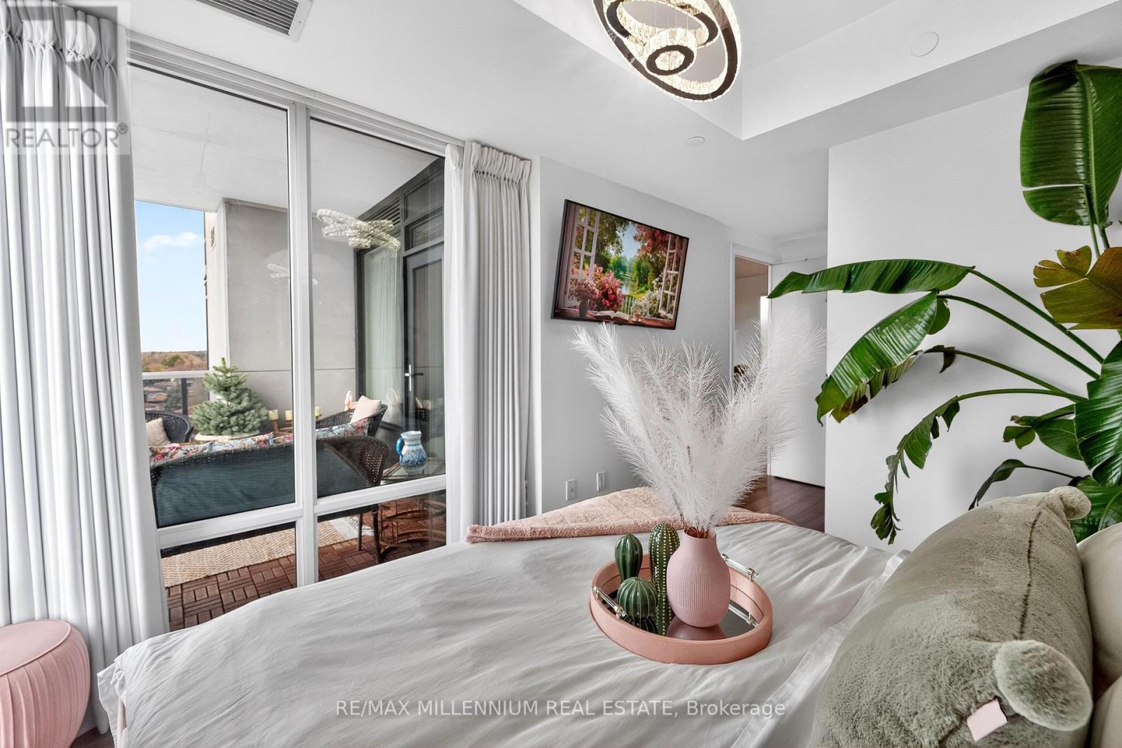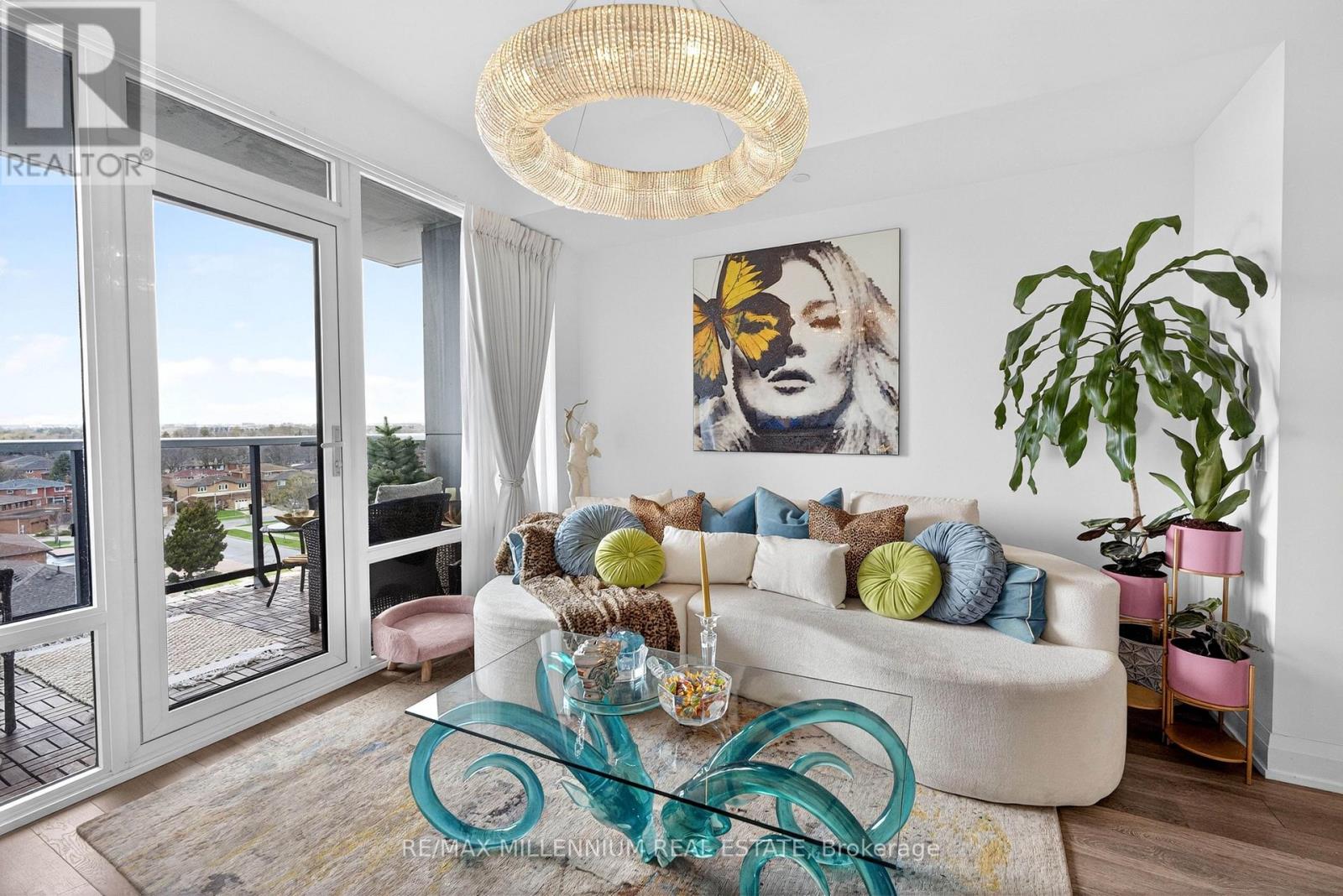 Welcome to Avenue on 7 Condos where style, personality, and lifestyle come together in this one-of-a-kind 2-bedroom suite offering 649 sq ft + 60 sq ft balcony. Unlike anything else in the building, this unit has been thoughtfully upgraded with over $30K in enhancements, creating a vibrant, designer-inspired space that truly stands out from the moment you walk in.The open-concept layout is both functional and inviting, filled with natural light from floor-to-ceiling windows and complemented by a bold, artistic aesthetic. A custom-upgraded kitchen island anchors the space, paired with sleek quartz countertops and built-in appliances perfect for both everyday living and entertaining. The living area is elevated with a stunning crystal chandelier and a modern water vapor fireplace, adding ambiance and style.The primary bedroom is a true standout, featuring a custom mural by an artist that brings character and creativity into the space, along with large windows and an airy feel. The second bedroom offers flexibility for guests, a home office, or additional living space.Step out onto your private balcony - a true vibe - overlooking the pool and offering the perfect summer escape right at home. With elevated views and a resort-like atmosphere, it feels like you're on vacation without ever leaving your space, making it the ultimate spot to unwind, entertain, or soak in warm summer evenings.This unit offers a rare blend of vibrant interior design and relaxing outdoor living. Residents enjoy access to premium, hotel-style amenities including a rooftop saltwater pool, cabanas, BBQ area, fitness centre, sauna, party room, games room, and more. Ideally located in the heart of Woodbridge with easy access to transit (Viva & Zum), major highways (400, 401, 407, 427),top-rated schools, parks, shopping, dining, and everyday essentials.This is not your typical condo, it's a statement. A space full of character, creativity, and elevated living (id:43681)