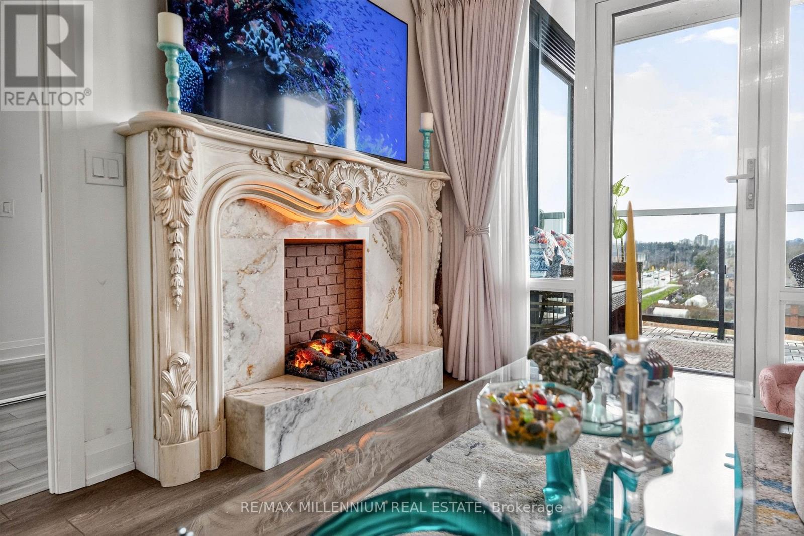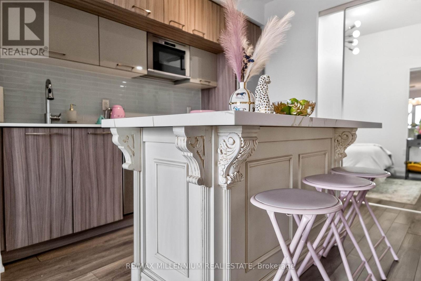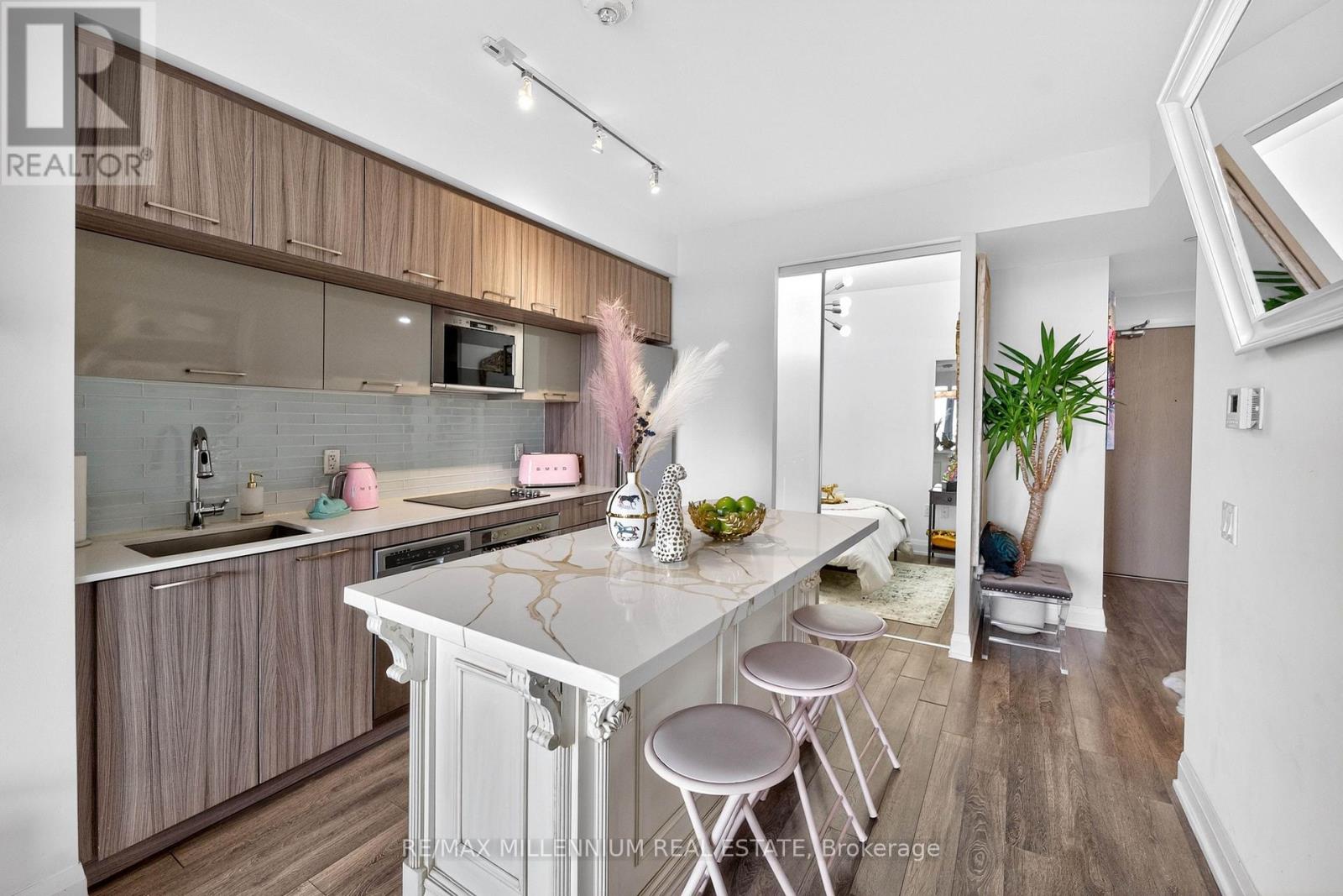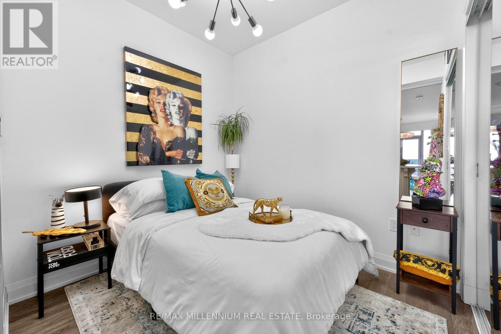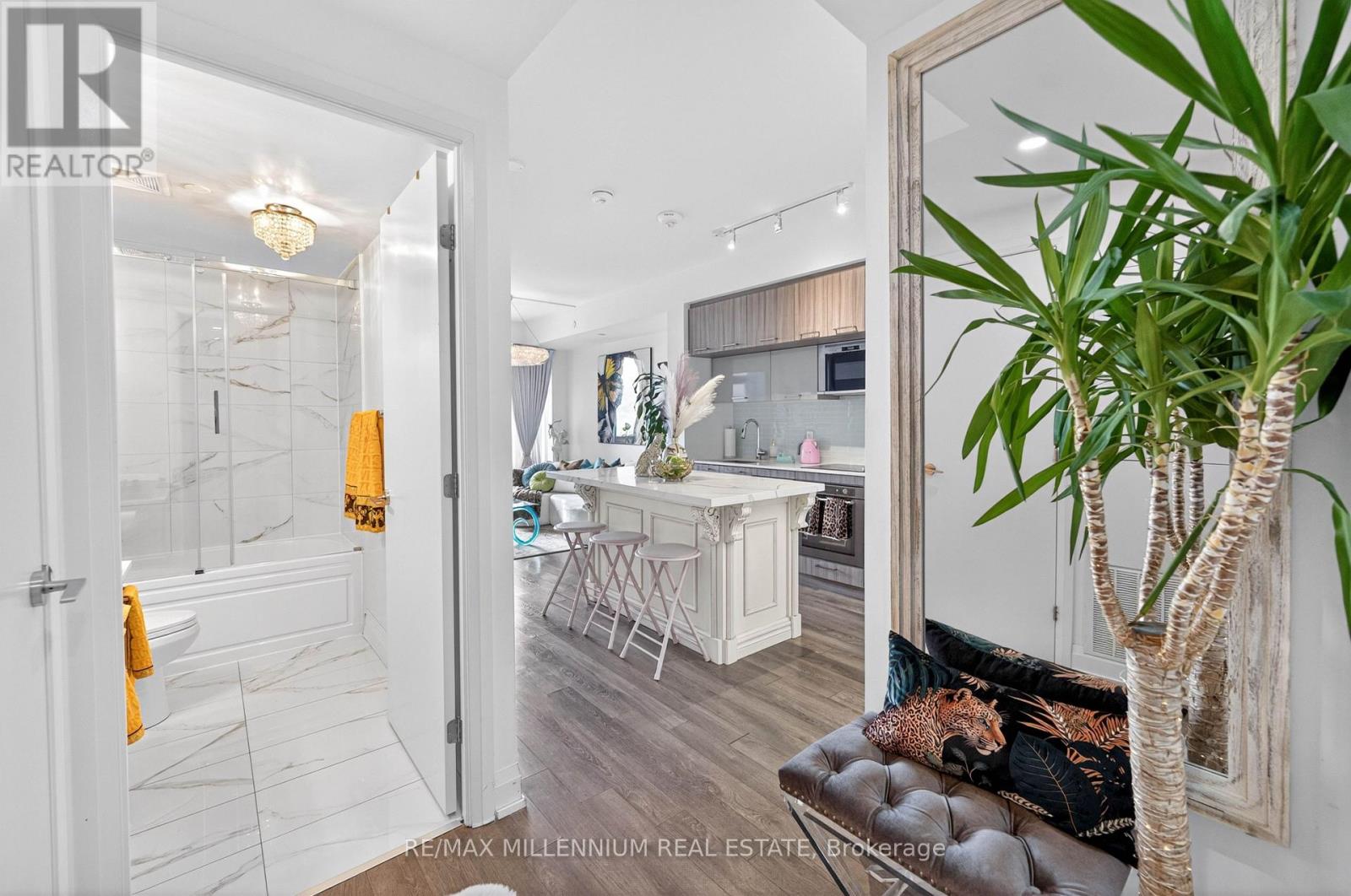 Welcome to Avenue on 7 Condos where style, personality, and lifestyle come together in this one-of-a-kind 2-bedroom suite offering 649 sq ft + 60 sq ft balcony. Unlike anything else in the building, this unit has been thoughtfully upgraded with over $30K in enhancements, creating a vibrant, designer-inspired space that truly stands out from the moment you walk in.The open-concept layout is both functional and inviting, filled with natural light from floor-to-ceiling windows and complemented by a bold, artistic aesthetic. A custom-upgraded kitchen island anchors the space, paired with sleek quartz countertops and built-in appliances perfect for both everyday living and entertaining. The living area is elevated with a stunning crystal chandelier and a modern water vapor fireplace, adding ambiance and style.The primary bedroom is a true standout, featuring a custom mural by an artist that brings character and creativity into the space, along with large windows and an airy feel. The second bedroom offers flexibility for guests, a home office, or additional living space.Step out onto your private balcony - a true vibe - overlooking the pool and offering the perfect summer escape right at home. With elevated views and a resort-like atmosphere, it feels like you're on vacation without ever leaving your space, making it the ultimate spot to unwind, entertain, or soak in warm summer evenings.This unit offers a rare blend of vibrant interior design and relaxing outdoor living. Residents enjoy access to premium, hotel-style amenities including a rooftop saltwater pool, cabanas, BBQ area, fitness centre, sauna, party room, games room, and more. Ideally located in the heart of Woodbridge with easy access to transit (Viva & Zum), major highways (400, 401, 407, 427),top-rated schools, parks, shopping, dining, and everyday essentials.This is not your typical condo, it's a statement. A space full of character, creativity, and elevated living (id:43681)