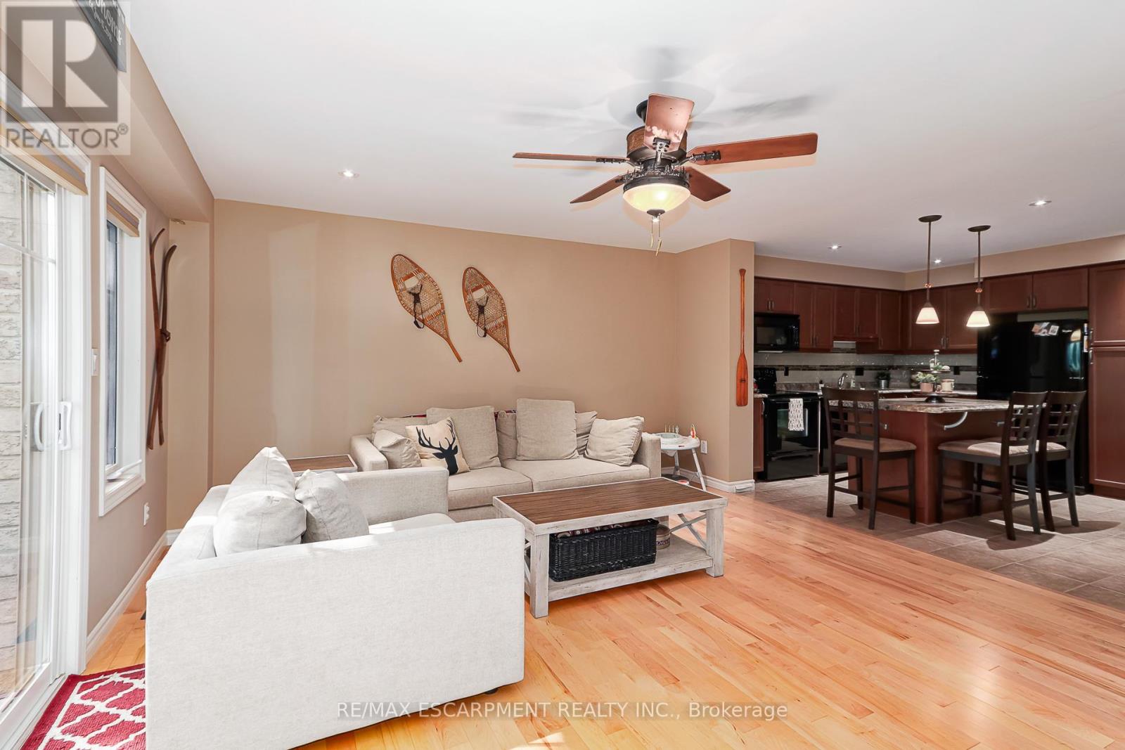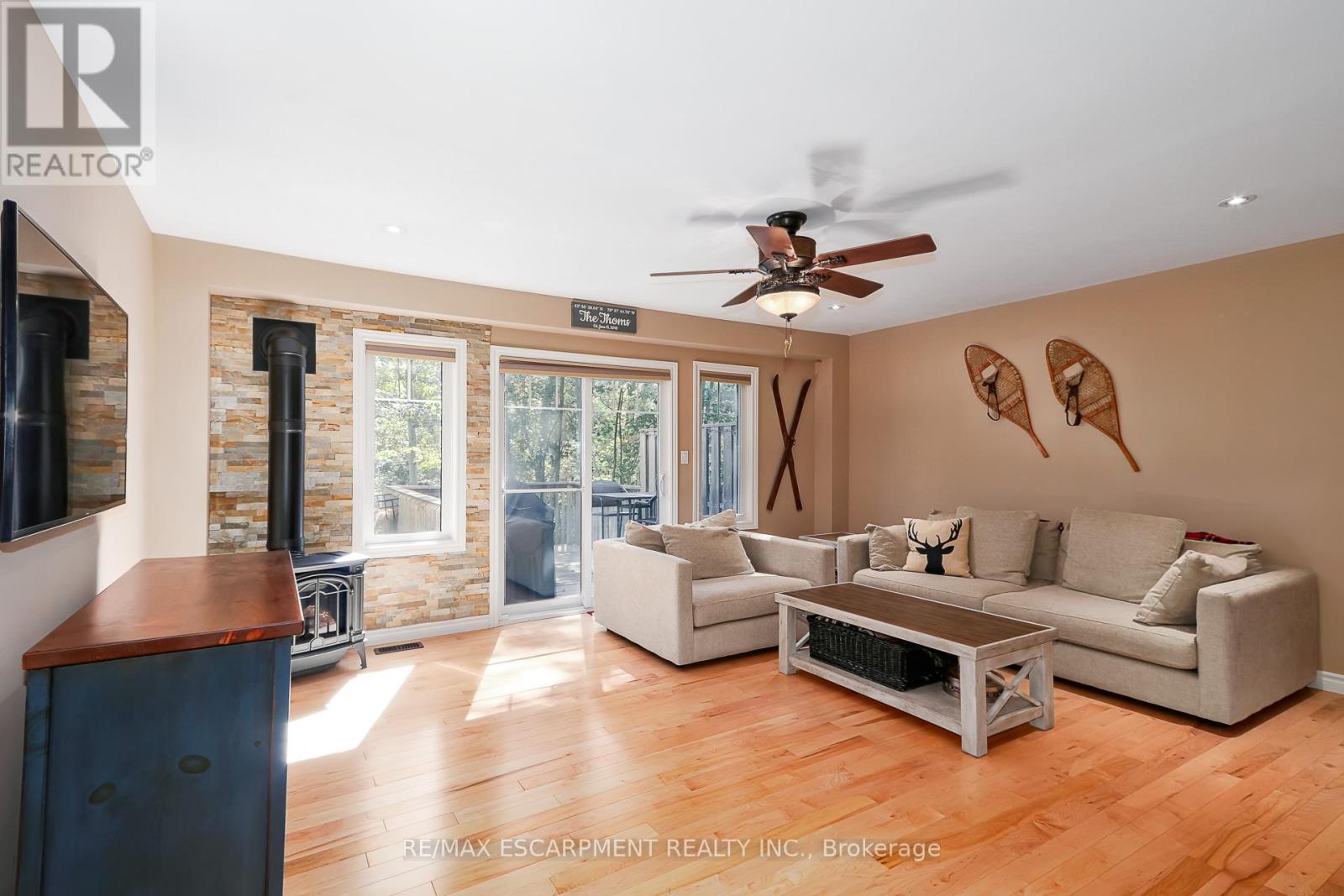 Welcome to this beautifully maintained 3-bedroom, 3.5-bath townhome, perfectly nestled in the desirable Silver Glen Preserve community. Backing onto tranquil, protected forest, this unit offers privacy and a serene setting just minutes from all that Collingwood and the Blue Mountains have to offer. Step inside to a bright, open-concept main floor featuring a spacious kitchen with a large island, and 2 gas BBQ hookups on the walk-out deck - ideal for easy outdoor entertaining. Enjoy hardwood flooring throughout the main living areas, ceramic tile in the kitchen and baths, and a cozy corner gas fireplace for chilly evenings. Upstairs, the spacious primary suite includes a private ensuite, with two additional bedrooms and a full bath completing the level. The finished lower level offers a spacious rec room and 3 pc bath. Comfort features include forced air natural gas heating, central A/C, central vacuum, and a whole-home humidifier. The deep garage with inside entry provides great storage and convenience. Silver Glen residents enjoy access to a fantastic recreation centre with a gym, party room, games room, and outdoor in-ground pool. With low condo fees, a welcoming community, and visitor parking, this home is perfect as a full-time residence or weekend chalet. Enjoy the 4-season lifestyle with Cranberry Golf Course just steps away, and easy access to ski hills, Georgian Bay, trails, and downtown Collingwood. Come live, play, and relax in Silver Glen Preserve! (id:43681)