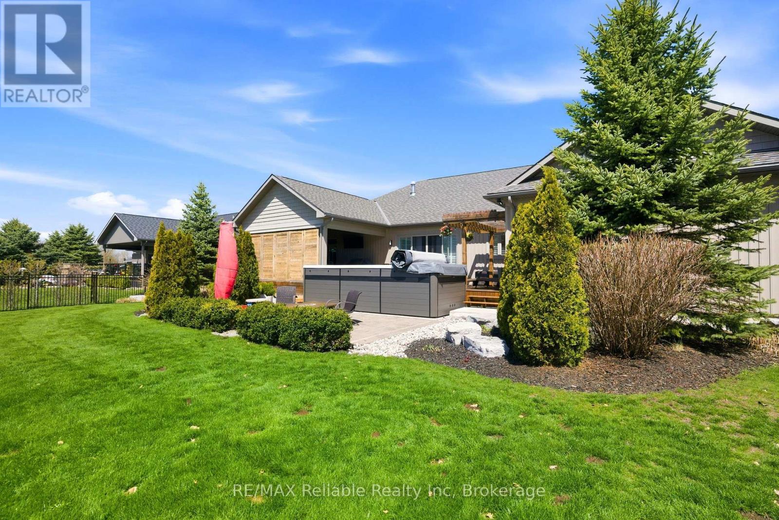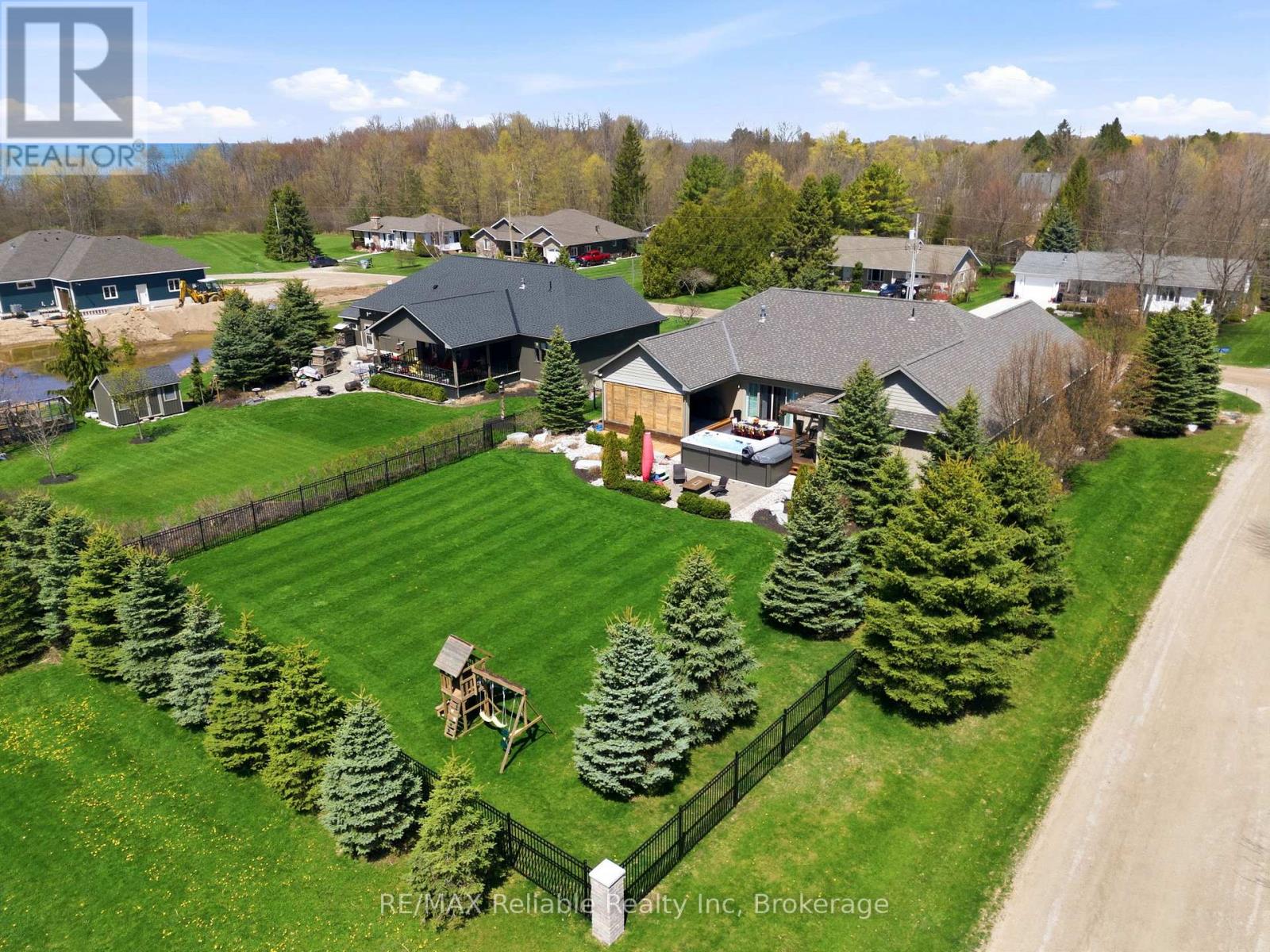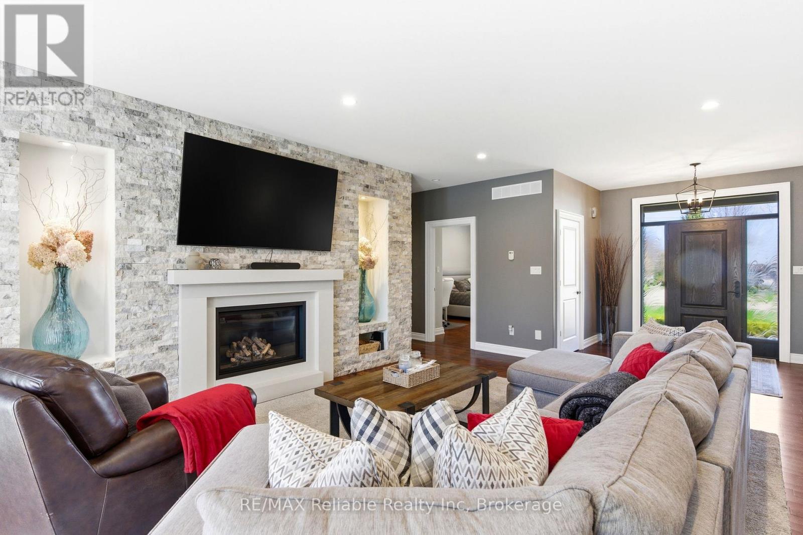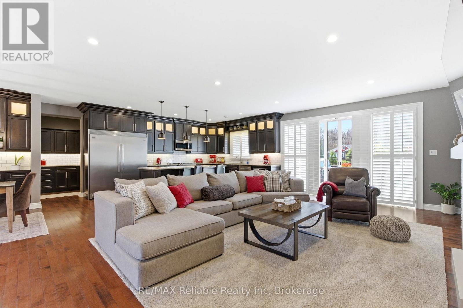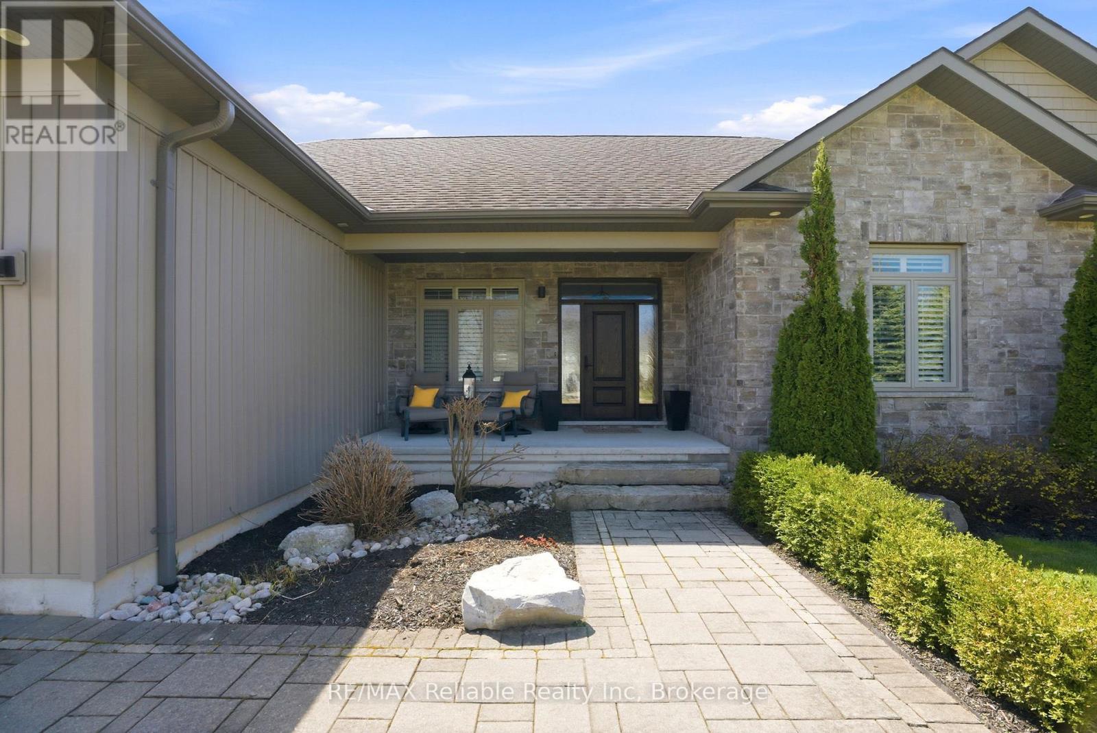 ABSOLUTELY STUNNING HOME LOCATED BETWEEN BAYFIELD & GRAND BEND! Nestled in a desirable lakeside subdivision, this exceptional 2013-built home offers approximatelly 2000 sq. ft. of beautifully designed main floor living space. Featuring a practical open-concept layout with hardwood flooring, nine-foot ceilings, and California shutters throughout, this home blends comfort and style seamlessly.The stunning kitchen is a chef's dream with abundant cabinetry, granite countertops, a large island, and oversized stainless steel appliances. The cozy dining area is perfect for entertaining and flows into the inviting living room, complete with a gas fireplace and terrace doors leading to the backyard.The spacious primary suite is a true retreat, offering a large walk-in closet, luxurious ensuite, and access to a private covered deck. The main floor also includes (2) bathrooms plus a generous laundry room with direct access to the garage.The fully finished lower level features in-floor heating, a custom bar area, expansive family and games room with pool table, two additional bedrooms, a bathroom, and an exercise room. Additional features include natural gas heating, central air, central vacuum, fibre internet, municipal water, municipal road access, and a natural gas standby generator.The charming stone exterior is complemented by impeccable landscaping with mature trees, black fencing, an interlock driveway, covered front porch, and rear decking ideal for outdoor entertaining. An attached double garage plus "man-cave" area for your collector cars & toys. Enjoy a short walk through the woods to a wide sandy beach & some of the best sunsets in the world. Short drive to Bayfield's shops, restaurants, golf courses, wineries, and craft breweries. High standards and modern luxury living near the beach! (id:43681)