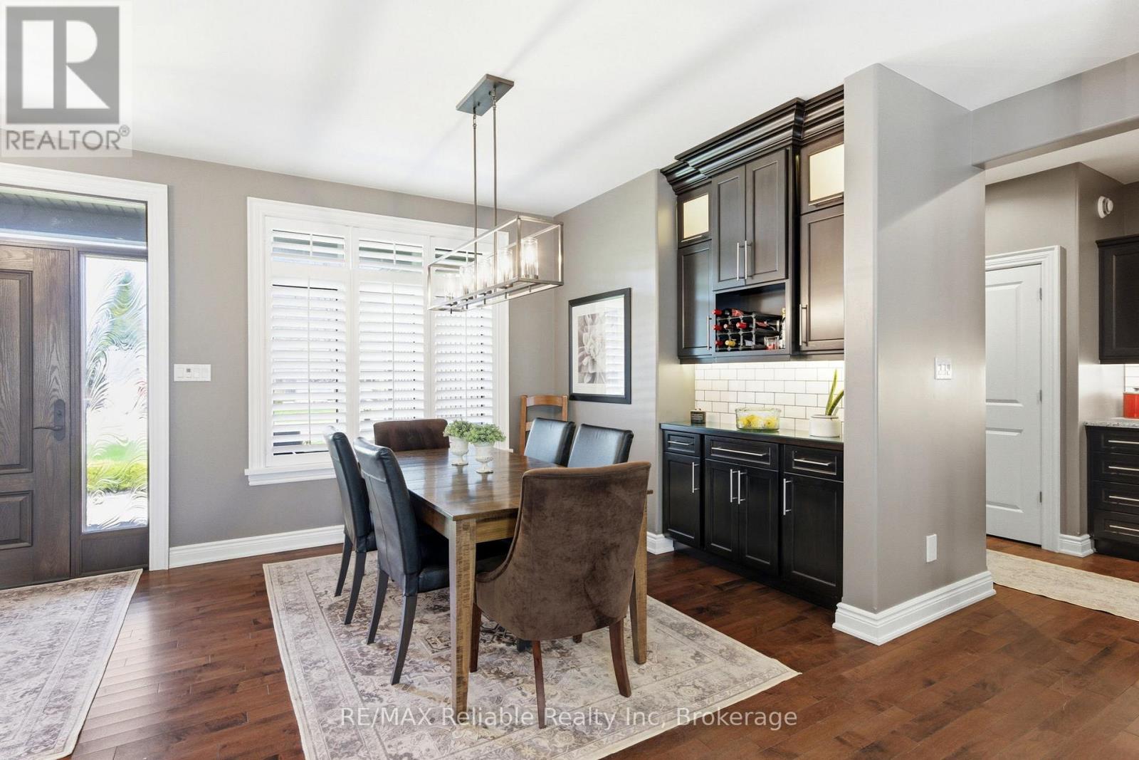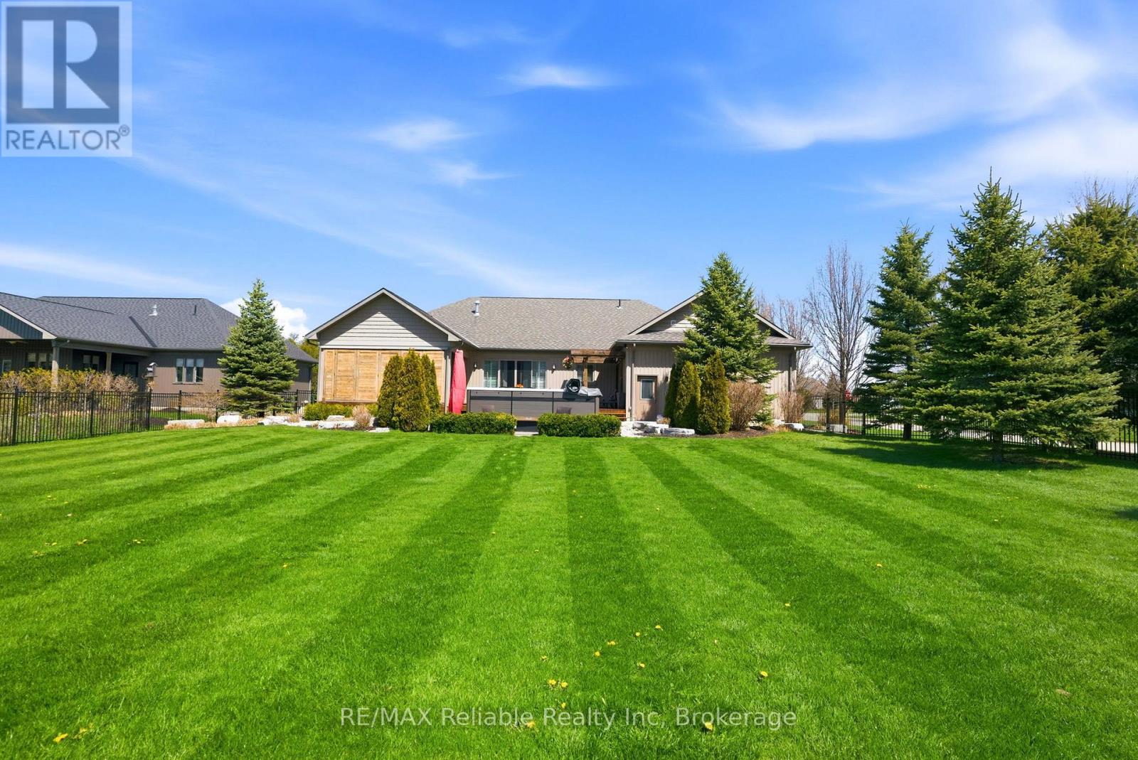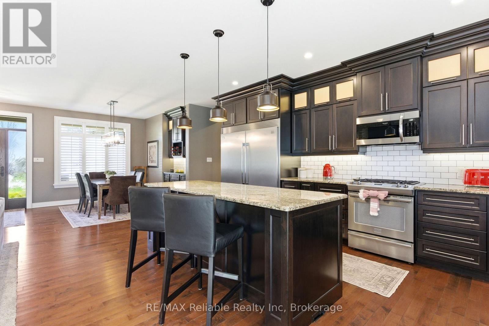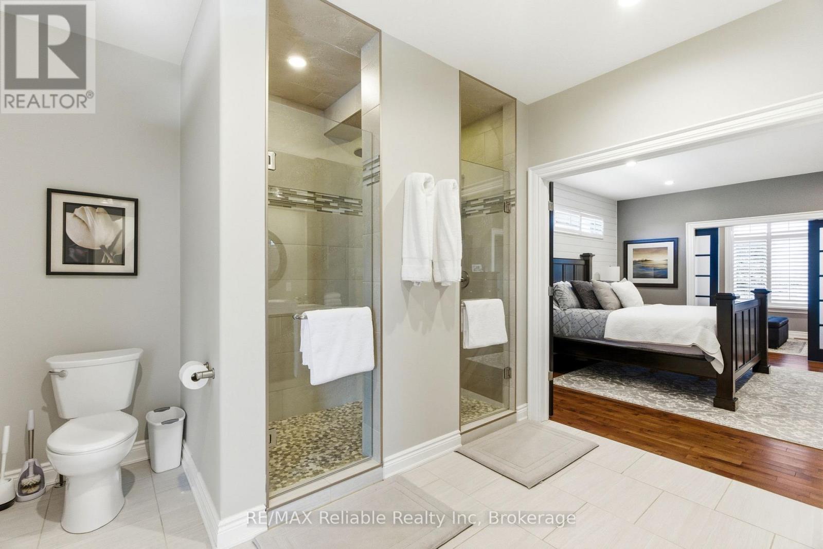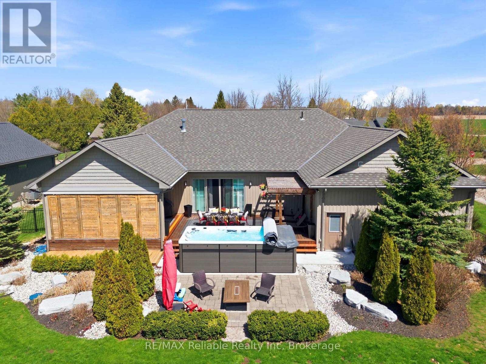 ABSOLUTELY STUNNING HOME LOCATED BETWEEN BAYFIELD & GRAND BEND! Nestled in a desirable lakeside subdivision, this exceptional 2013-built home offers approximatelly 2000 sq. ft. of beautifully designed main floor living space. Featuring a practical open-concept layout with hardwood flooring, nine-foot ceilings, and California shutters throughout, this home blends comfort and style seamlessly.The stunning kitchen is a chef's dream with abundant cabinetry, granite countertops, a large island, and oversized stainless steel appliances. The cozy dining area is perfect for entertaining and flows into the inviting living room, complete with a gas fireplace and terrace doors leading to the backyard.The spacious primary suite is a true retreat, offering a large walk-in closet, luxurious ensuite, and access to a private covered deck. The main floor also includes (2) bathrooms plus a generous laundry room with direct access to the garage.The fully finished lower level features in-floor heating, a custom bar area, expansive family and games room with pool table, two additional bedrooms, a bathroom, and an exercise room. Additional features include natural gas heating, central air, central vacuum, fibre internet, municipal water, municipal road access, and a natural gas standby generator.The charming stone exterior is complemented by impeccable landscaping with mature trees, black fencing, an interlock driveway, covered front porch, and rear decking ideal for outdoor entertaining. An attached double garage plus "man-cave" area for your collector cars & toys. Enjoy a short walk through the woods to a wide sandy beach & some of the best sunsets in the world. Short drive to Bayfield's shops, restaurants, golf courses, wineries, and craft breweries. High standards and modern luxury living near the beach! (id:43681)