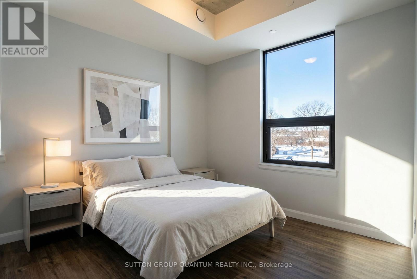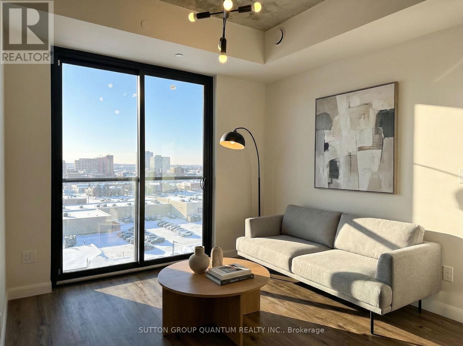 Welcome to Grand Bell Condos at 7 Erie Avenue, one of Brantford's most desirable addresses. This bright and well-designed 1-bedroom plus den, 1-bathroom suite offers functional open-concept living with soaring 9-foot ceilings and large windows that fill the space with natural light and showcase open north views over downtown. The contemporary kitchen features quartz countertops, stainless steel appliances, a large island ideal for dining or entertaining, and ample storage. The spacious living area flows seamlessly, creating an airy and comfortable atmosphere. The living room includes Juliet balcony doors bringing in even more light, while the versatile den provides the perfect flex space for a home office, guest room, or second bedroom. This unit also includes in-suite laundry, one covered parking space, and an owned storage locker for added convenience. Grand Bell Condos is a boutique-style building located in Brantford's first master-planned community, offering residents premium amenities including a rooftop terrace with BBQ area, fully equipped fitness center, stylish social lounge, co-working space, meeting room, and private party room. Steps to the Grand River and scenic trails, minutes to Laurier University, downtown Brantford, transit, shopping, and everyday conveniences including Fresh Co, Tim Hortons, The Beer Store, and Boston Pizza. An excellent opportunity for professionals, students, or investors seeking modern living in a growing and well-connected community. Very attractive DISCOUNTED price. (id:43681)