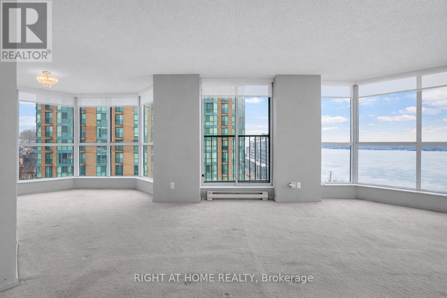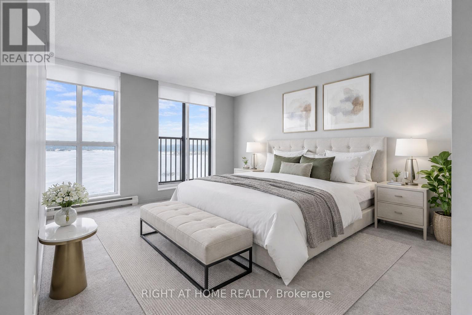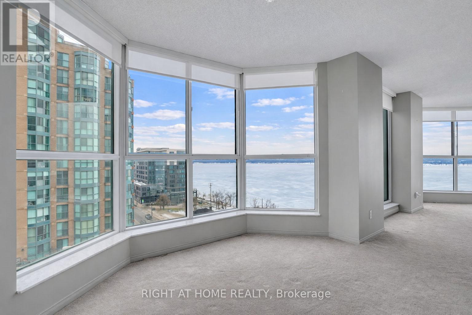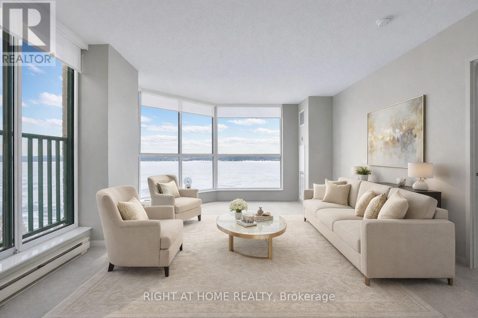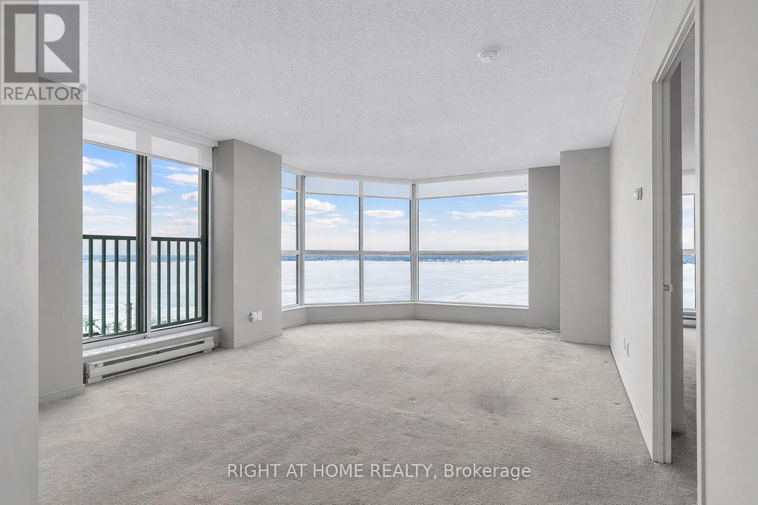 Welcome to this beautifully laid out 1,100 sq ft Renaissance front suite offering breathtaking panoramic views of Kempenfelt Bay from the 8th floor. Wake up to stunning sunrises and enjoy uninterrupted waterfront scenery right from your living space.This spacious 2-bedroom, 2-bathroom unit features a generous living room, a separate dining area, and a bright kitchen that overlooks the dining space - perfect for entertaining. The refreshed kitchen showcases crisp white cabinetry and matching appliances, with plenty of counter space and storage throughout.The primary bedroom includes a full 4-piece ensuite, while the second bathroom features a convenient walk-in shower. Two tandem parking spaces and a locker are included for added value and convenience.Residents enjoy exceptional amenities including an indoor pool, hot tub, sauna, fitness centre, party room, games room, and a vibrant calendar of social activities. The building also offers on-site management, a superintendent, dual elevators, and visitor parking. Maintenance fees cover heat, hydro, water, parking, and all common elements - making for truly carefree living.Ideally situated within walking distance to downtown, the beach, marina, scenic walking and biking trails, the GO Station, restaurants, shopping, and year-round festivals. A prime central location close to everything you need. (id:43681)