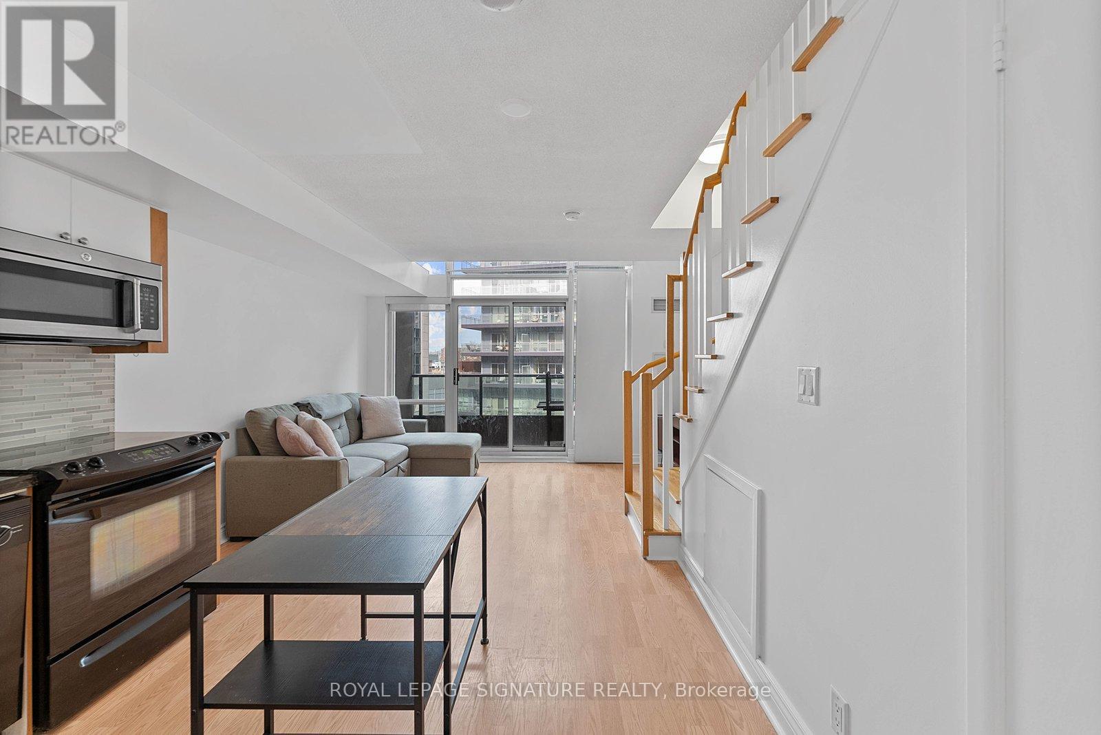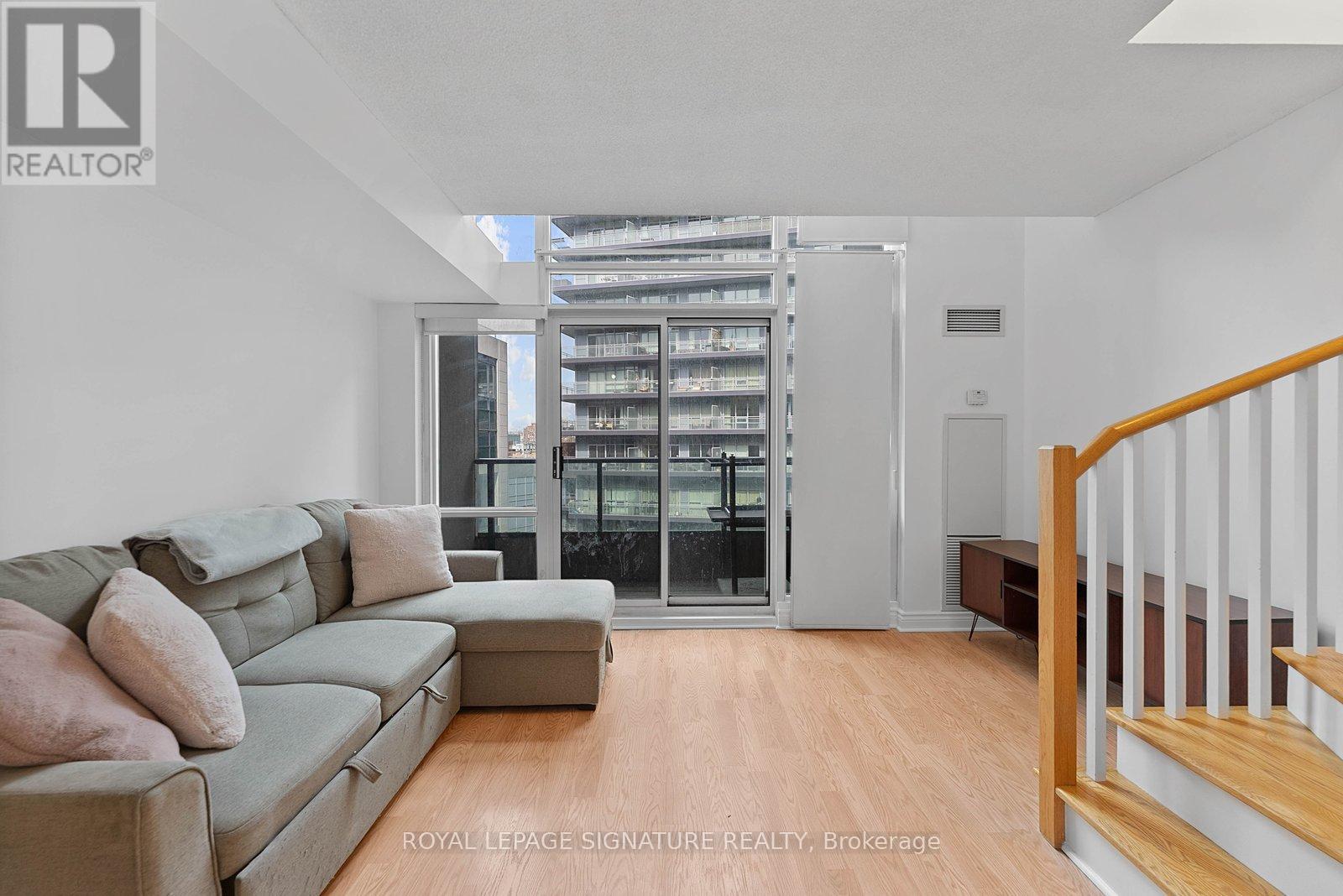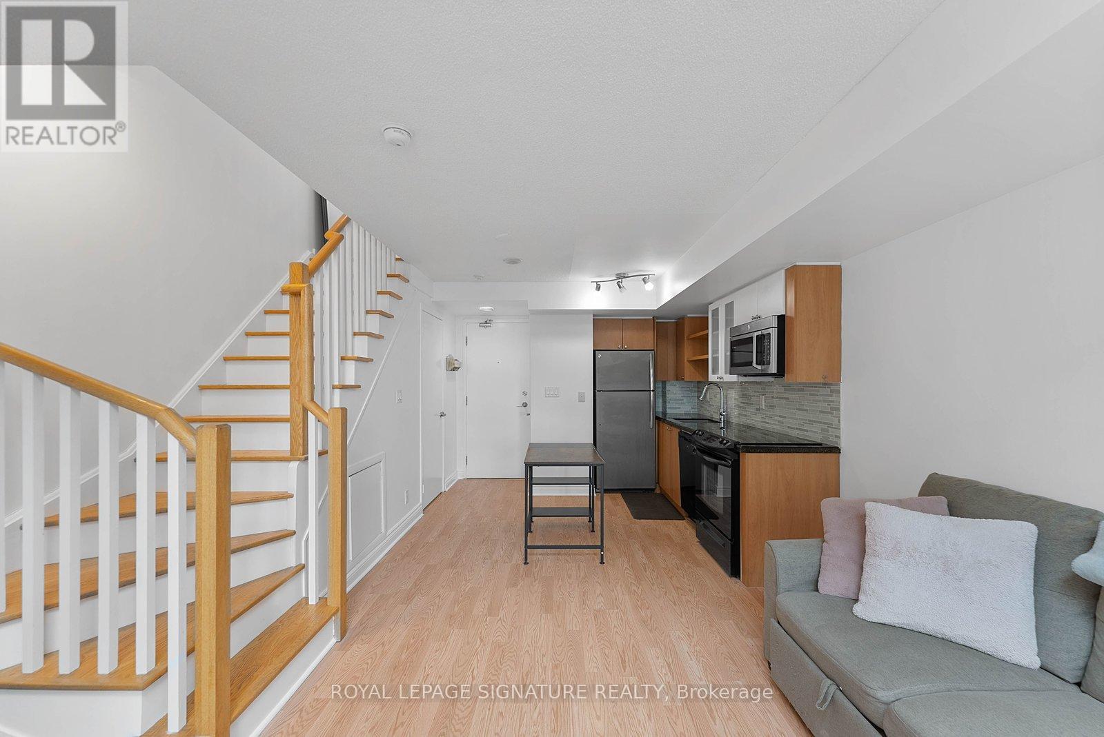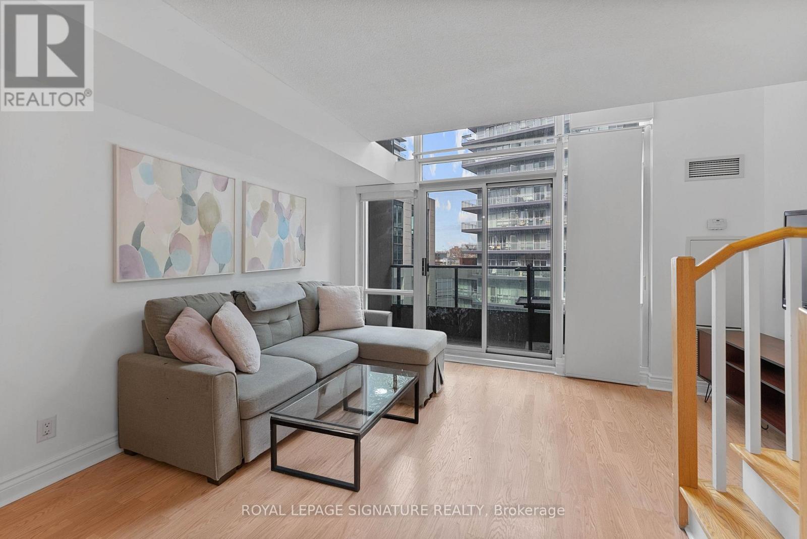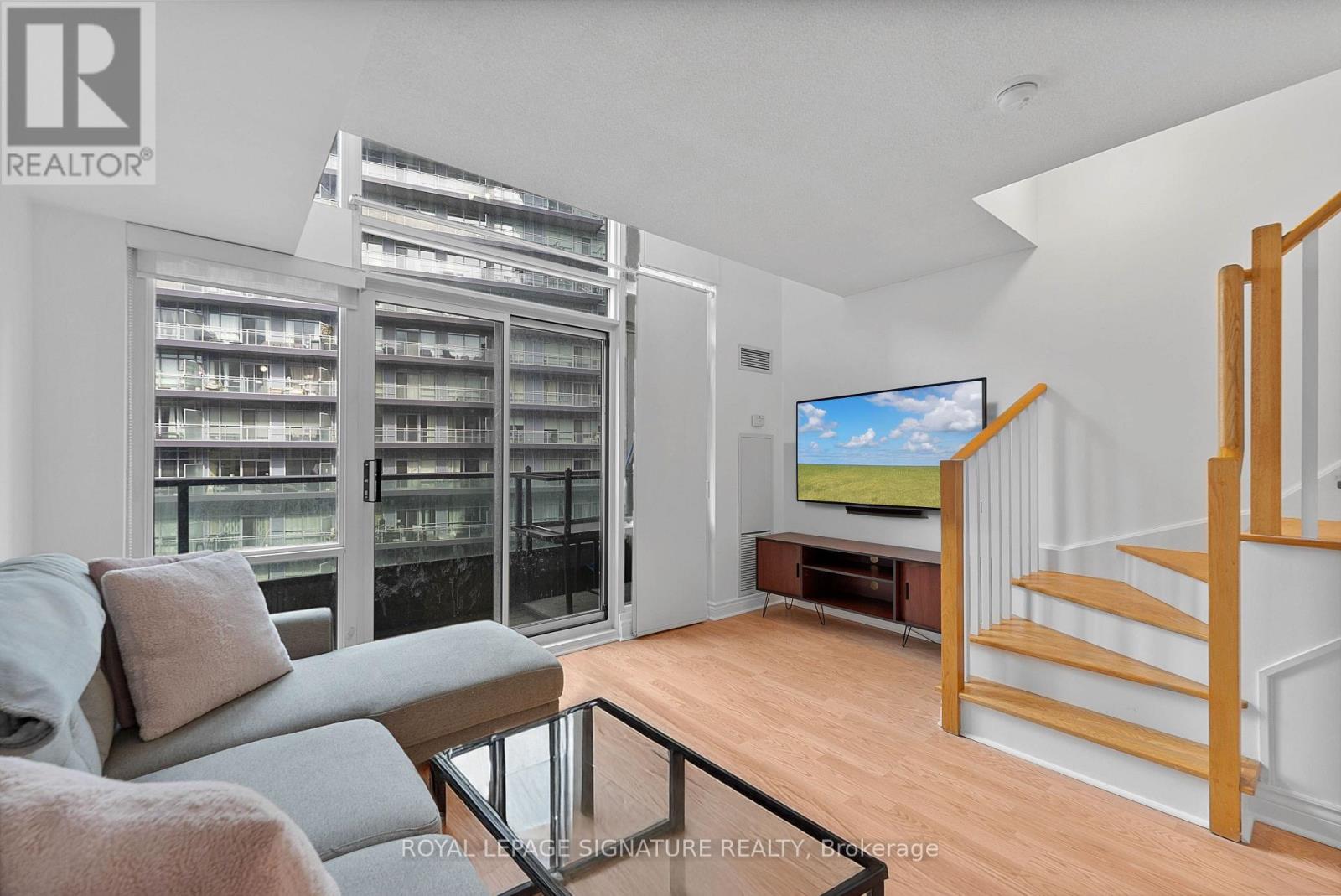 Turn-key and freshly painted, this bright two-storey suite offers a functional layout and exceptional natural light. The kitchen is generously sized and overlooking the living room, creating an open and connected main living space . The living room features a walk-out to the balcony and dramatic two-storey, floor-to-ceiling windows that fill the suite with natural light. A convenient 2-piece powder room completes the main level. Upstairs, the spacious bedroom includes in-suite laundry and a private ensuite bath, offering a comfortable and practical retreat. Ideally located close to everyday amenities, with Loblaws across the street and the Fleet streetcar at your doorstep. Enjoy being minutes from the waterfront and green space at Coronation Park. Parking and locker included. (id:43681)