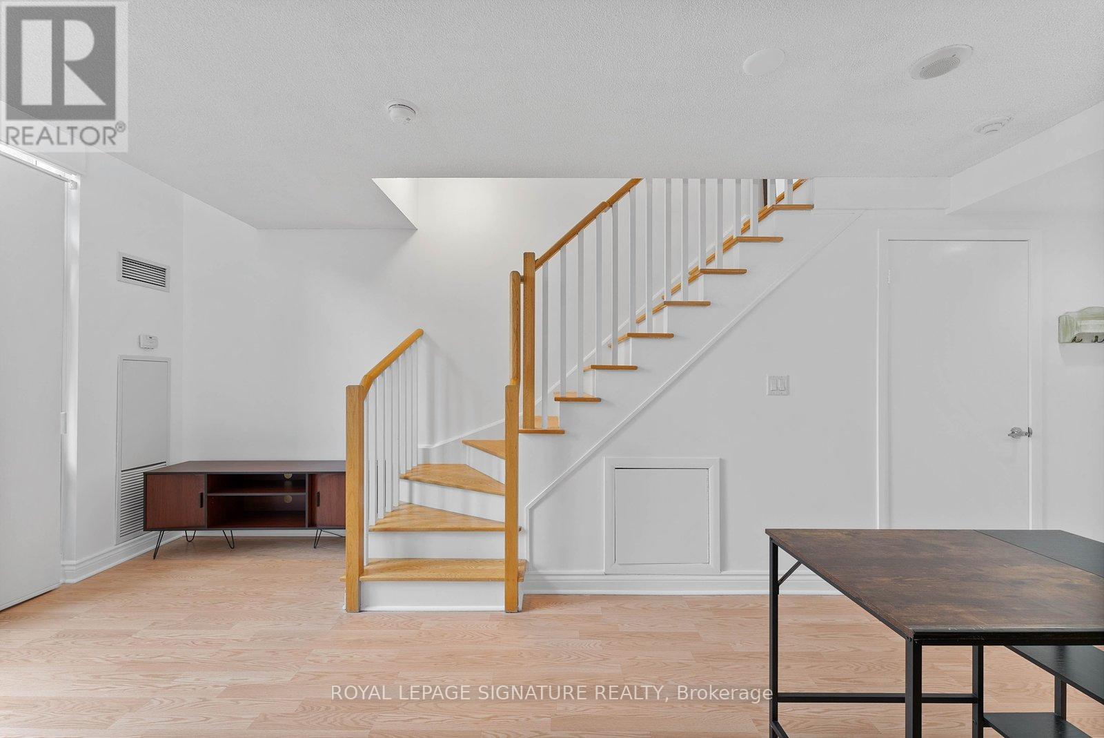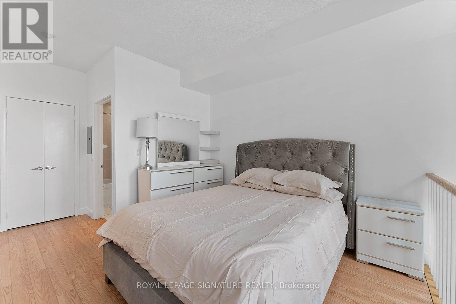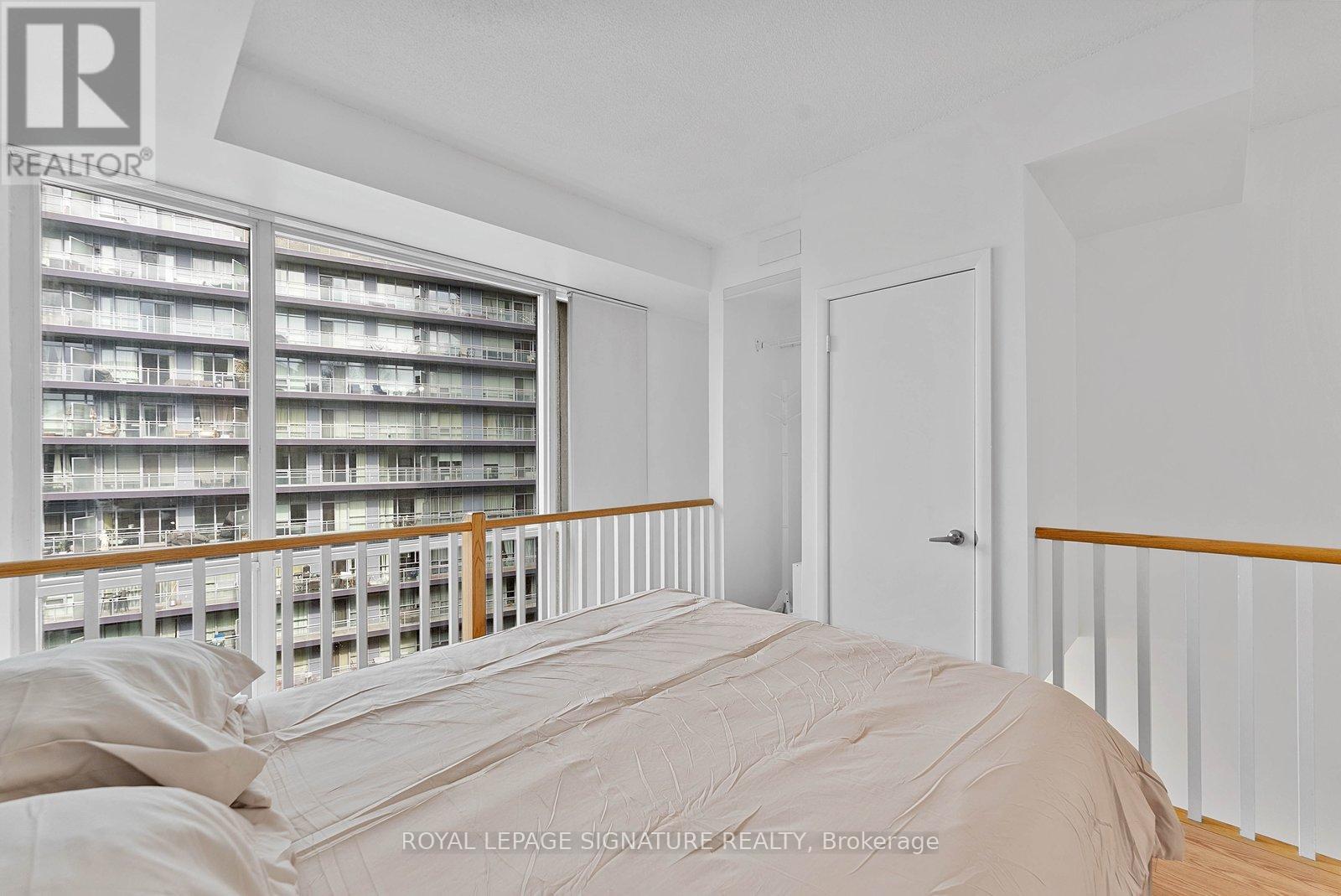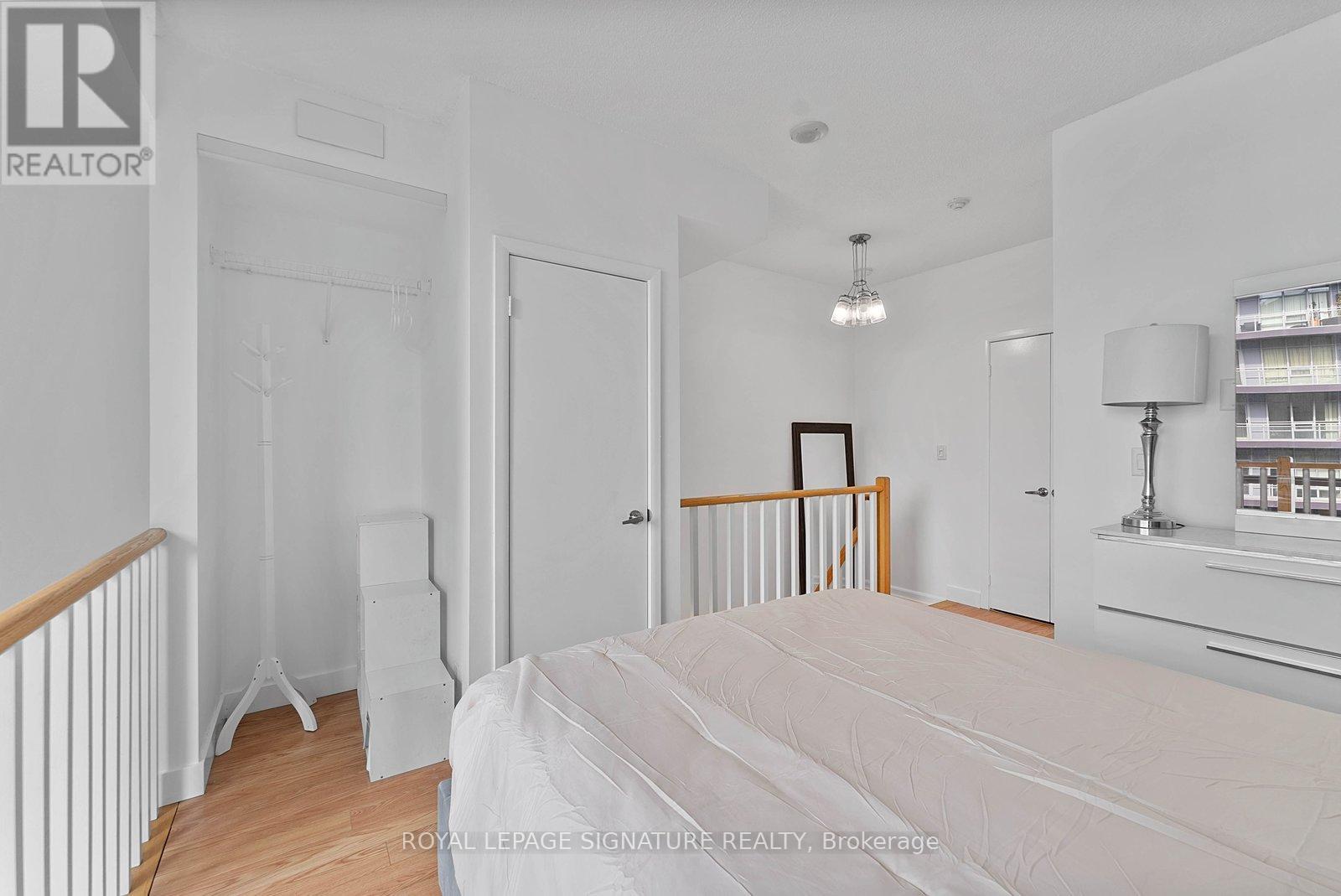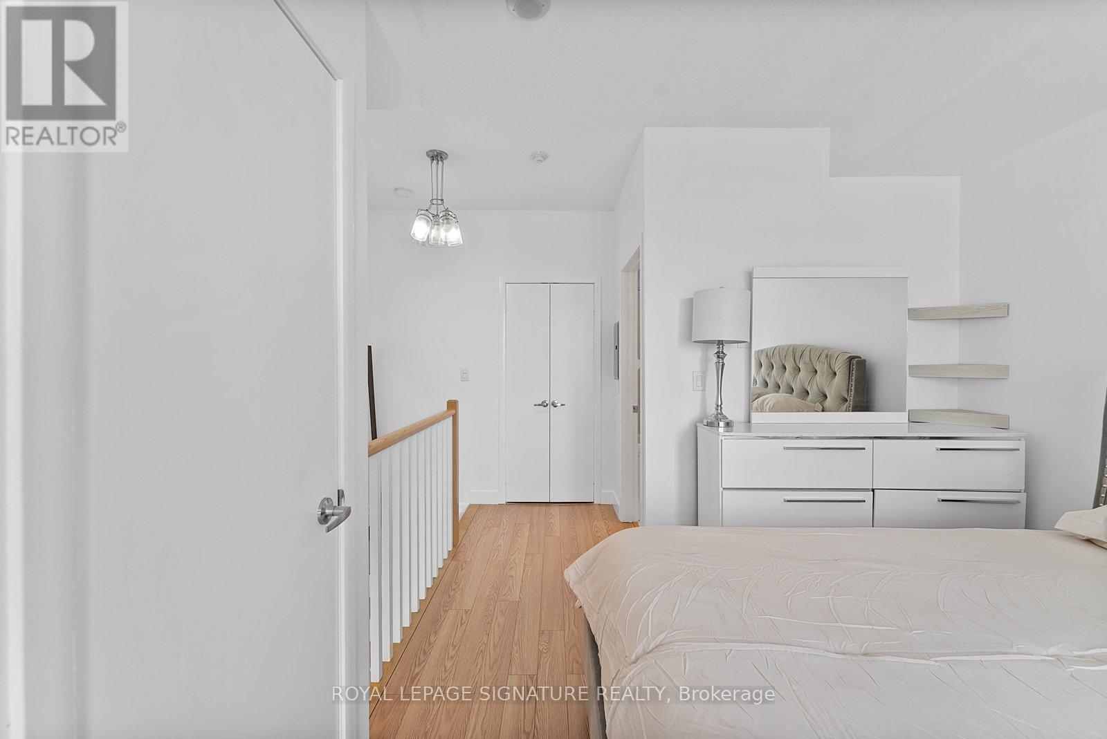 Turn-key and freshly painted, this bright two-storey suite offers a functional layout and exceptional natural light. The kitchen is generously sized and overlooking the living room, creating an open and connected main living space . The living room features a walk-out to the balcony and dramatic two-storey, floor-to-ceiling windows that fill the suite with natural light. A convenient 2-piece powder room completes the main level. Upstairs, the spacious bedroom includes in-suite laundry and a private ensuite bath, offering a comfortable and practical retreat. Ideally located close to everyday amenities, with Loblaws across the street and the Fleet streetcar at your doorstep. Enjoy being minutes from the waterfront and green space at Coronation Park. Parking and locker included. (id:43681)