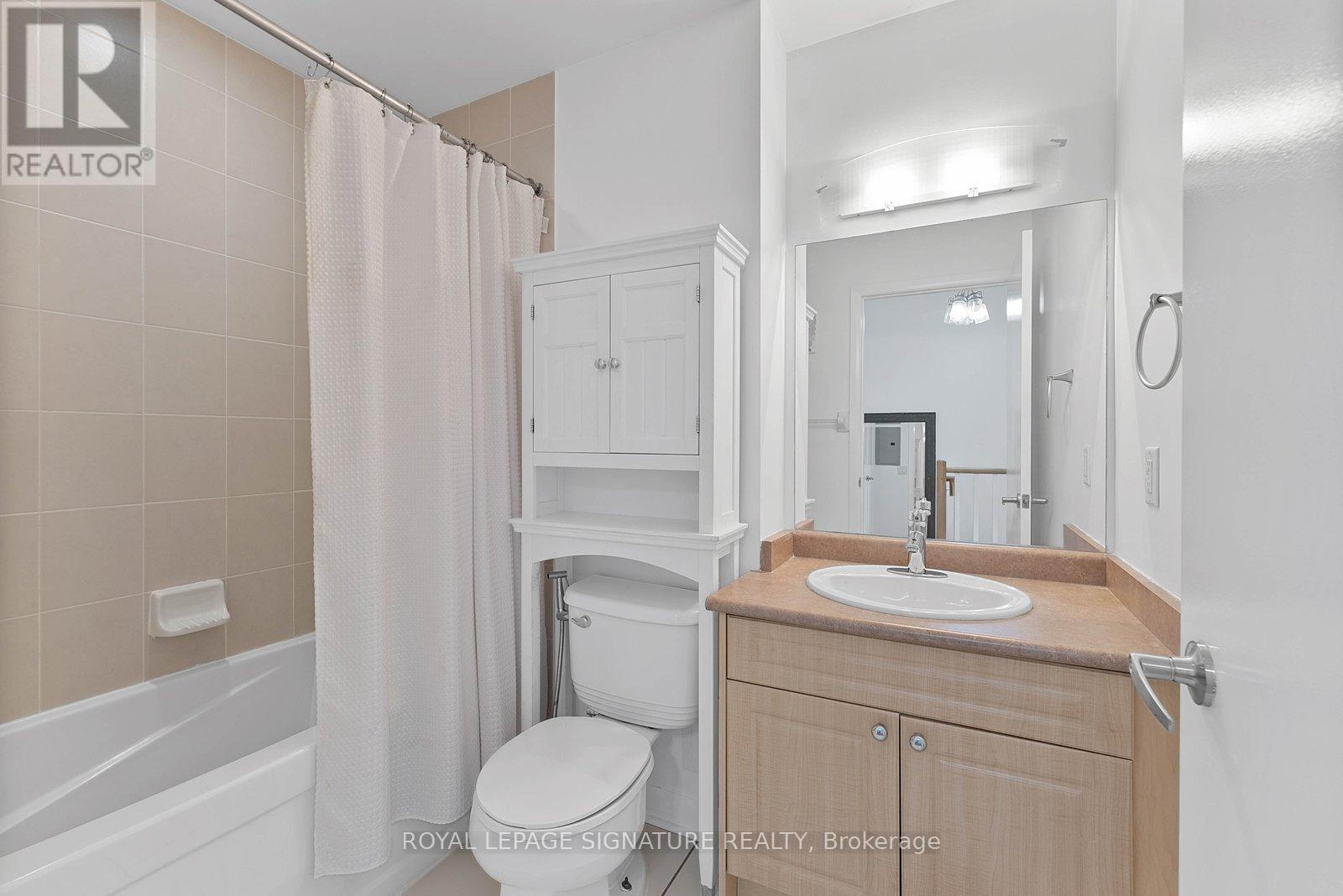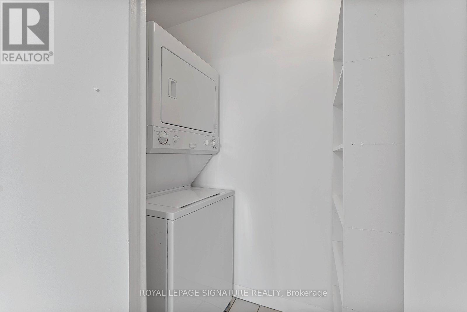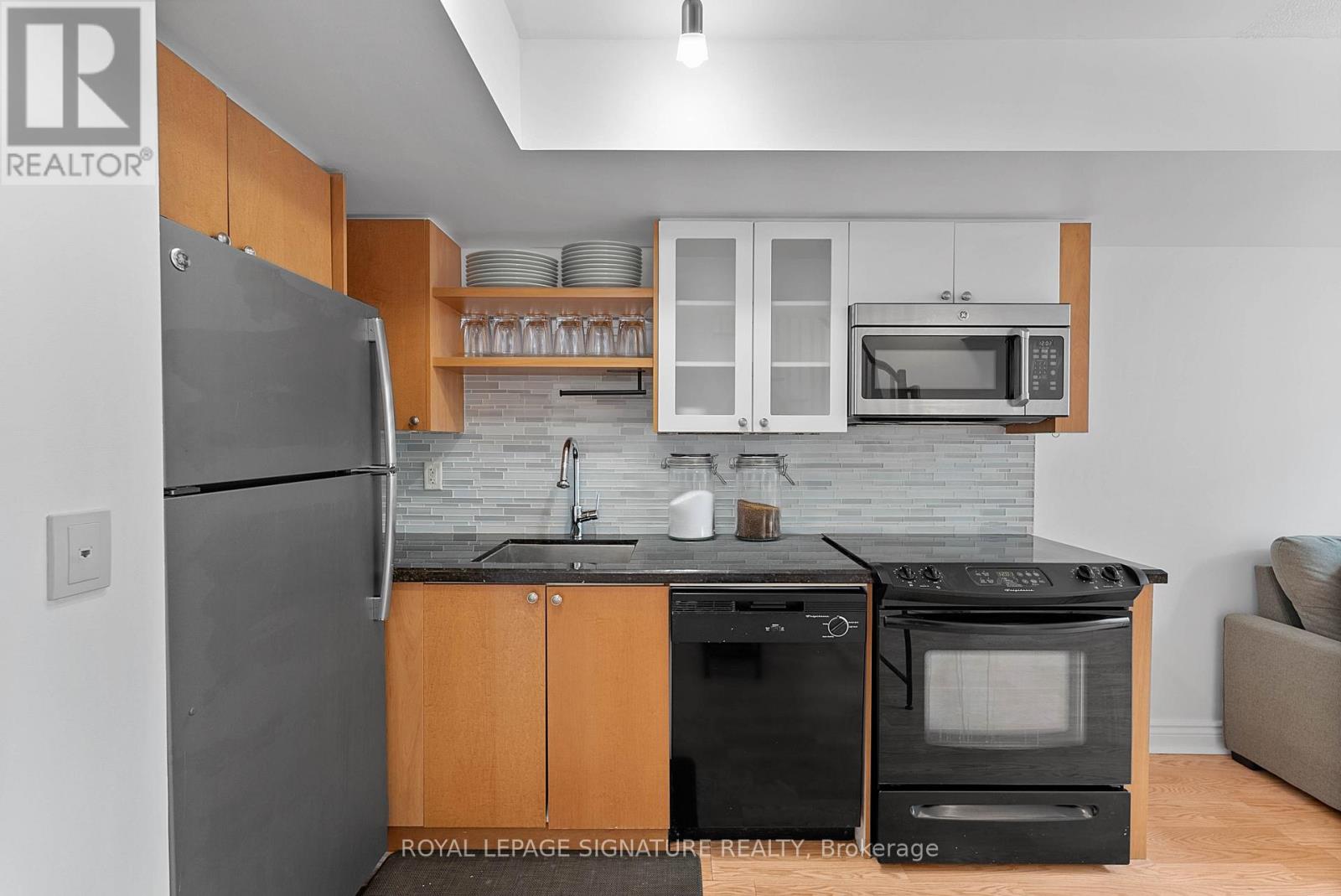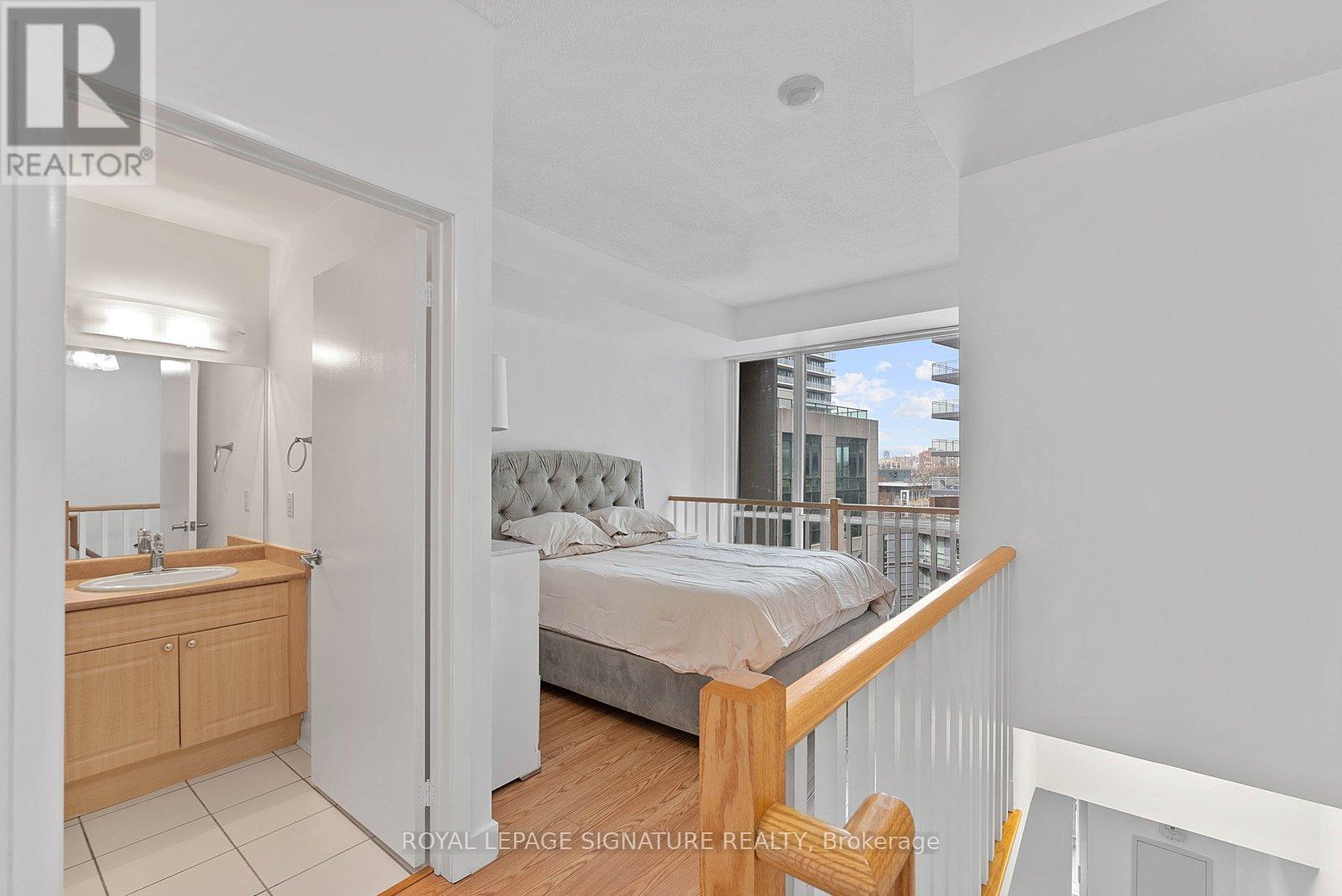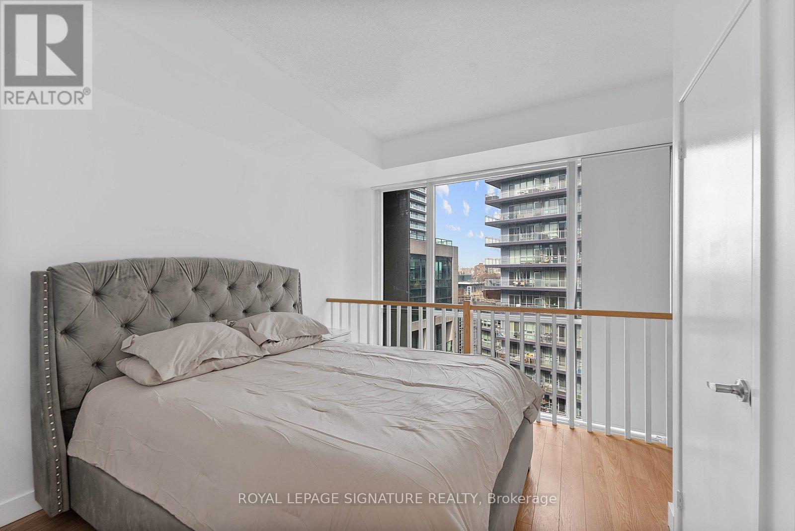 Turn-key and freshly painted, this bright two-storey suite offers a functional layout and exceptional natural light. The kitchen is generously sized and overlooking the living room, creating an open and connected main living space . The living room features a walk-out to the balcony and dramatic two-storey, floor-to-ceiling windows that fill the suite with natural light. A convenient 2-piece powder room completes the main level. Upstairs, the spacious bedroom includes in-suite laundry and a private ensuite bath, offering a comfortable and practical retreat. Ideally located close to everyday amenities, with Loblaws across the street and the Fleet streetcar at your doorstep. Enjoy being minutes from the waterfront and green space at Coronation Park. Parking and locker included. (id:43681)