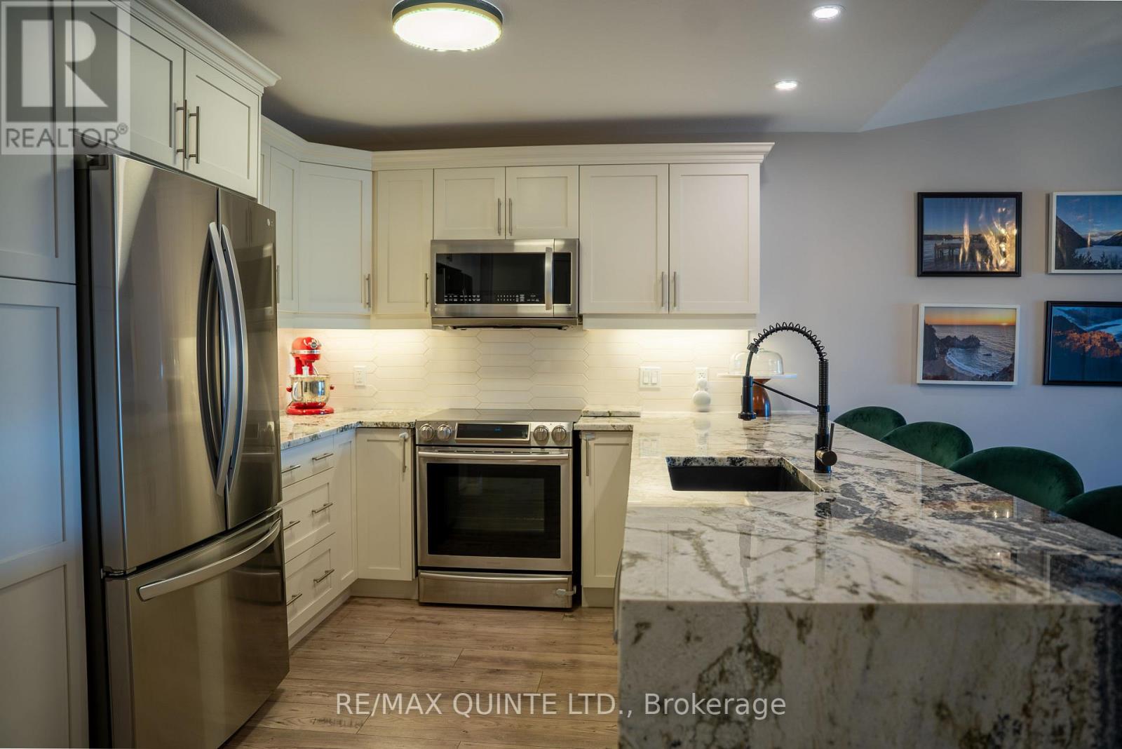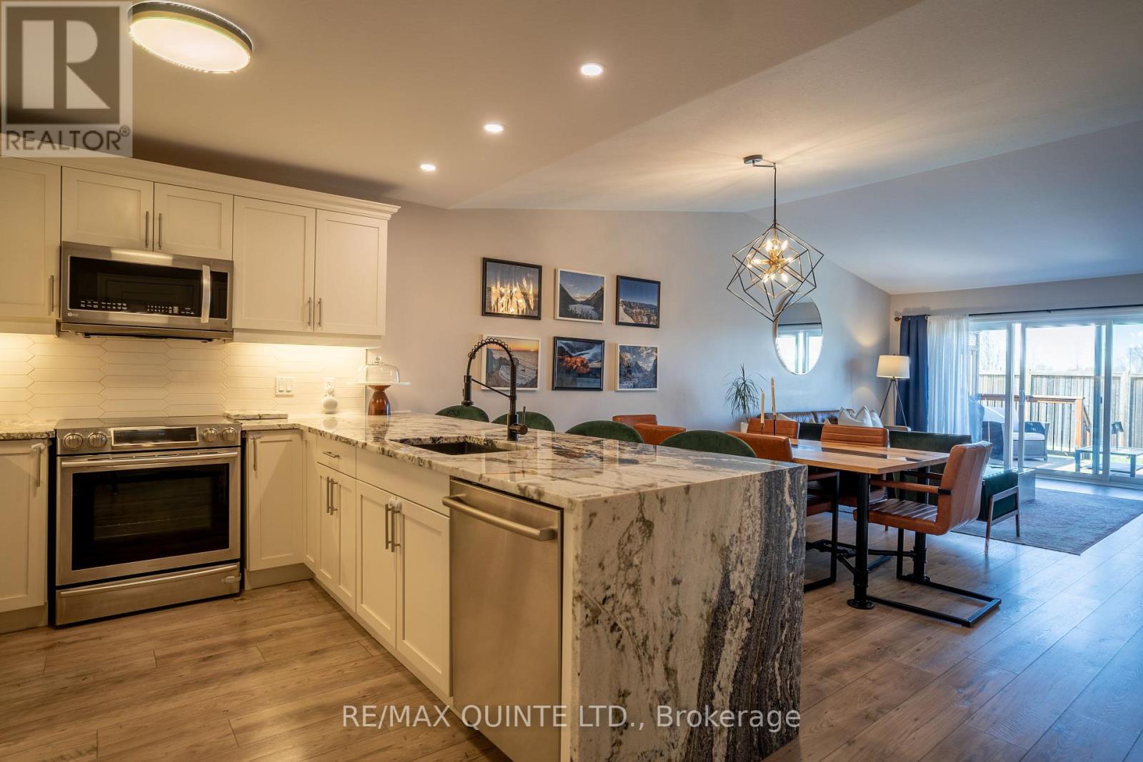 Built in 2018, this freehold Hilden Homes townhouse in Belleville's desirable east end offers stylish, low-maintenance living with a carpet-free main level. The bright, open-concept design is highlighted by cathedral ceilings spanning the living and dining areas, seamlessly connecting to a beautifully updated kitchen featuring a modern backsplash and elegant waterfall quartzite countertop. The main floor primary bedroom includes a well-appointed 3-piece ensuite and a walk-in closet with fixed shelving. A second bedroom provides flexibility for family, guests or great office space. Completing the main level is a 4-piece bathroom and a convenient laundry room. The full, unfinished basement offers excellent potential, complete with a rough-in for a future bathroom, perfect for an additional bedroom, family room, or customized living space to suit your needs. Enjoy outdoor living with a private deck featuring a natural gas BBQ hookup, and a fully landscaped front and backyard patio. Additional highlights include an attached insulated single-car garage and a paved driveway. Located in a great neighbourhood close to schools, shopping, and the beautiful Bay of Quinte! (id:43681)