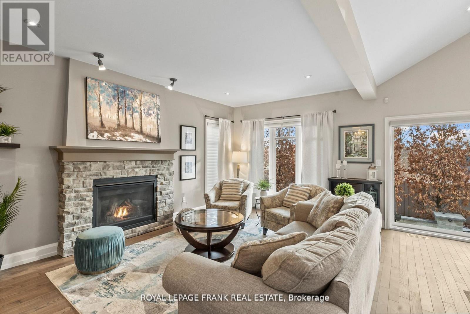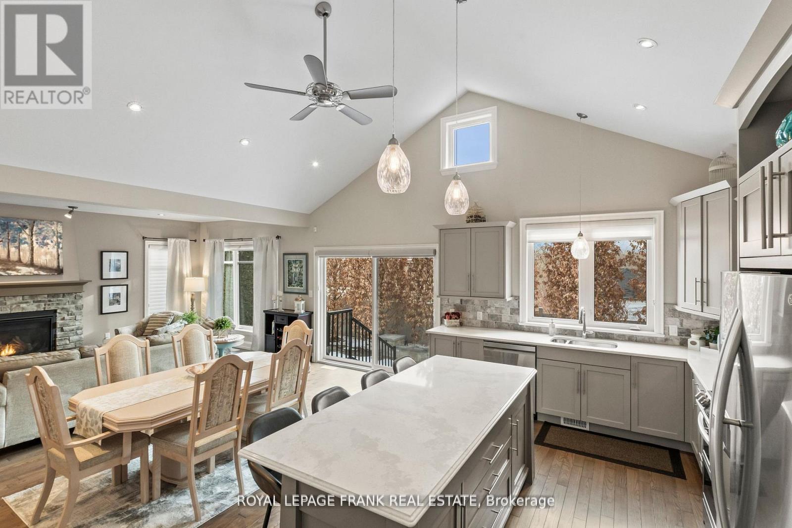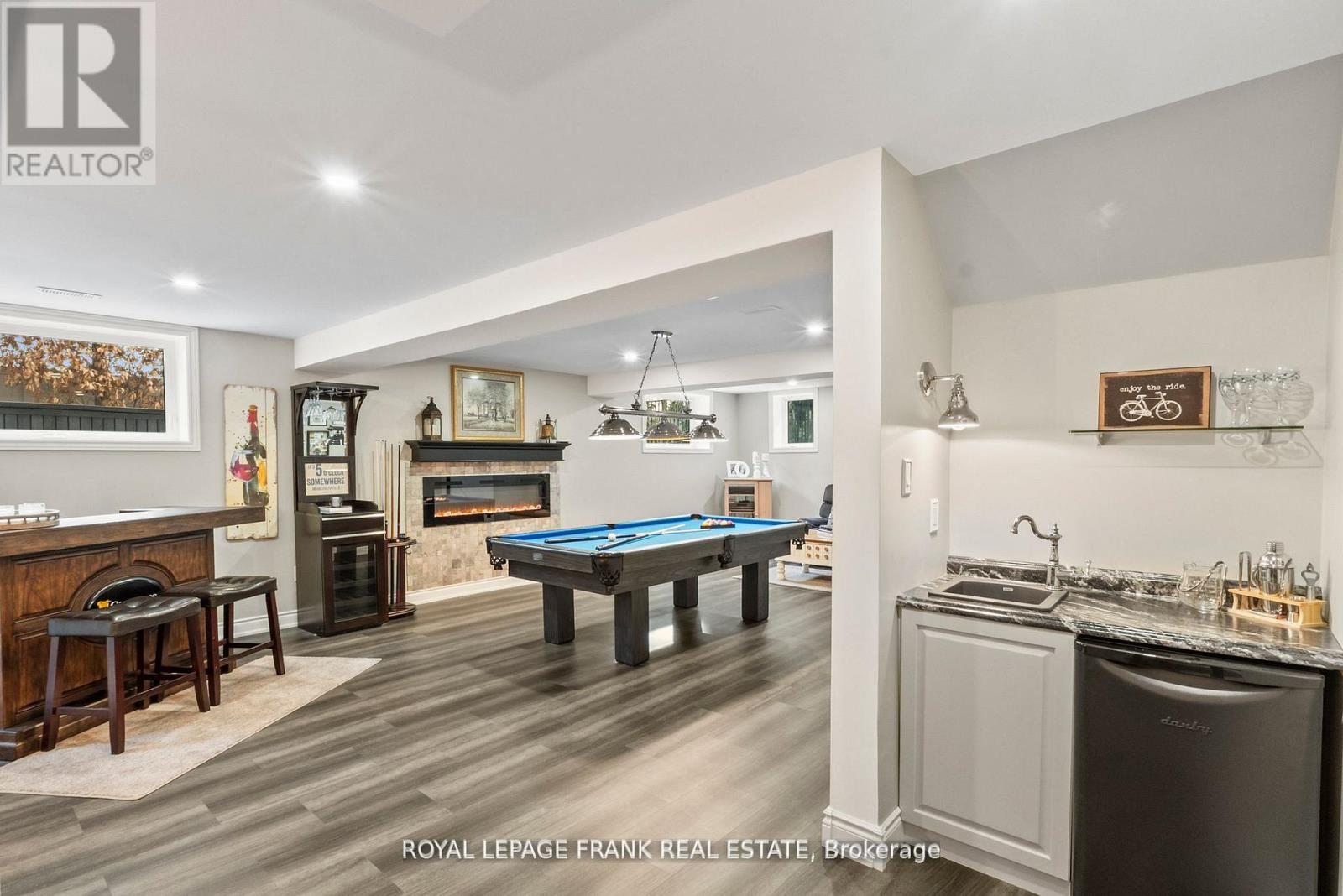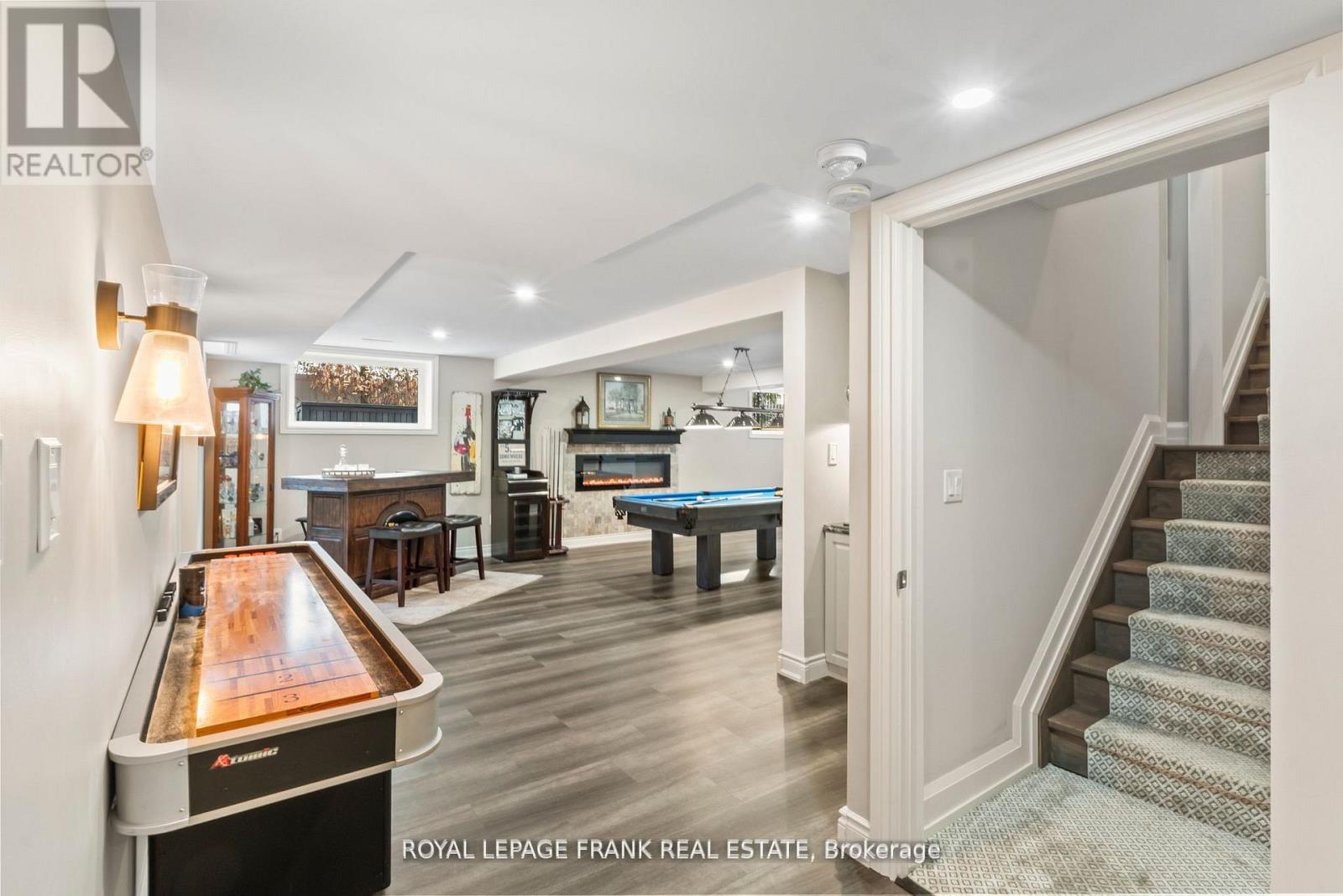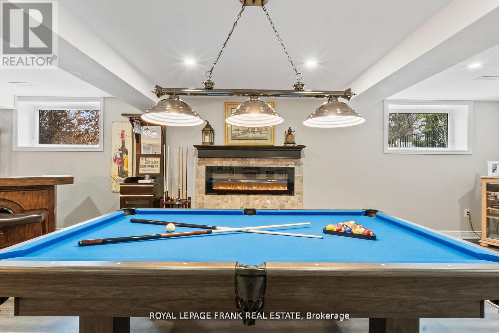 Shows Like a Model Home! Inspired Custom Bungalow - Ideal for Families & Multigenerational Living. Exceptional custom bungalow showcasing high-end finishes and impeccable pride of ownership. Bright, open-concept layout with designer kitchen featuring cathedral ceilings, quartz countertops, centre island, and ample storage-open to a spacious dining area ideal for entertaining. Elegant great room with hardwood floors and cultured stone gas fireplace. Walk out through 8-ft custom doors to a private backyard oasis. The primary suite is a luxurious retreat, complete with a custom finished spacious walk-in closet and spa-like 5-piece ensuite bath featuring freestanding tub and separate glass shower. Professionally finished lower level with vinyl plank flooring and large above-grade windows offering abundant natural light. Includes 2 additional bedrooms, expansive games room with fireplace, recreation room, and custom 3-piece bath-perfect for extended family or guests. Over $100K invested in premium exterior upgrades including stone driveway, walkways, patios, and wrought iron fencing-delivering exceptional curb appeal and outdoor living. A rare opportunity offering style, space, and versatility-shows to perfection! (id:43681)