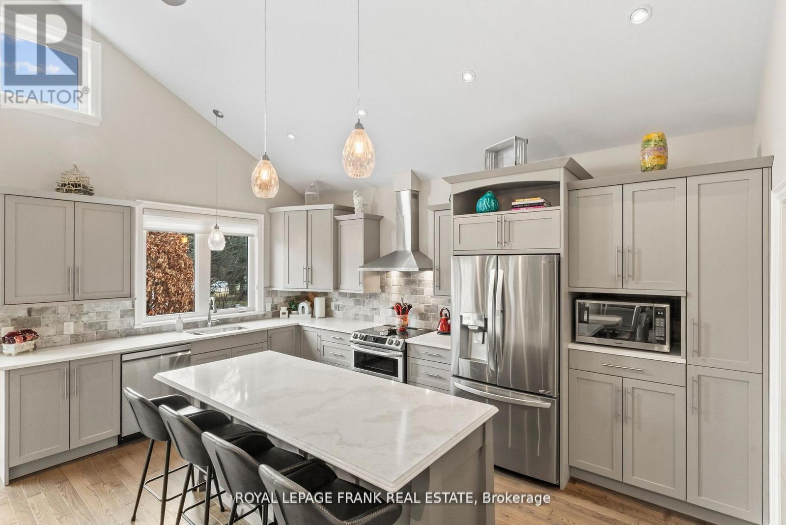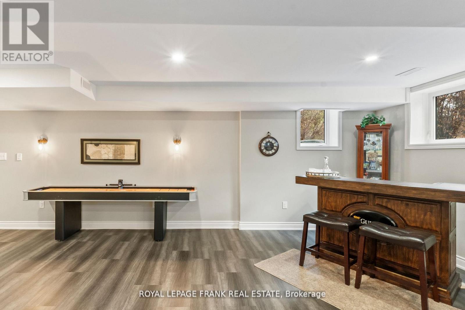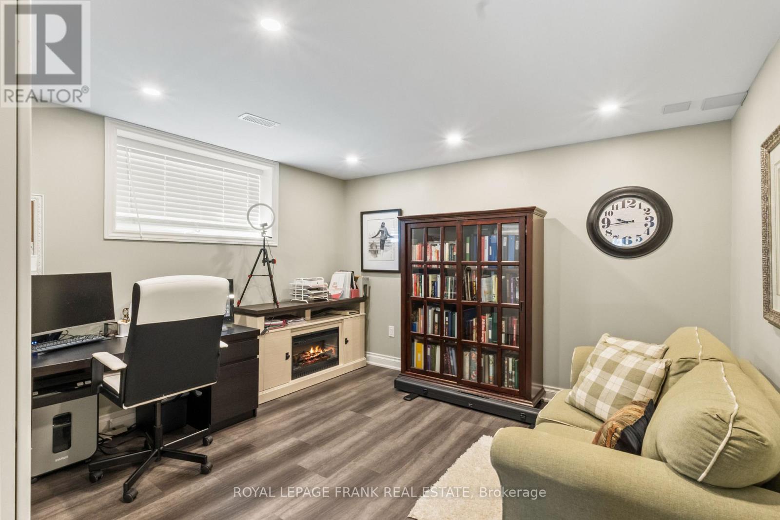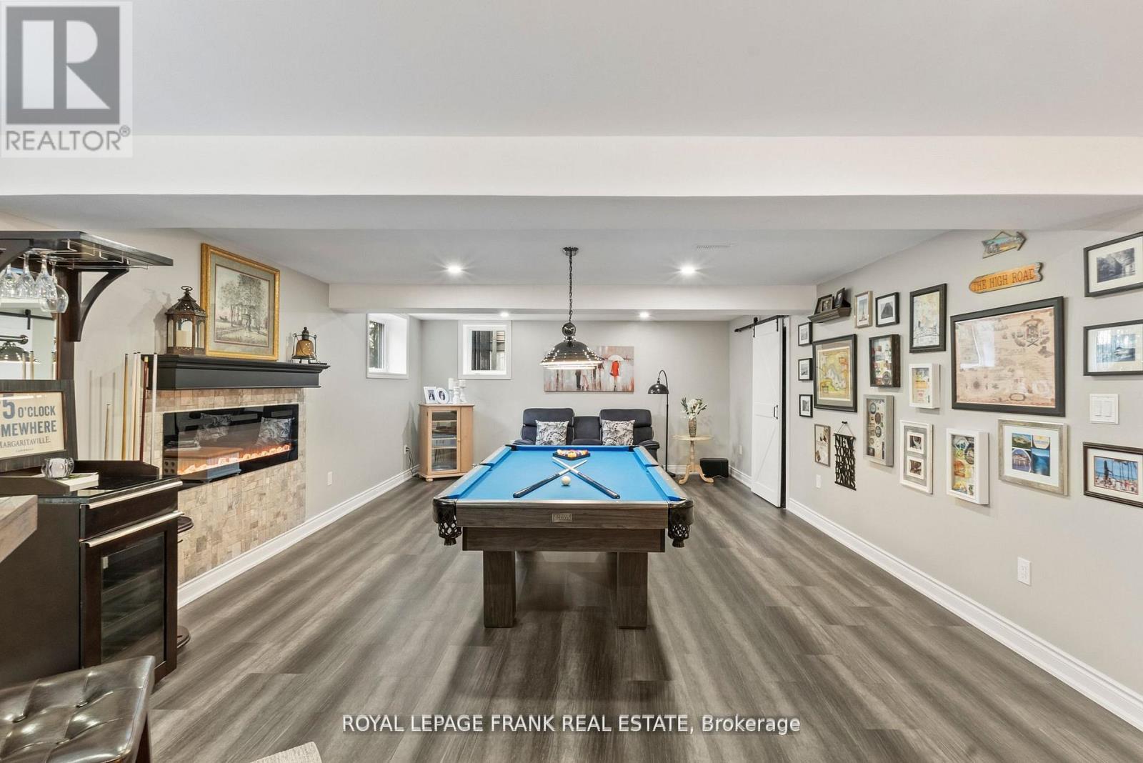 Shows Like a Model Home! Inspired Custom Bungalow - Ideal for Families & Multigenerational Living. Exceptional custom bungalow showcasing high-end finishes and impeccable pride of ownership. Bright, open-concept layout with designer kitchen featuring cathedral ceilings, quartz countertops, centre island, and ample storage-open to a spacious dining area ideal for entertaining. Elegant great room with hardwood floors and cultured stone gas fireplace. Walk out through 8-ft custom doors to a private backyard oasis. The primary suite is a luxurious retreat, complete with a custom finished spacious walk-in closet and spa-like 5-piece ensuite bath featuring freestanding tub and separate glass shower. Professionally finished lower level with vinyl plank flooring and large above-grade windows offering abundant natural light. Includes 2 additional bedrooms, expansive games room with fireplace, recreation room, and custom 3-piece bath-perfect for extended family or guests. Over $100K invested in premium exterior upgrades including stone driveway, walkways, patios, and wrought iron fencing-delivering exceptional curb appeal and outdoor living. A rare opportunity offering style, space, and versatility-shows to perfection! (id:43681)