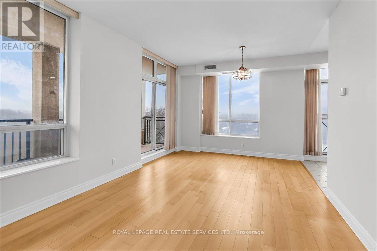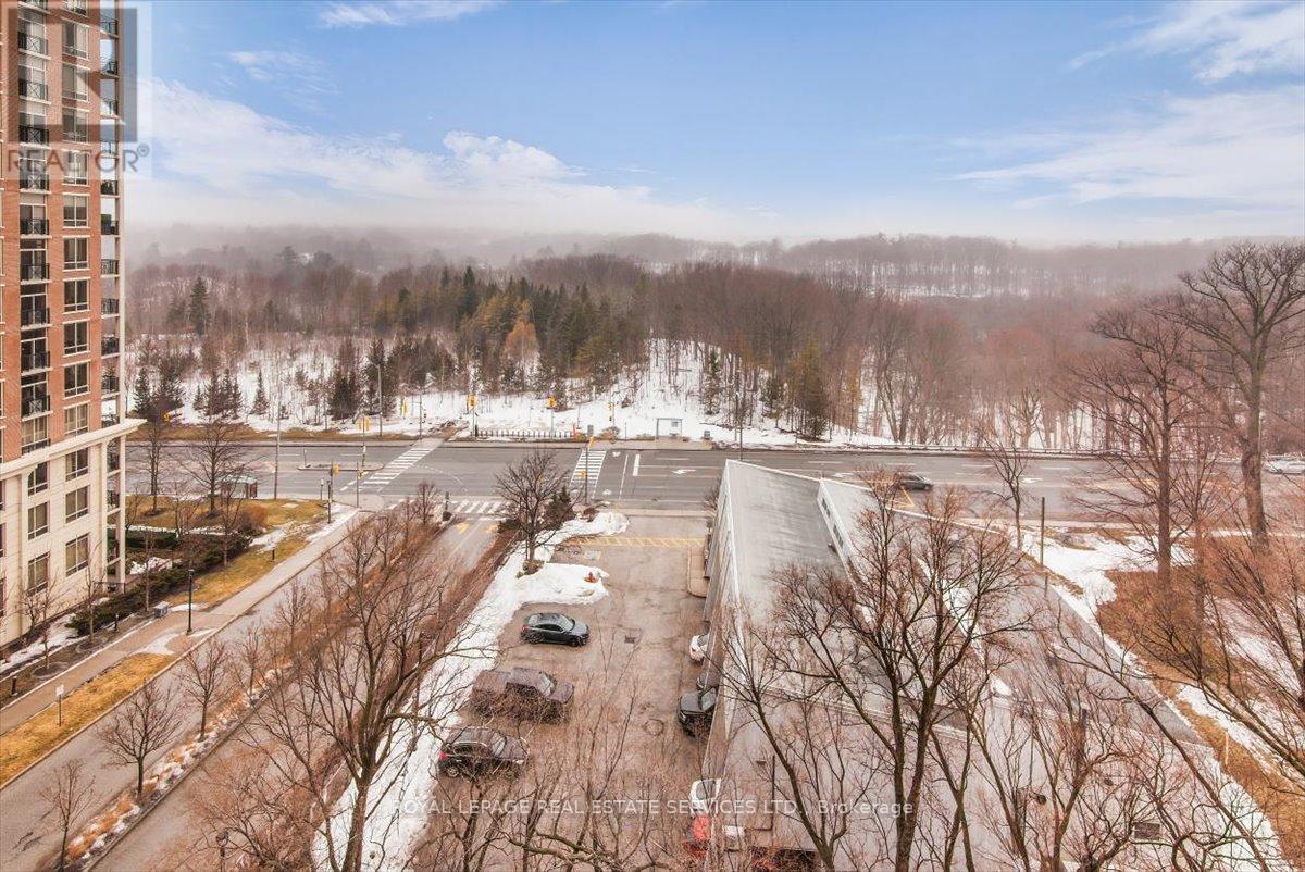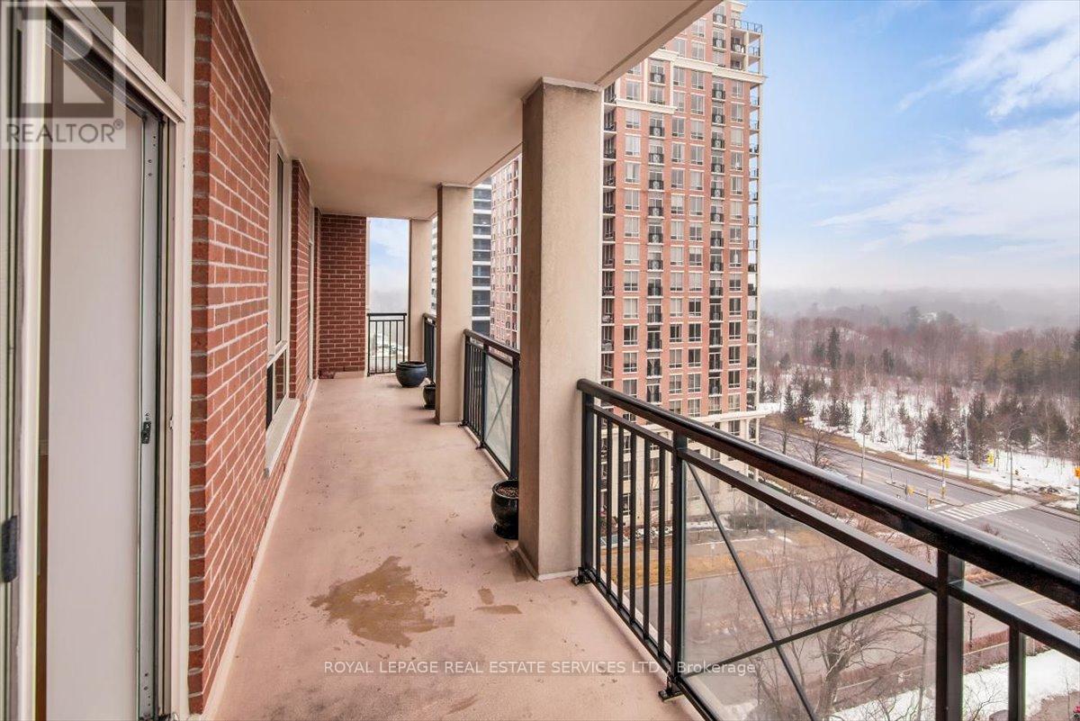 Welcome to Suite 906 at 1105 Leslie Street, a spacious and well-designed condominium offering approximately 1,350 square feet of comfortable living space in a peaceful North York setting. Ideally located near the Don Valley Parkway, this address provides quick access to downtown Toronto while being surrounded by green space, parks, and the scenic Don Valley trail system. Residents also enjoy convenient access to the Shops at Don Mills, grocery stores, cafés, and public transit. Inside, the suite offers a thoughtfully planned layout that balances generous living areas with comfortable private spaces. The expansive living and dining room is filled with natural light from large windows and provides walk-out access to an impressive 30-foot balcony, a wonderful extension of the living space and ideal for relaxing or entertaining while enjoying open treetop views. The kitchen is designed in a practical galley style with granite countertops, ample cabinetry, tile flooring, and full-size appliances, providing excellent storage and workspace. The adjacent dining area sits beside large windows and balcony access, creating a bright and inviting space for everyday meals. Two well-proportioned bedrooms provide comfortable retreats within the home. The primary bedroom offers generous proportions, broadloom flooring, a walk-in closet, and a spacious ensuite bathroom with double vanity and glass-enclosed shower. The second bedroom also includes broadloom and a large window bringing in natural light. A separate den enclosed with French doors and finished with laminate flooring provides excellent flexibility as a home office, study, or reading room. Additional conveniences include a second full bathroom with double vanity, in-suite laundry, and generous storage throughout. Residents enjoy a range of building amenities designed for both convenience and recreation, including concierge, gym, sauna, theater room, party & games room, hobby room and beautifully landscaped grounds. (id:43681)
