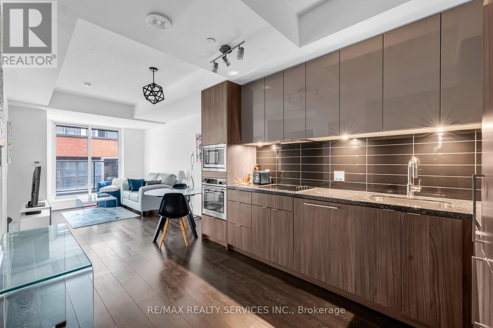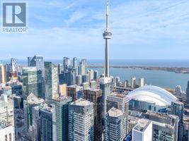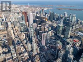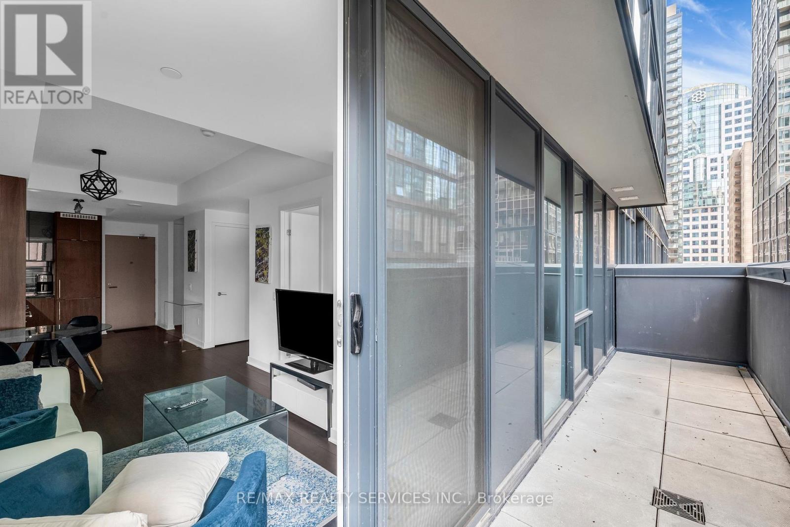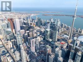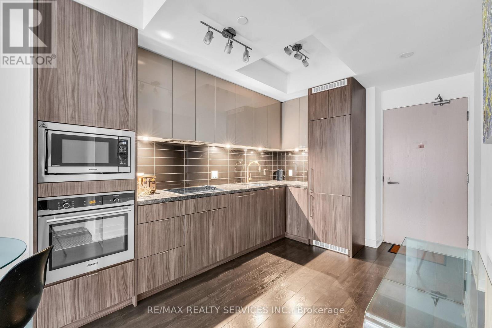 Welcome to King Blue Condos! Enjoy a great lifestyle in Toronto's Entertainment District. Over600 square feet, one bed and a proper den, which can be used as a home office or even as a guest bedroom. Laminate flooring throughout. Kitchen is equipped with modern built-in appliances and quartz counter. High ceilings in living and dining that opens to a large balcony with south views of Toronto skyline. Primary bedroom has large windows and a large closet. (id:43681)