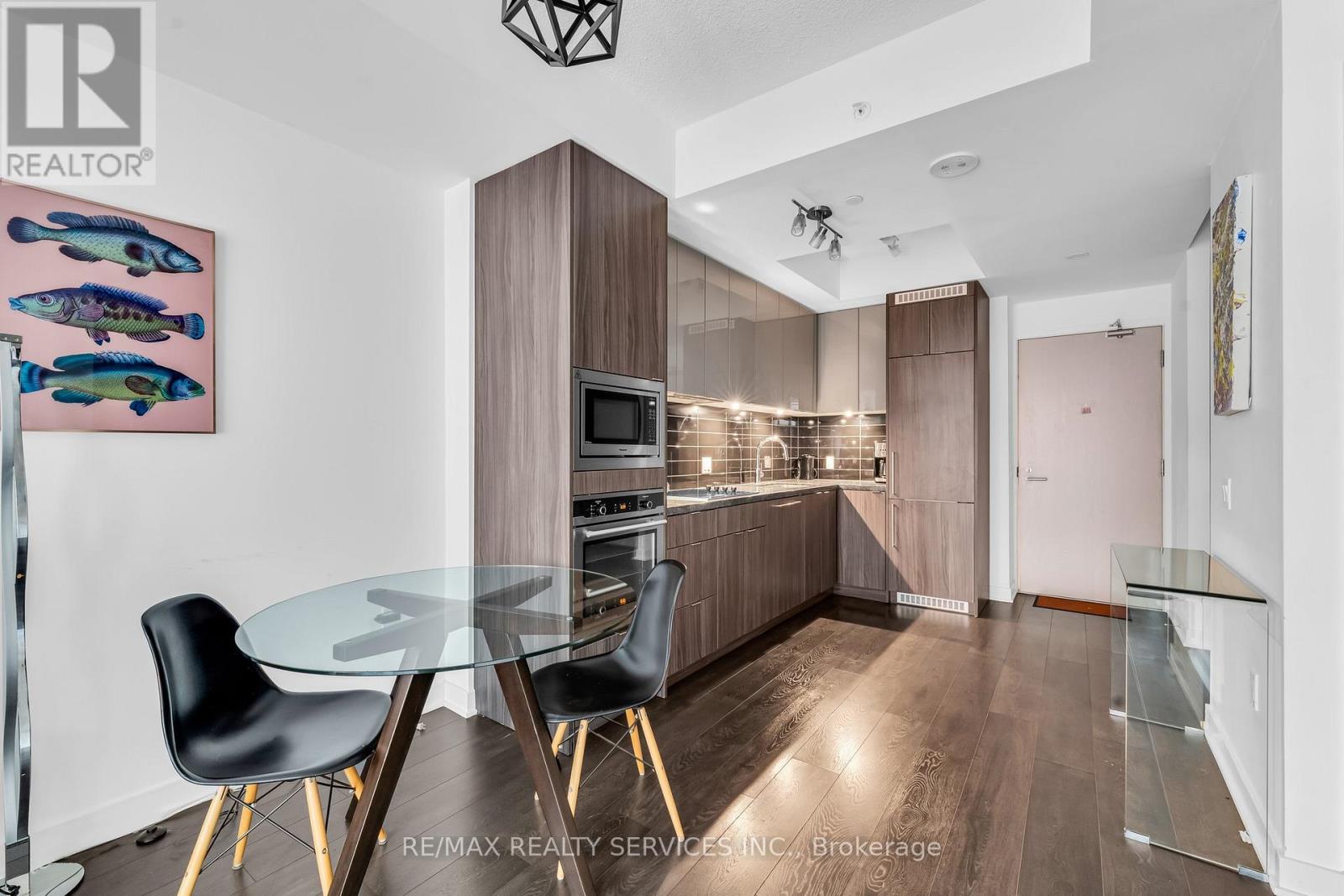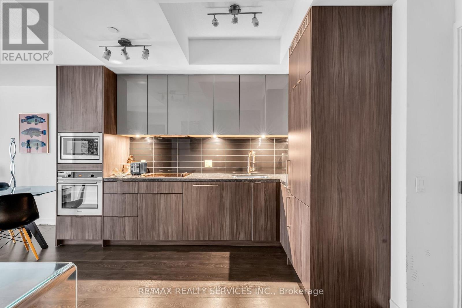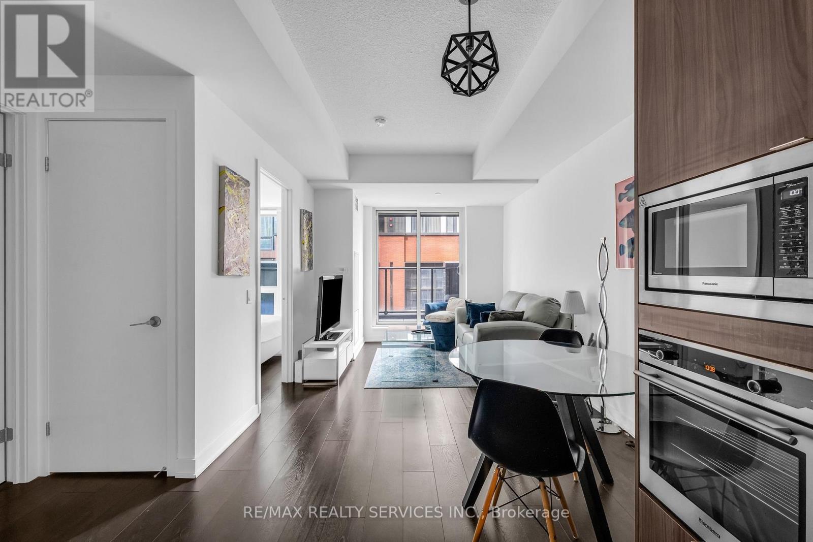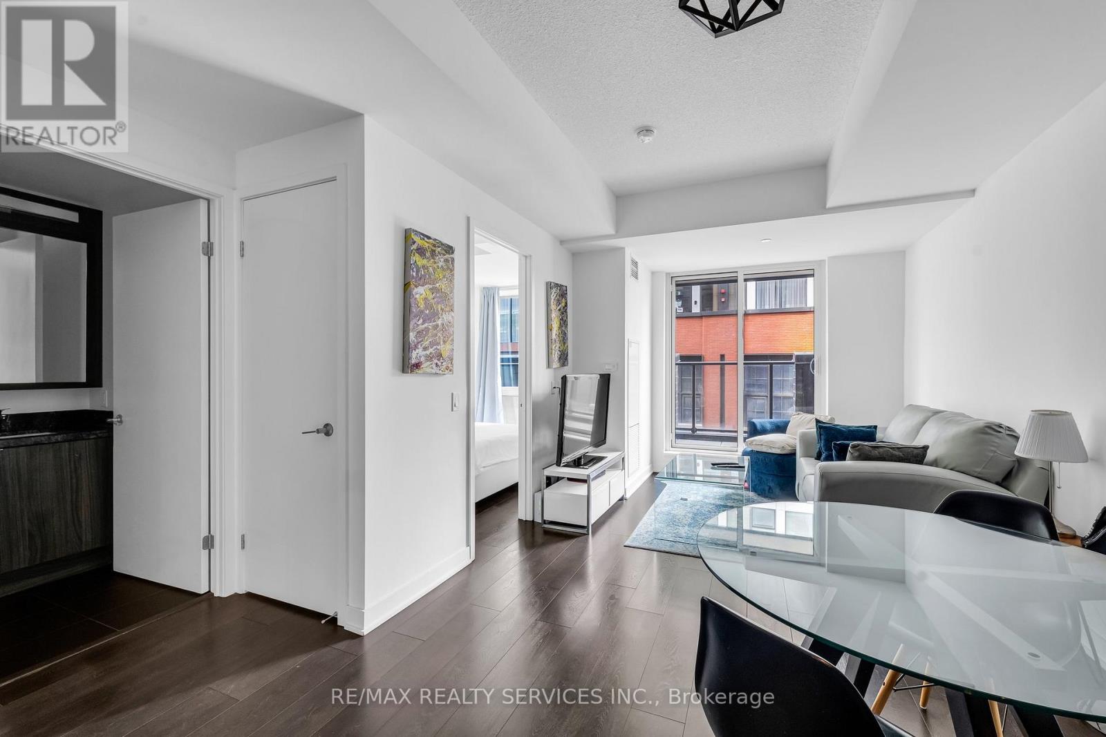 Welcome to King Blue Condos! Enjoy a great lifestyle in Toronto's Entertainment District. Over600 square feet, one bed and a proper den, which can be used as a home office or even as a guest bedroom. Laminate flooring throughout. Kitchen is equipped with modern built-in appliances and quartz counter. High ceilings in living and dining that opens to a large balcony with south views of Toronto skyline. Primary bedroom has large windows and a large closet. (id:43681)