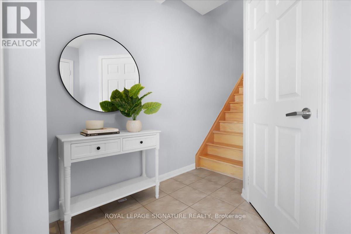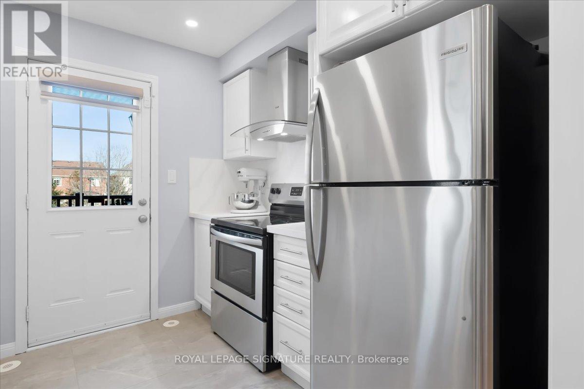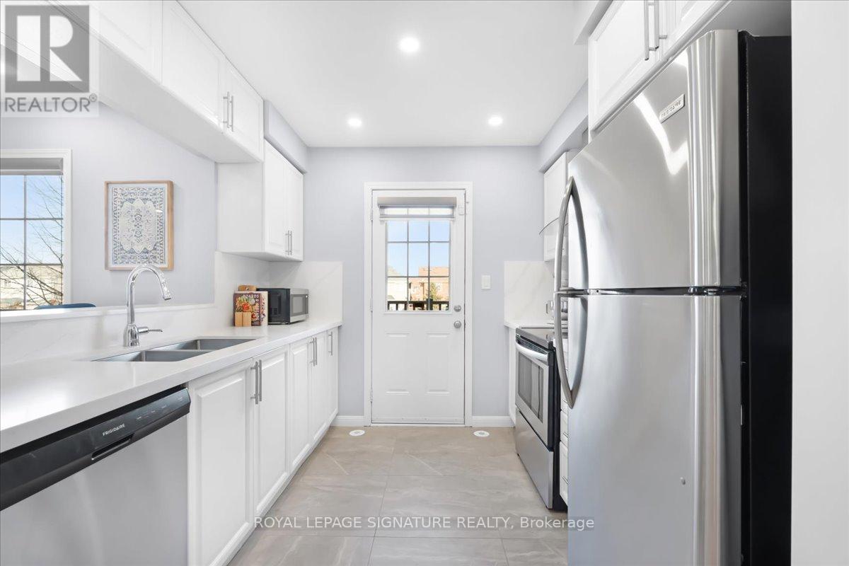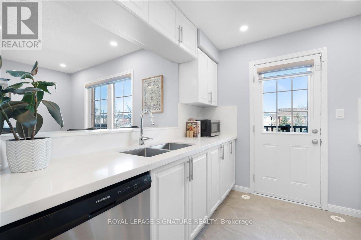 Welcome to this beautifully updated freehold townhome offering the perfect blend of style, function, and location. With over 900 square feet of thoughtfully designed living space, this home is an ideal condo alternative - without the monthly maintenance fees. Featuring 2 spacious bedrooms and 2 fully renovated modern bathrooms, this home has been tastefully updated throughout. The sleek, modern kitchen showcases contemporary finishes, ample cabinetry, and an eat-in breakfast bar that seamlessly connects to the open-concept dining and family room - perfect for entertaining or everyday living. Step out onto your private balcony and enjoy one of this home's most unique features: unobstructed views overlooking scenic trails. Enjoy your morning coffee or evening meal in peaceful privacy - no direct views into neighbouring townhomes, making this a premium unit. Additional highlights include; attached 1-car garage, 2 additional driveway parking spaces, Functional, efficient layout ideal for first-time buyers, downsizers, or investors, Freehold ownership with no condo fees! This is low-maintenance living without compromise - modern updates, generous parking, and a rare setting fronting onto trails, all in one exceptional package. (id:43681)