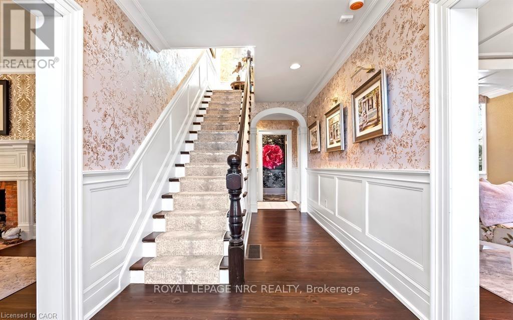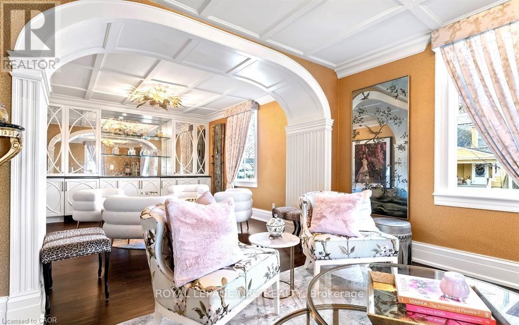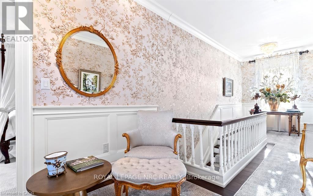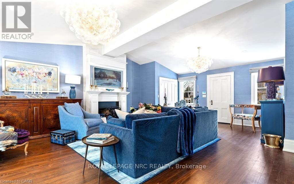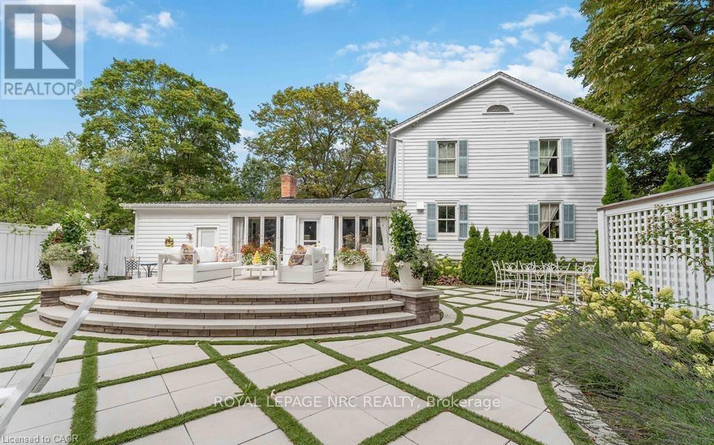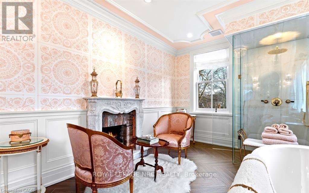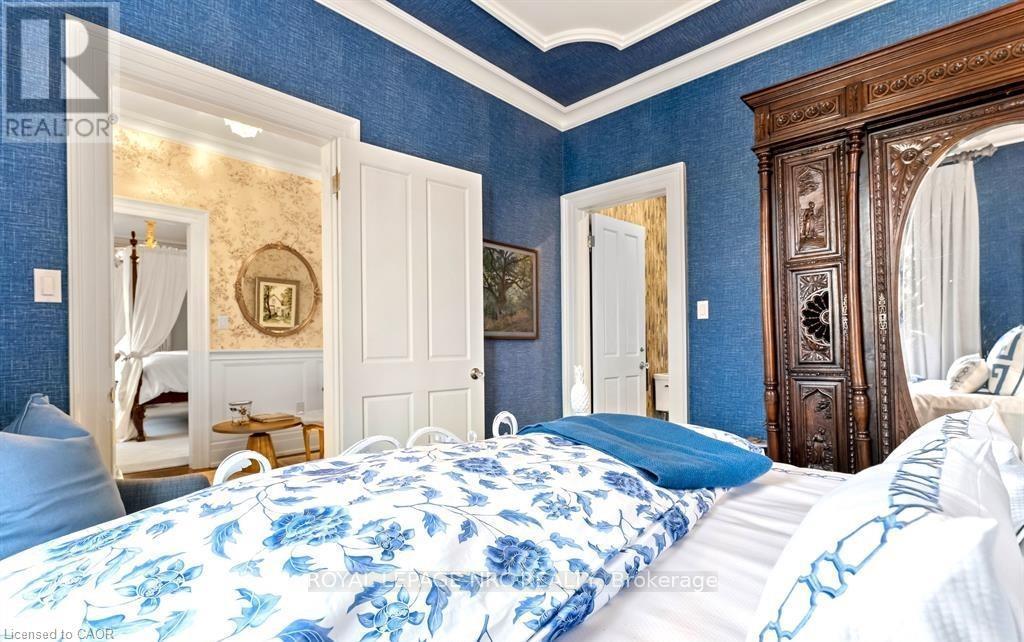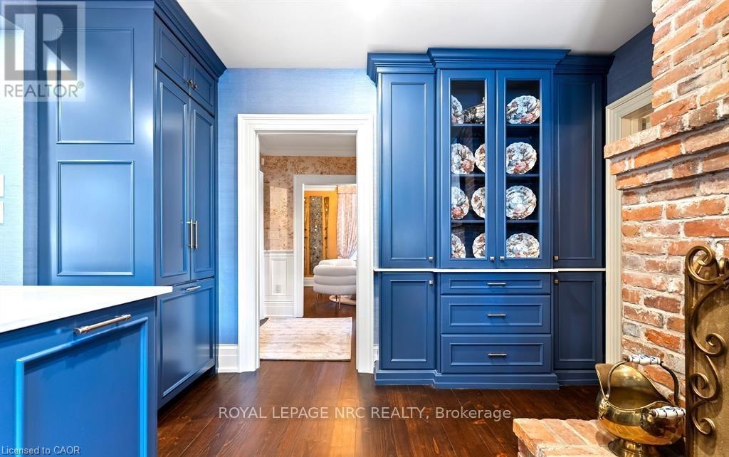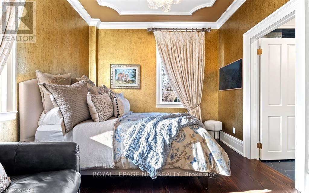 Located in one of the most desirable areas of Old Town, beautiful marriage of old-world charm and modern upgrades. Walk to iconic Queen St. with its boutiques, restaurants and theatres or take a short stroll to the waterfront. Enjoy the serenity of Queen's Royal Park or play a round of golf at Canada's oldest golf course. This home showcases stunning decor such as designer light fixtures, custom drapes, valances and luxurious wall coverings. Enter through the antique door into the elegant front entry with gleaming hardwood floors throughout. The formal dining room is sheer opulence with its antique chandelier set in a plaster ceiling medallion, decorative built-in shelving and fireplace with hand-crafted mantle. The grand living room features a beautiful archway with custom millwork set between coffered ceilings with designer brass fixtures, built-in bookcase and buffet with accent mirrored wall. Bright and airy, the kitchen is definitely the heart of the home with 5 stainless steel appliances, center island, quartz countertops, Nantucket grey cabinetry, heated floors and cozy fireplace. Spacious family room with its comfortable seating centered around a fireplace with hand-crafted mantle and soaring vaulted ceiling with contemporary bubble chandeliers. A gorgeous sunken sunroom which offers floor-to-ceiling windows and 4 skylights overlooking the jaw-dropping two-tiered yard. Main floor guest retreat with ensuite. The Grand Victorian staircase features designer runner and custom wainscotting leading to the elegant and spacious landing. Each of the 3 bedrooms have beautiful hardwood flooring, the Primary bedroom with private water closet and spa-like ensuite bath with heated herringbone tile, sumptuous soaker tub, walk-in glass rain shower. Second and third bedrooms share a bath with heated marble flooring and custom vanity. A cozy rec-room and 2nd kitchen in the lower level completes this charming home. (id:43681)