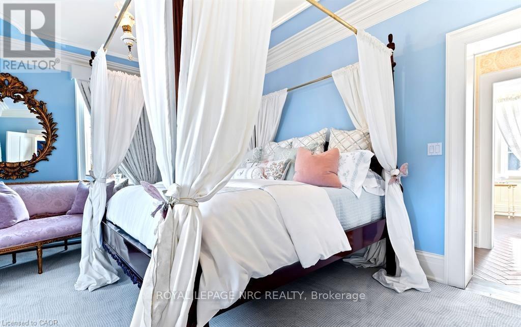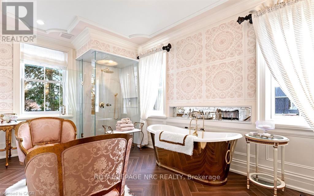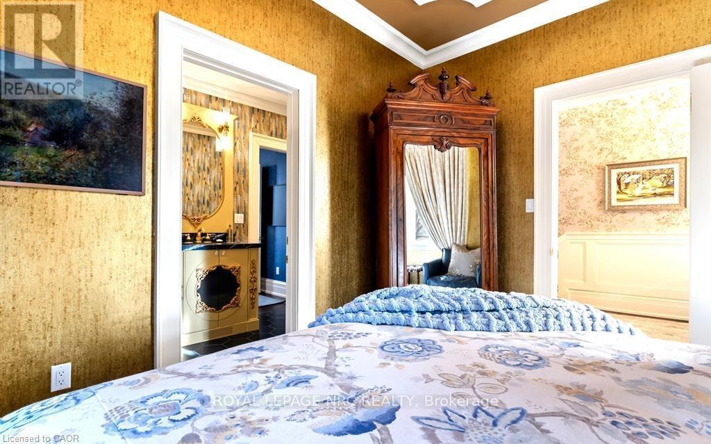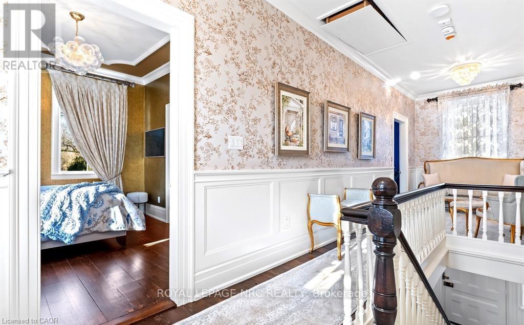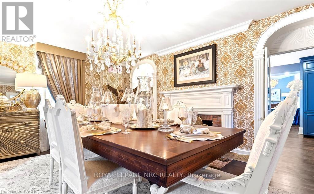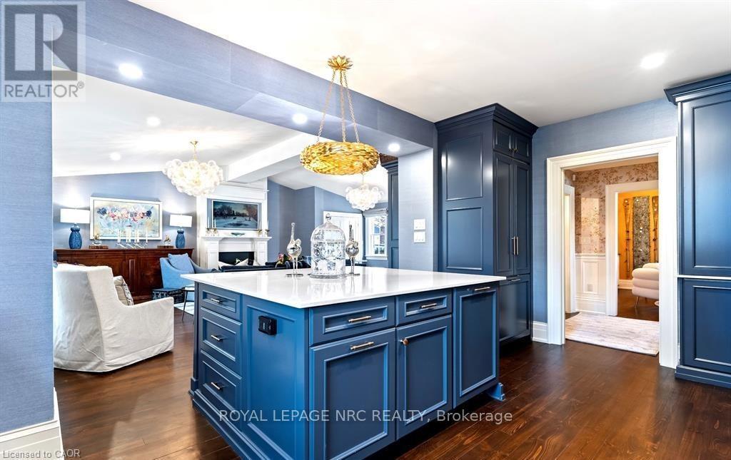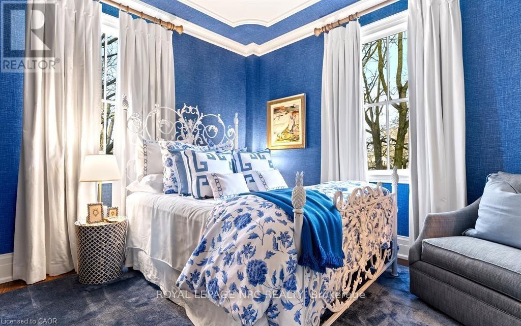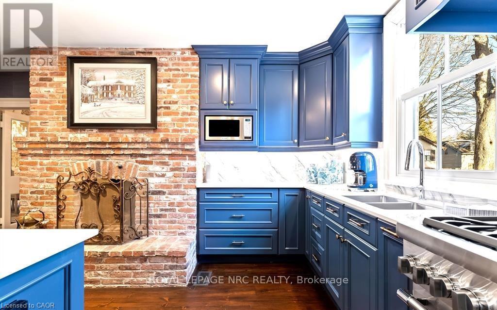 Located in one of the most desirable areas of Old Town, beautiful marriage of old-world charm and modern upgrades. Walk to iconic Queen St. with its boutiques, restaurants and theatres or take a short stroll to the waterfront. Enjoy the serenity of Queen's Royal Park or play a round of golf at Canada's oldest golf course. This home showcases stunning decor such as designer light fixtures, custom drapes, valances and luxurious wall coverings. Enter through the antique door into the elegant front entry with gleaming hardwood floors throughout. The formal dining room is sheer opulence with its antique chandelier set in a plaster ceiling medallion, decorative built-in shelving and fireplace with hand-crafted mantle. The grand living room features a beautiful archway with custom millwork set between coffered ceilings with designer brass fixtures, built-in bookcase and buffet with accent mirrored wall. Bright and airy, the kitchen is definitely the heart of the home with 5 stainless steel appliances, center island, quartz countertops, Nantucket grey cabinetry, heated floors and cozy fireplace. Spacious family room with its comfortable seating centered around a fireplace with hand-crafted mantle and soaring vaulted ceiling with contemporary bubble chandeliers. A gorgeous sunken sunroom which offers floor-to-ceiling windows and 4 skylights overlooking the jaw-dropping two-tiered yard. Main floor guest retreat with ensuite. The Grand Victorian staircase features designer runner and custom wainscotting leading to the elegant and spacious landing. Each of the 3 bedrooms have beautiful hardwood flooring, the Primary bedroom with private water closet and spa-like ensuite bath with heated herringbone tile, sumptuous soaker tub, walk-in glass rain shower. Second and third bedrooms share a bath with heated marble flooring and custom vanity. A cozy rec-room and 2nd kitchen in the lower level completes this charming home. (id:43681)